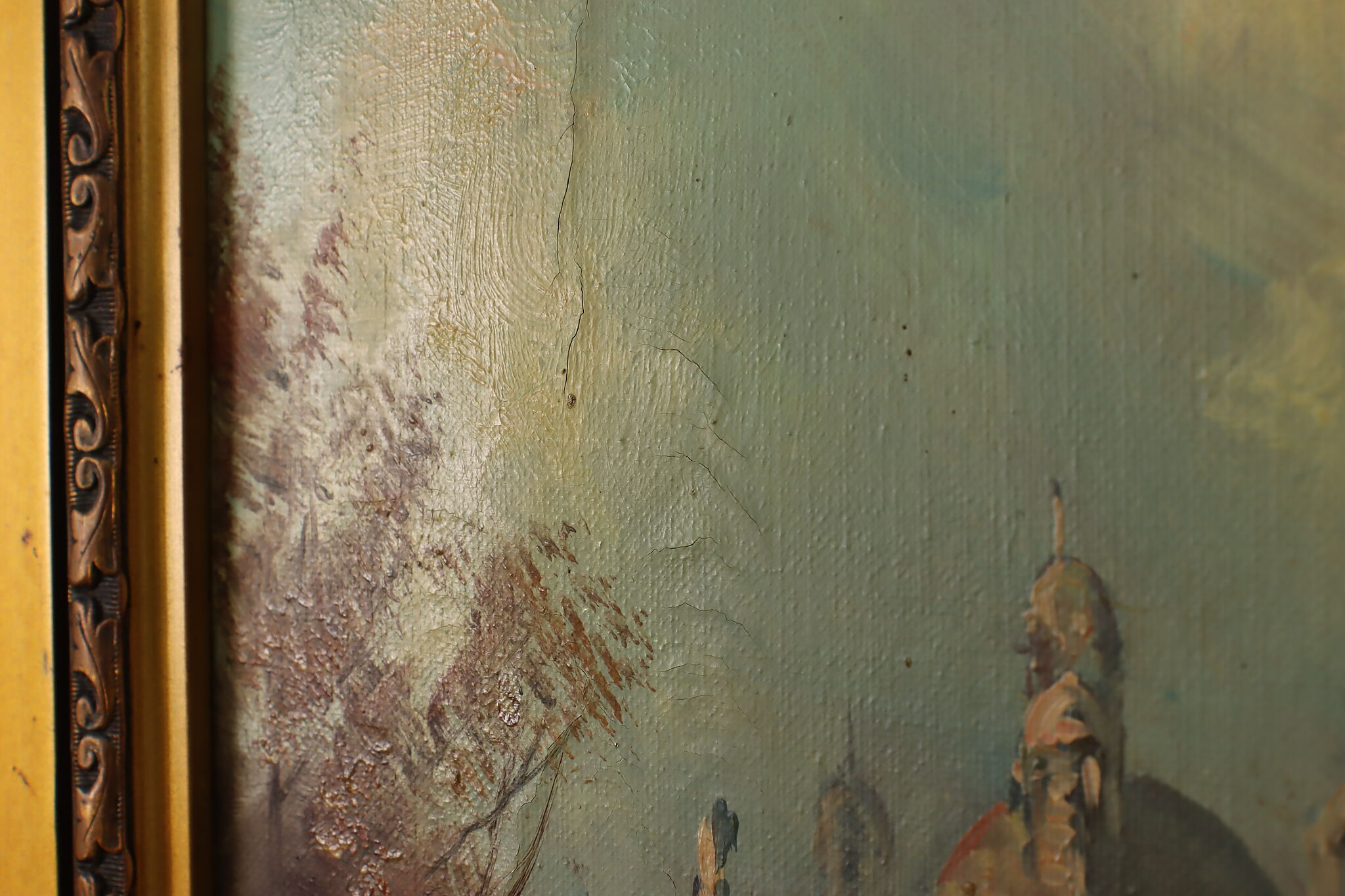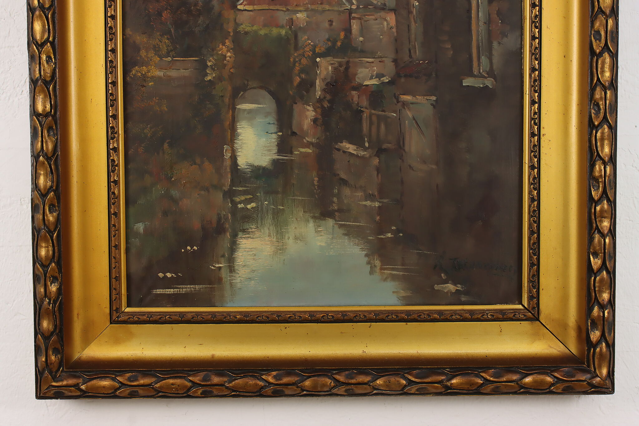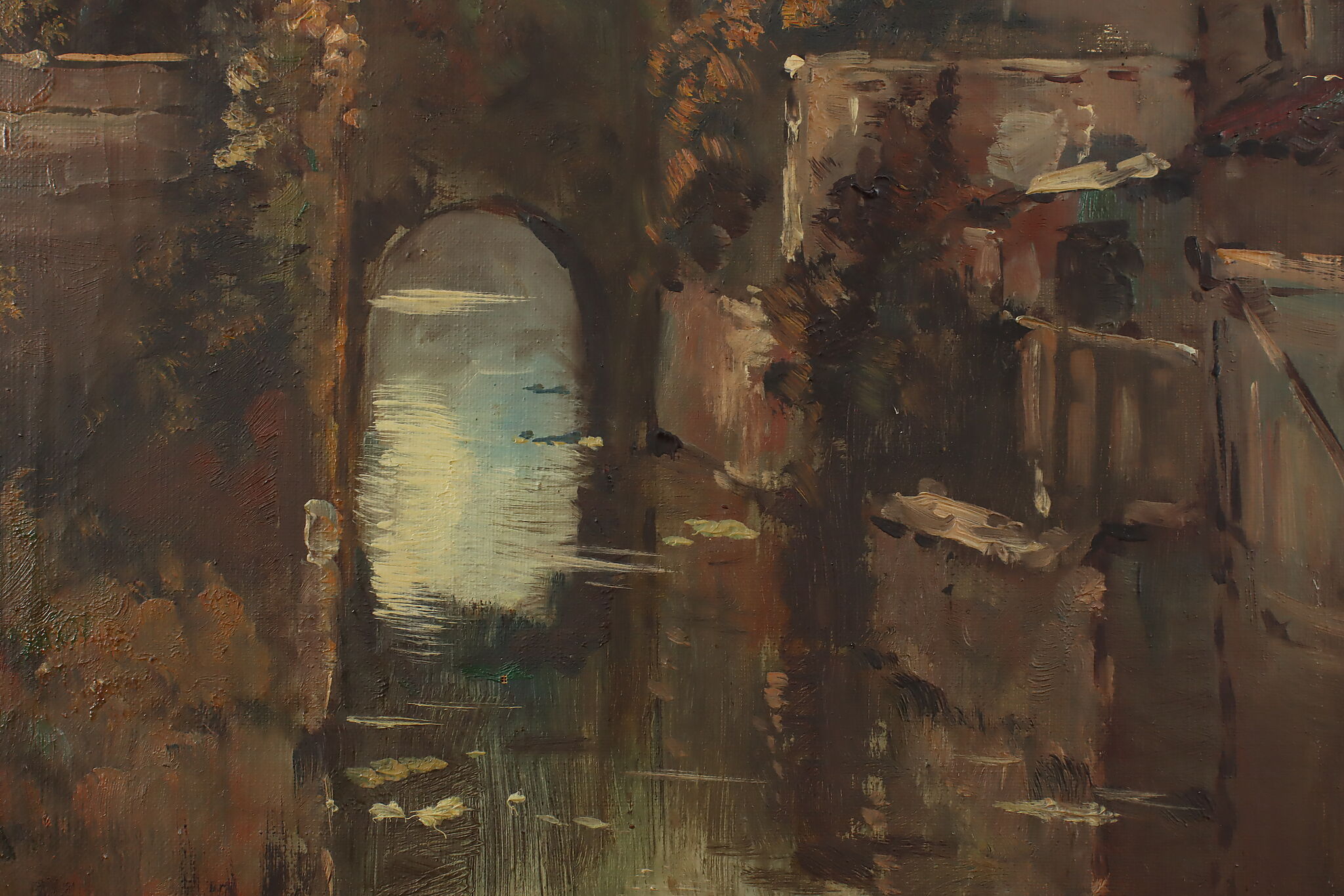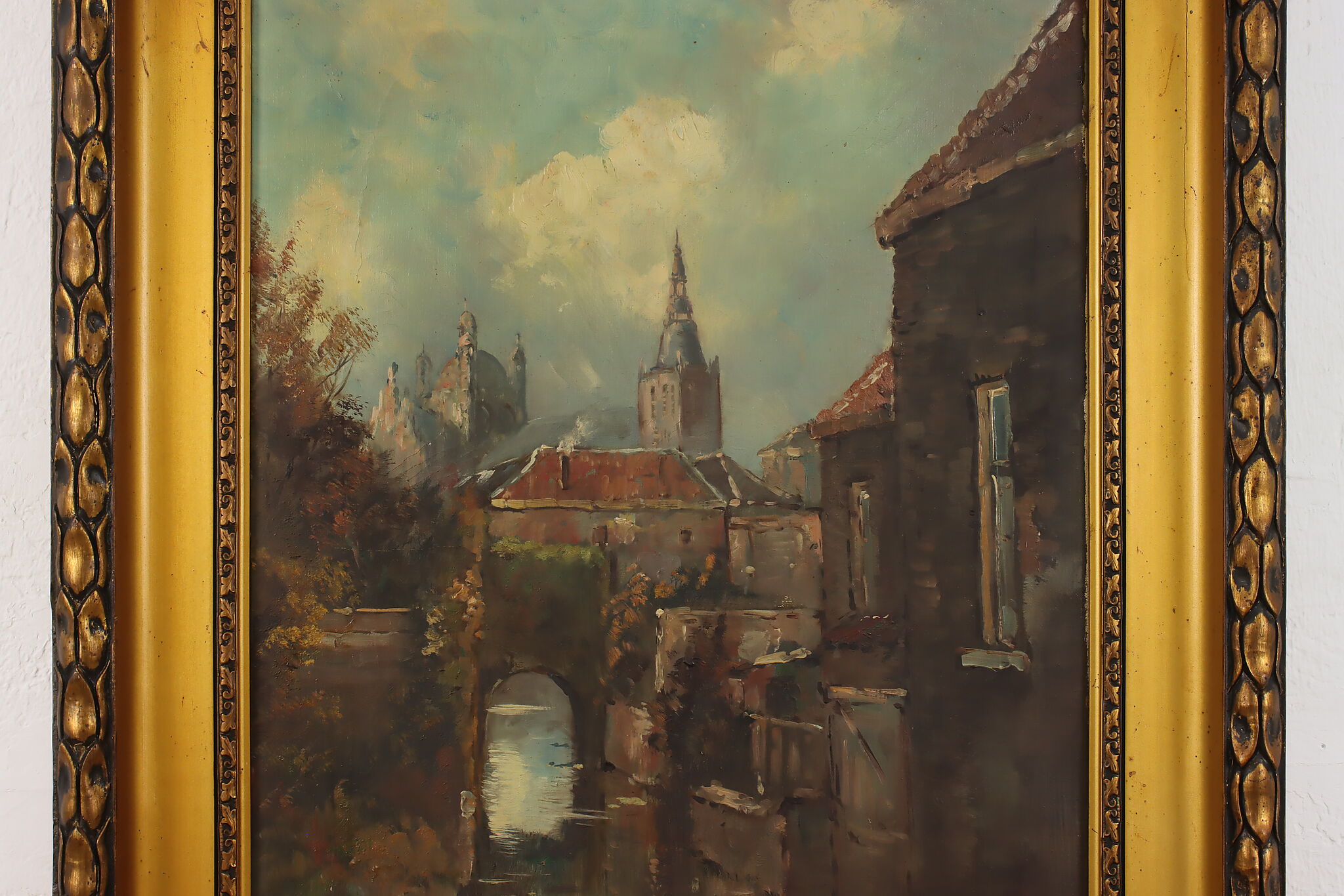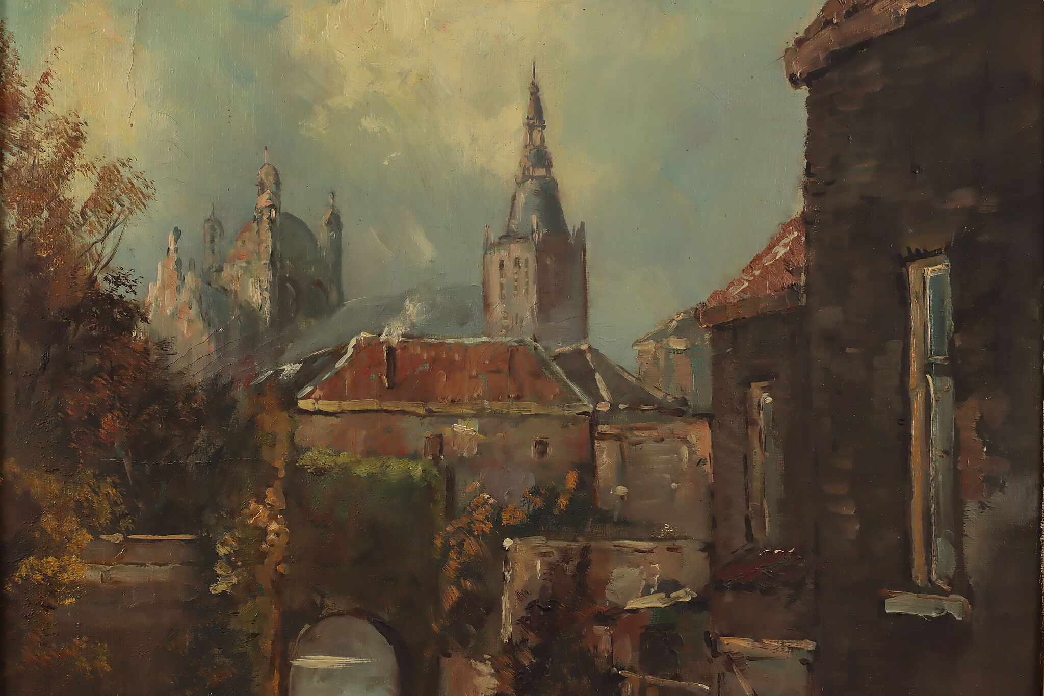 A peaceful canal runs through a European city in this lovely painted cityscape.