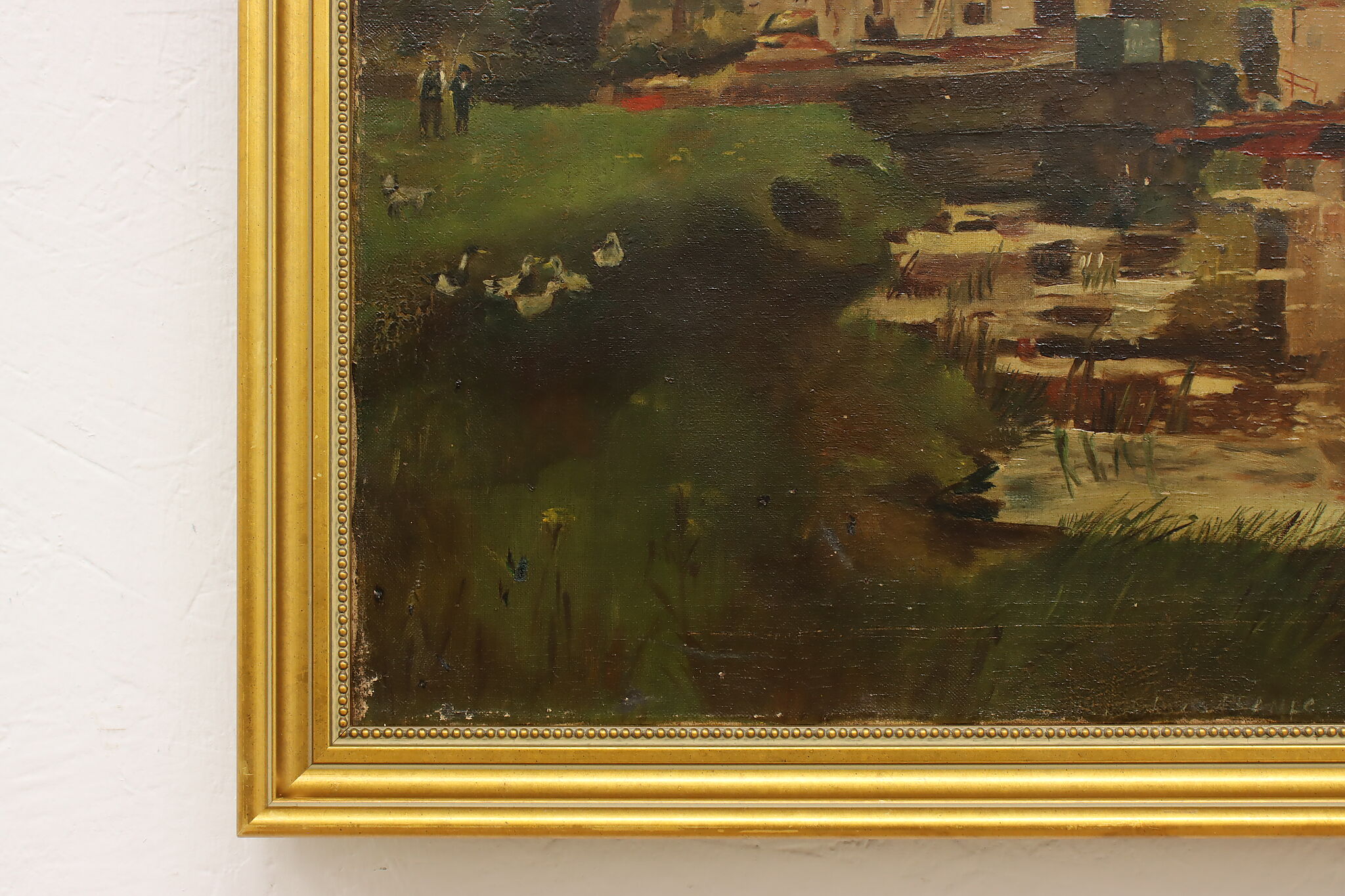 A farmer and his son watch their flock of geese on the outskirts of a European village.