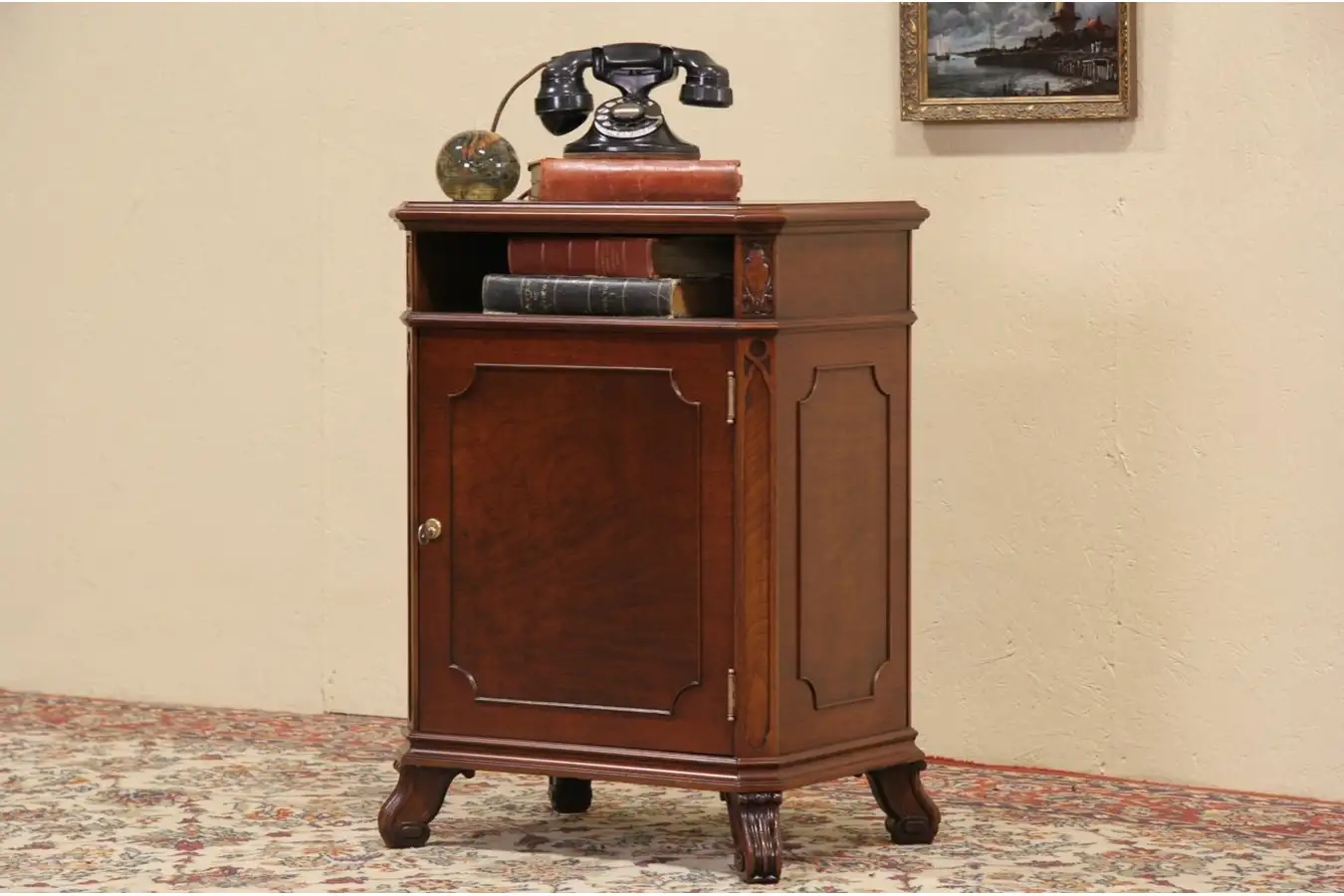 A splendid 1930's executive telephone stand side cabinet that works well for a printer was made for a Milwaukee bank president, the matching desk was signed by famous Boston maker, "Doten Dunton Desk. Co."