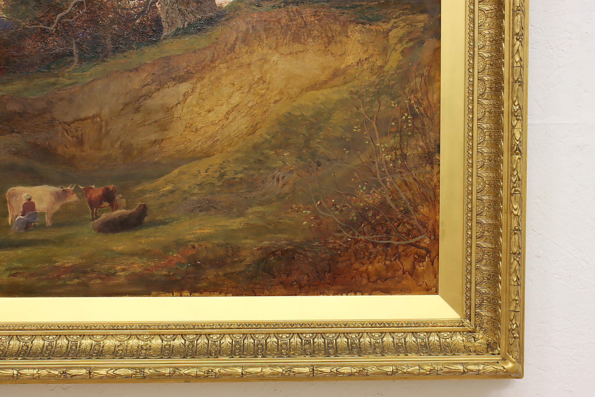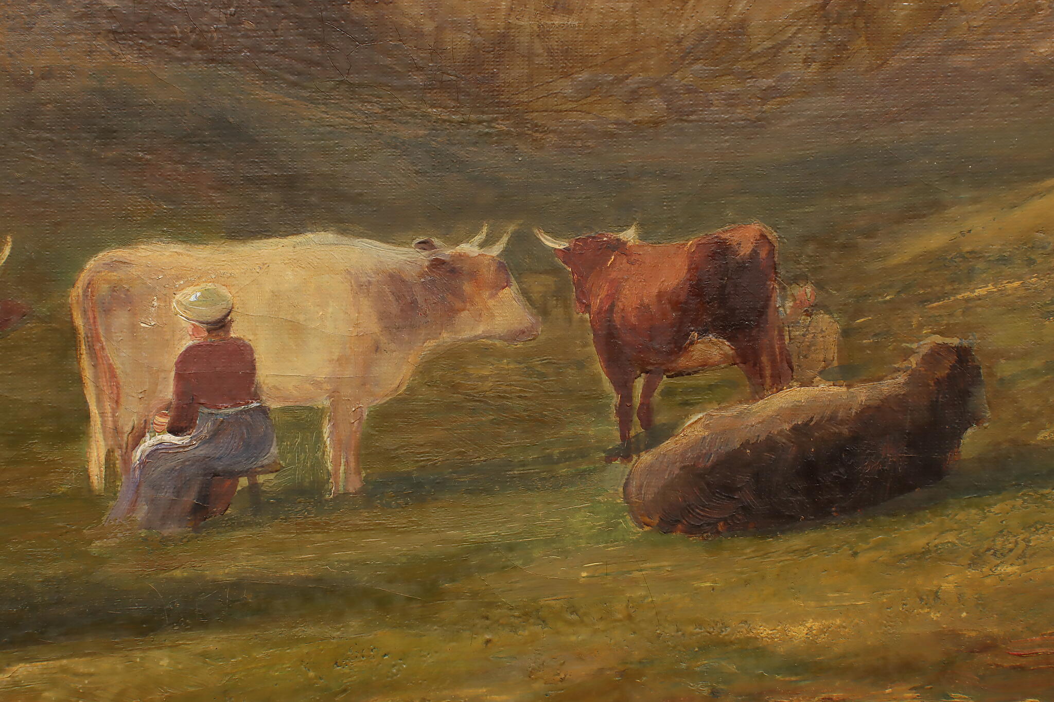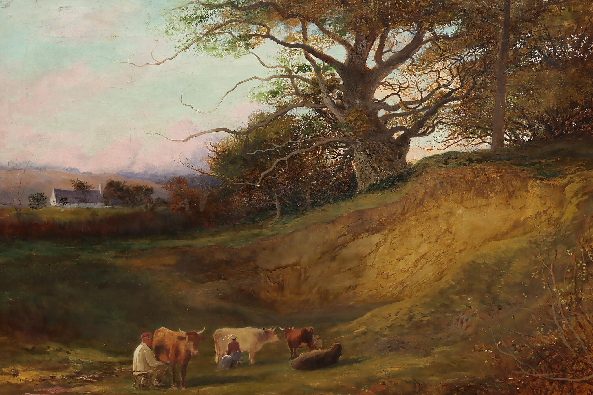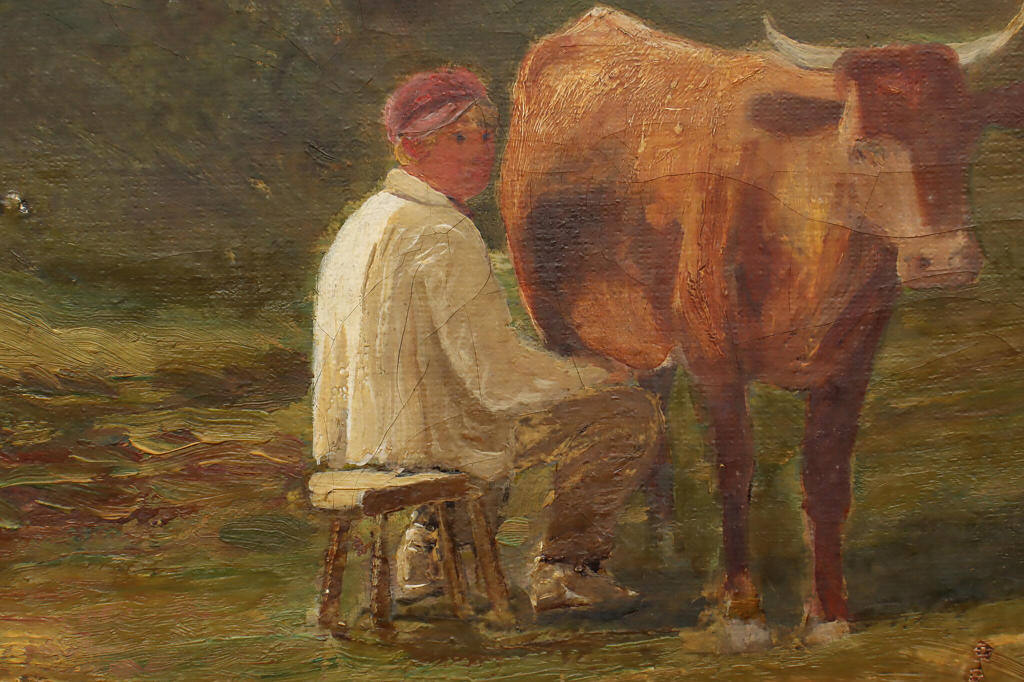 The artist of this painting captures the peaceful routine of a pair of farmers as they milk their herd of cows.