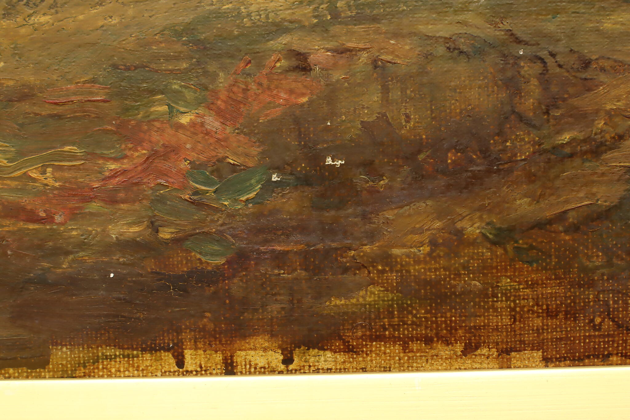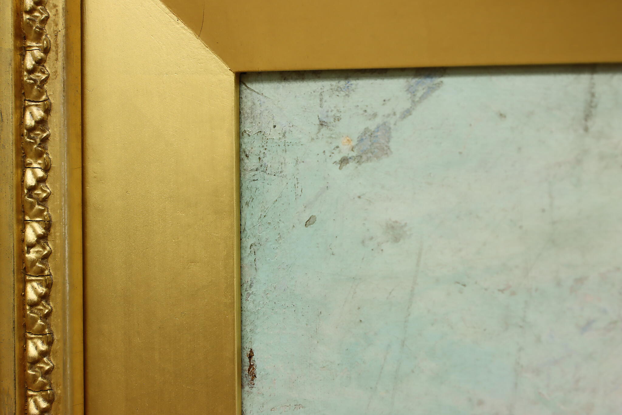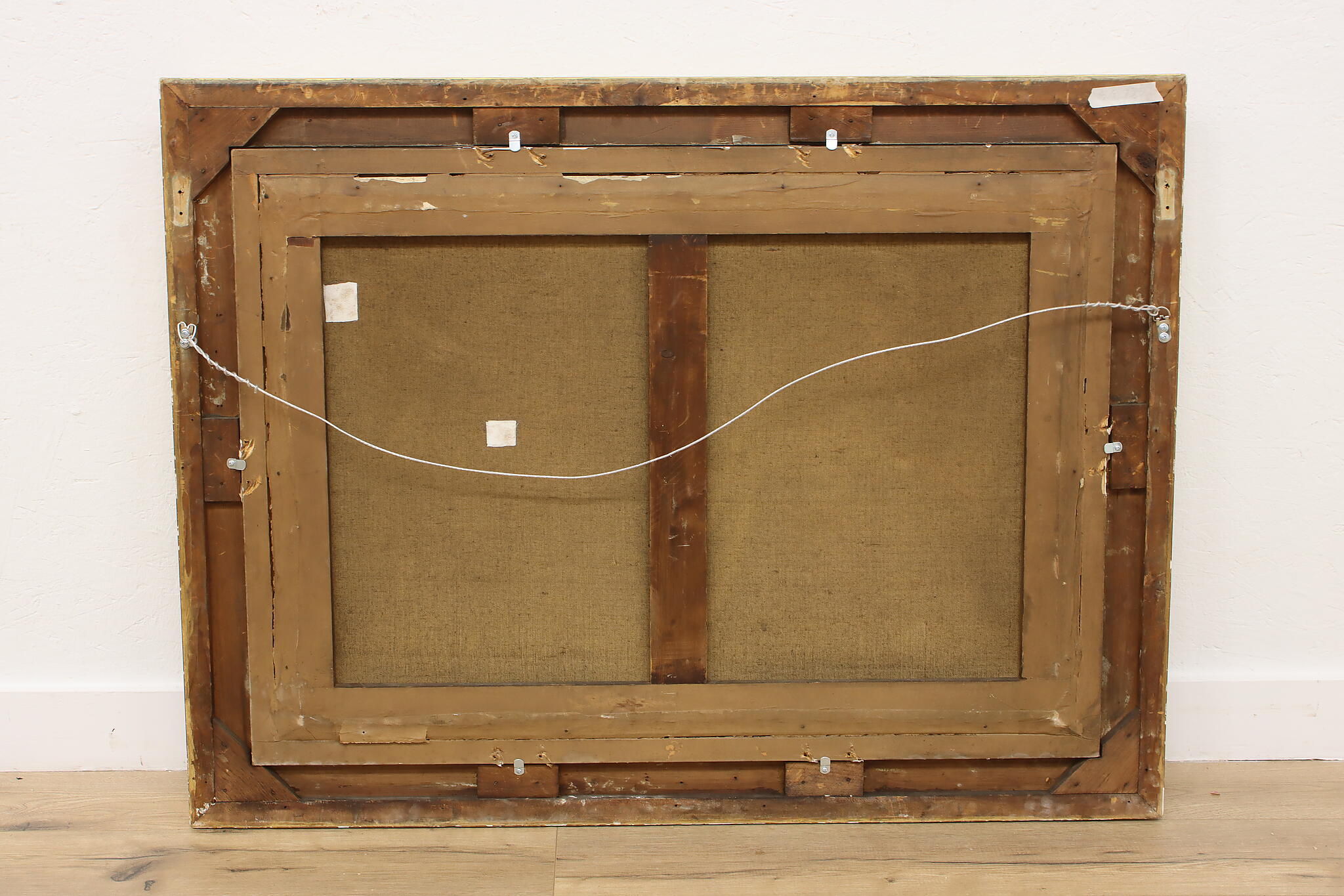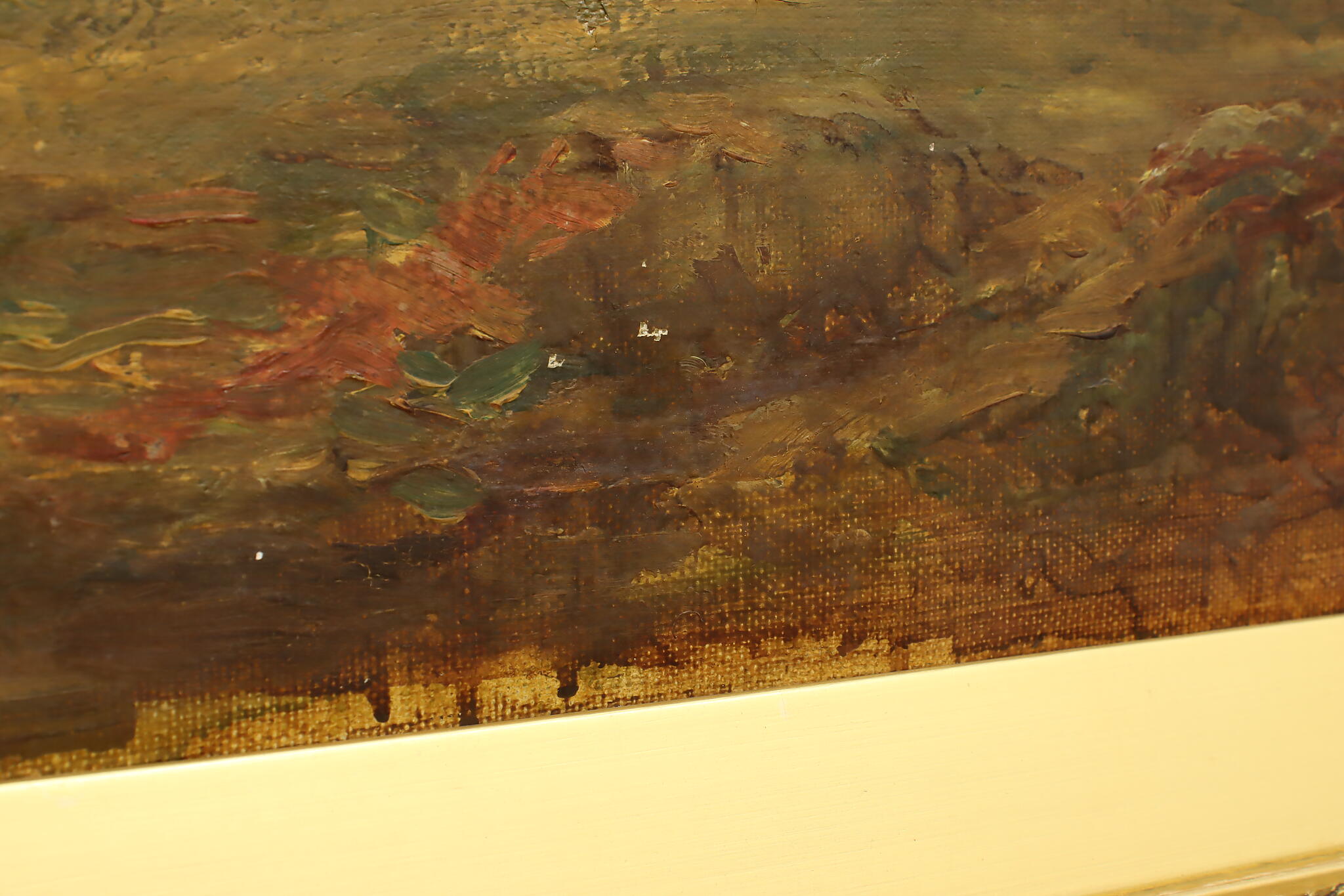 The artist of this painting captures the peaceful routine of a pair of farmers as they milk their herd of cows.