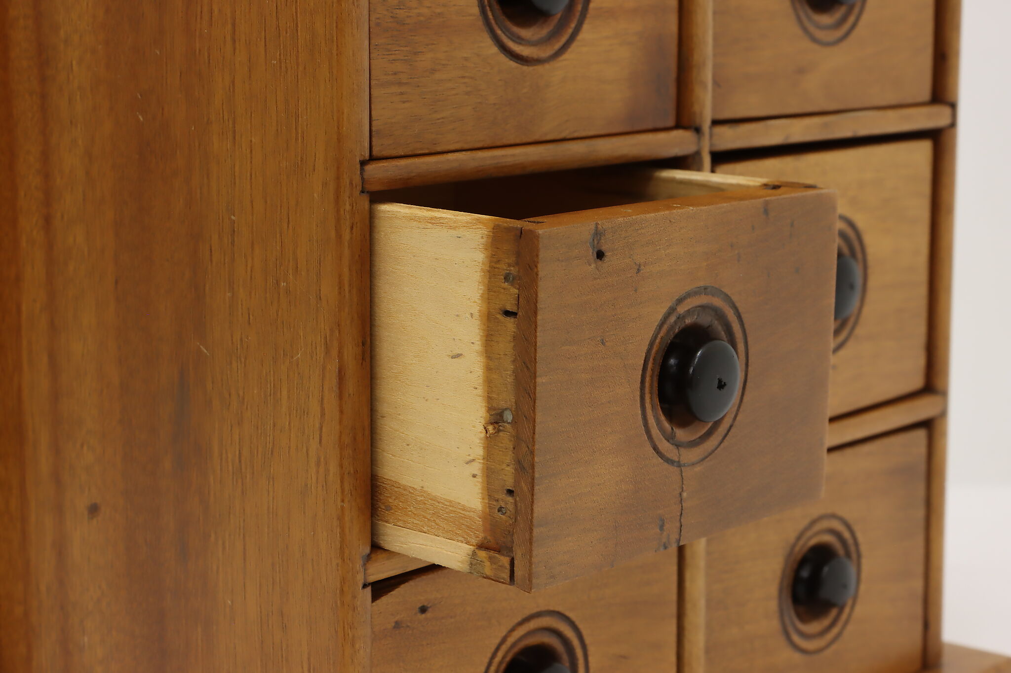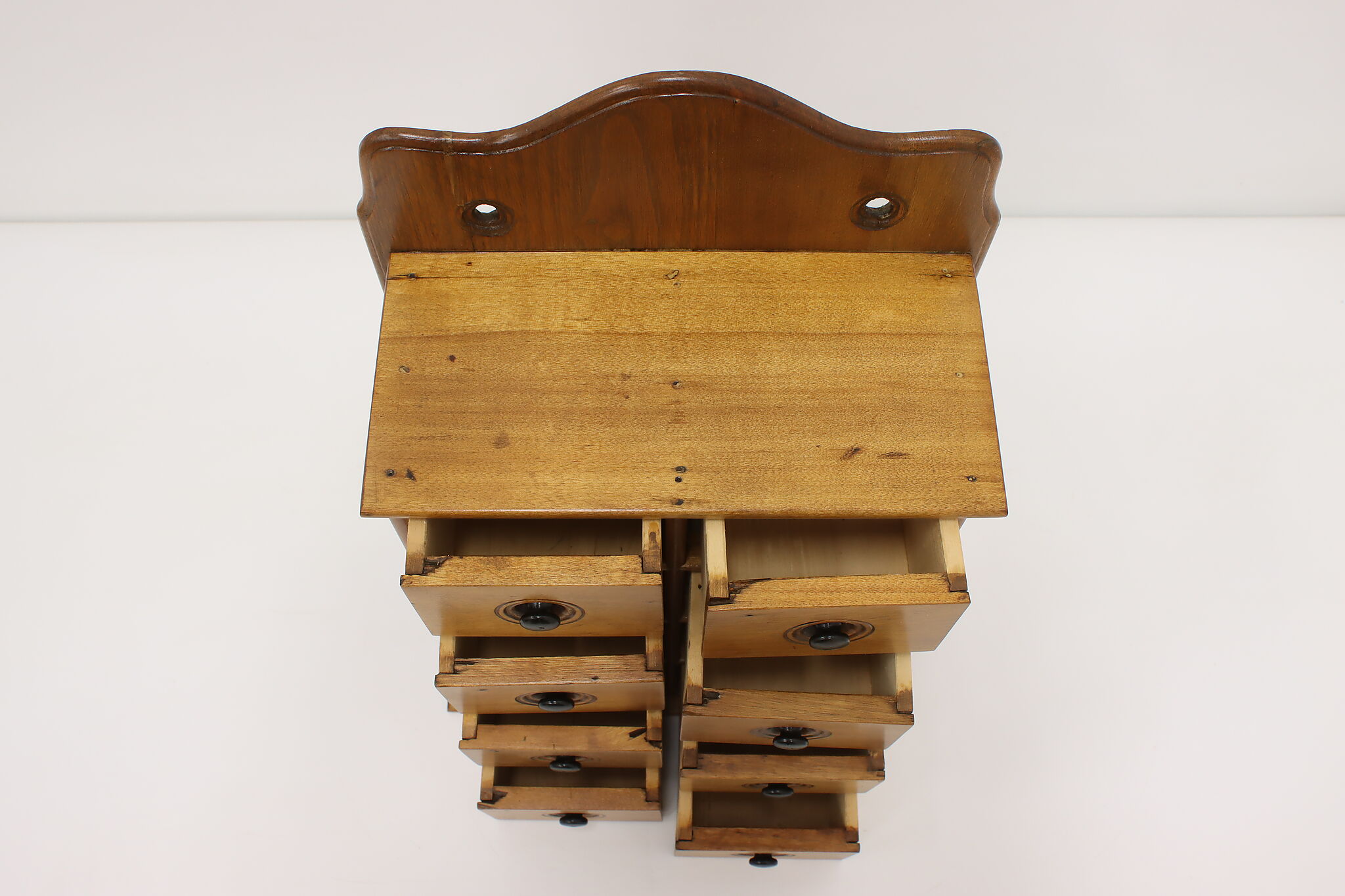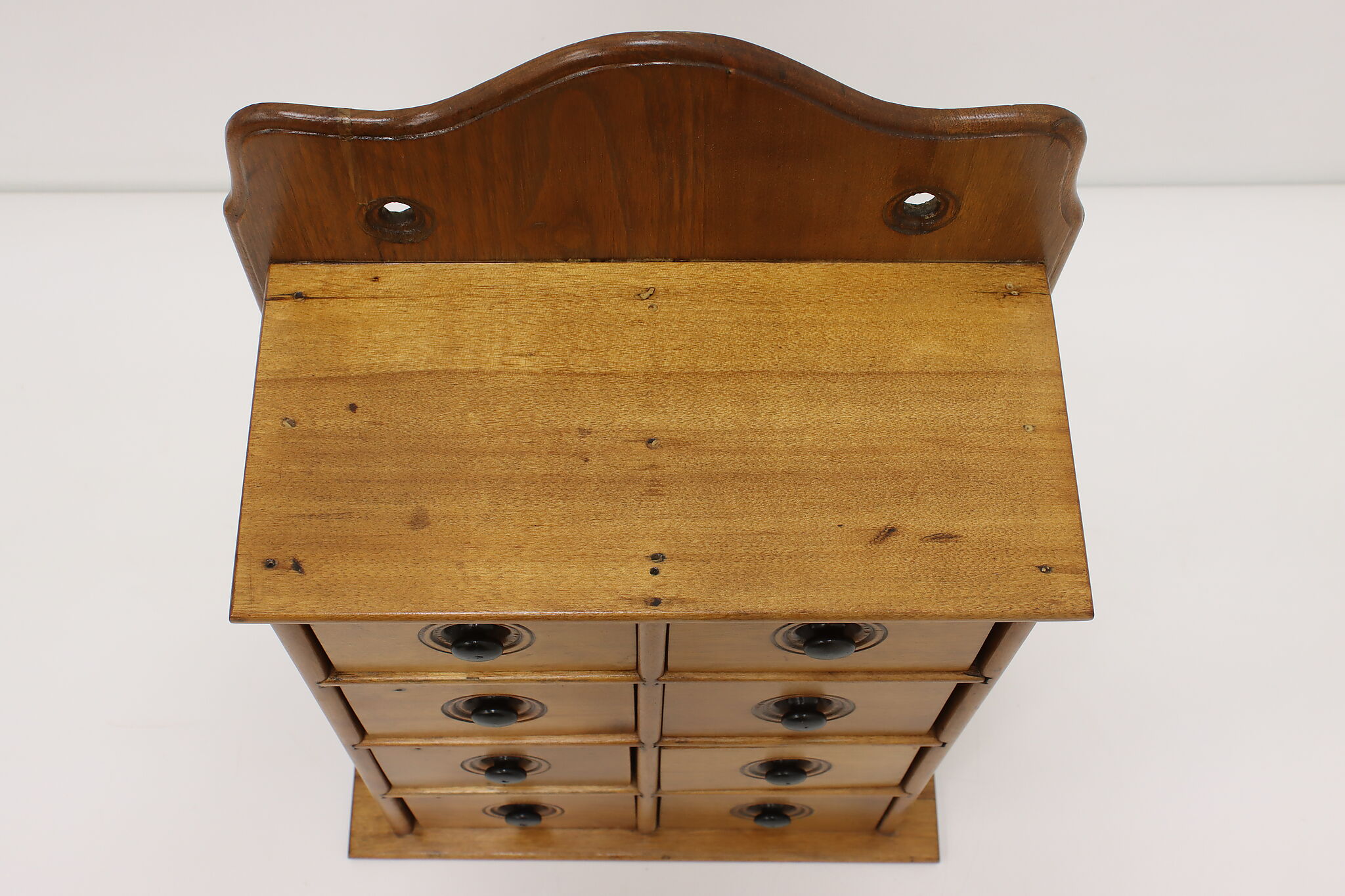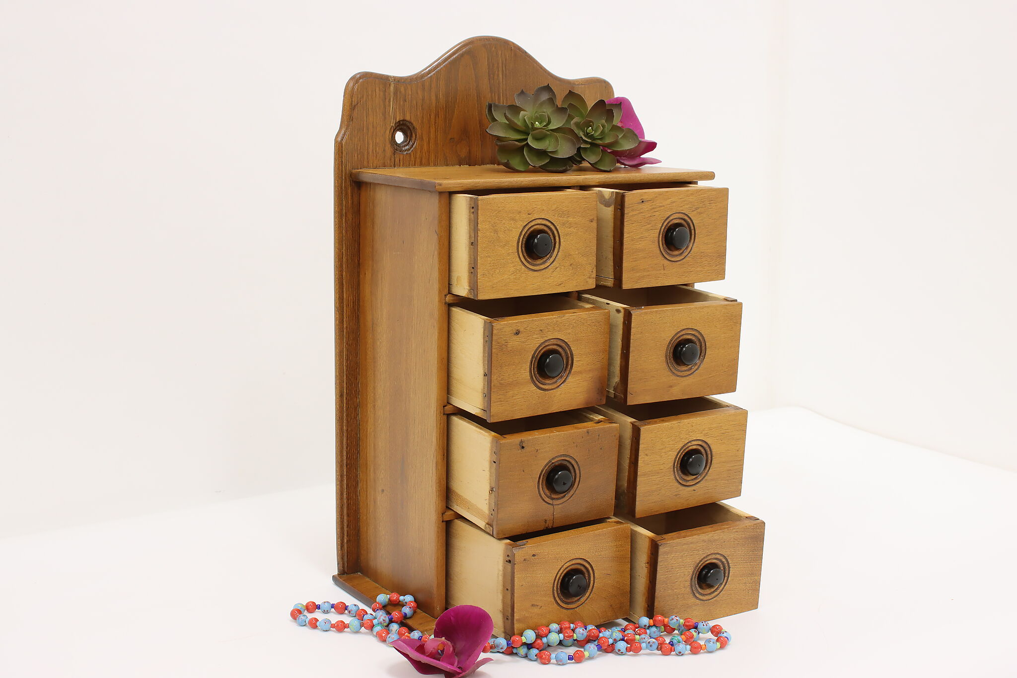 The eight drawers on this farmhouse tabletop or wall cabinet are excellent for jewelry, small collectibles, or spices!