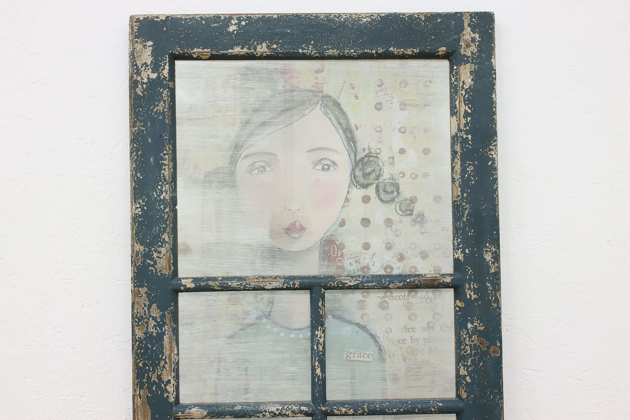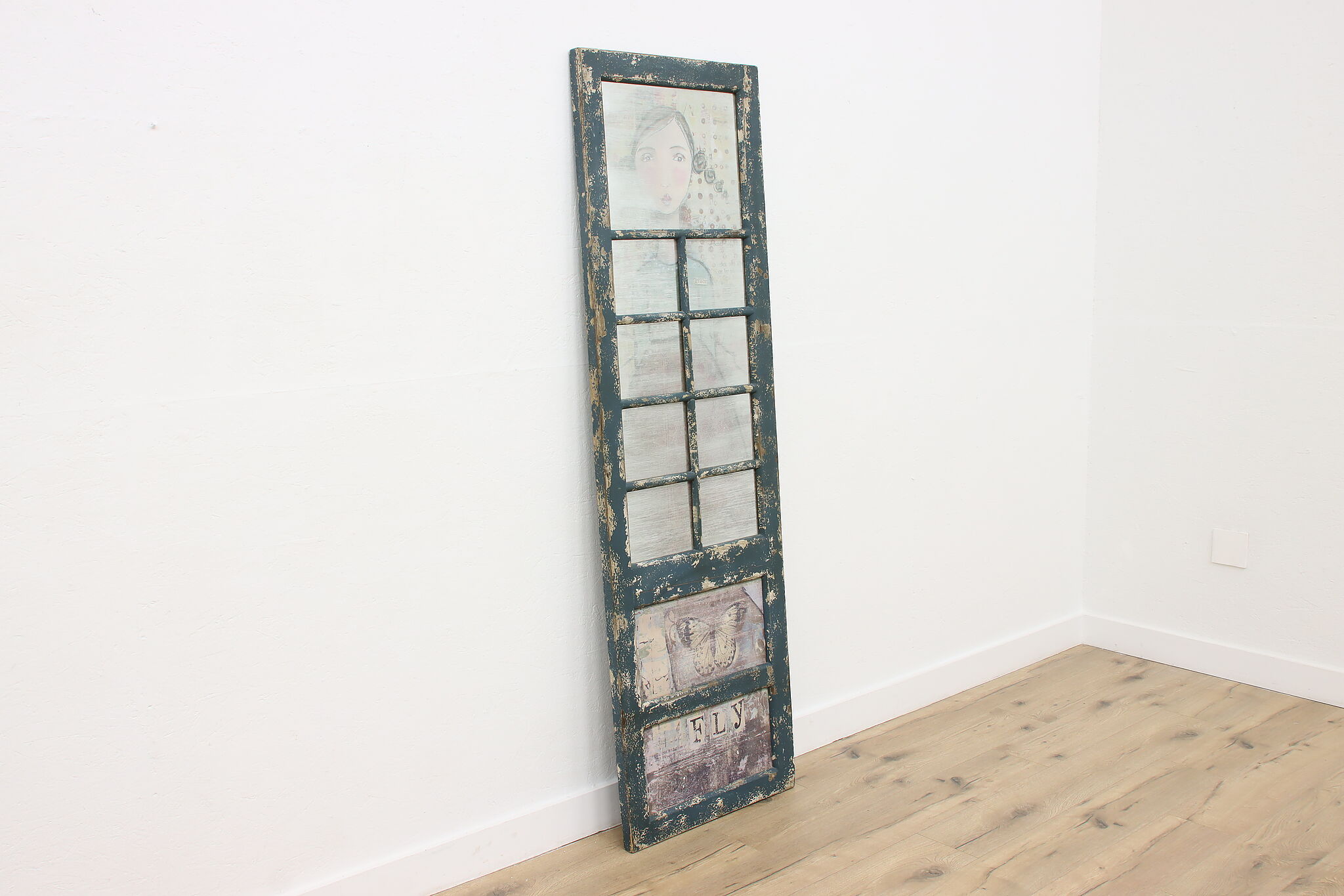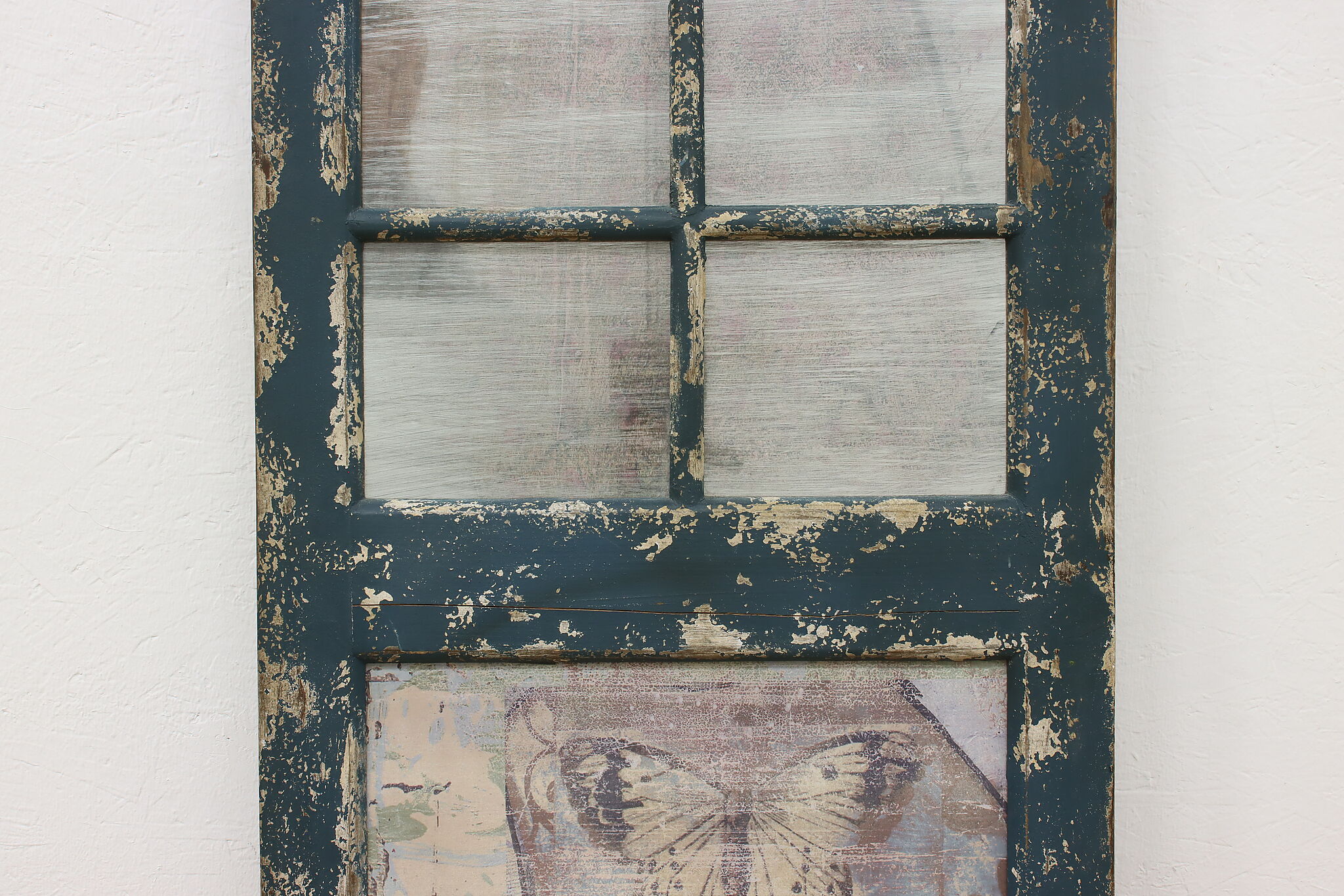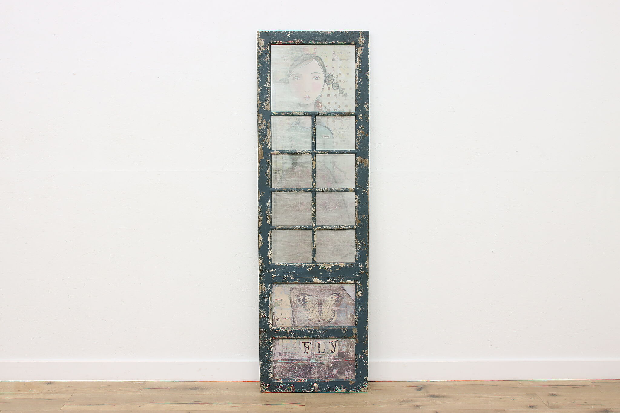 This farmhouse door has a painted metal panel with a portrait of a girl, newspaper clippings, and a butterfly set within a rustic frame.