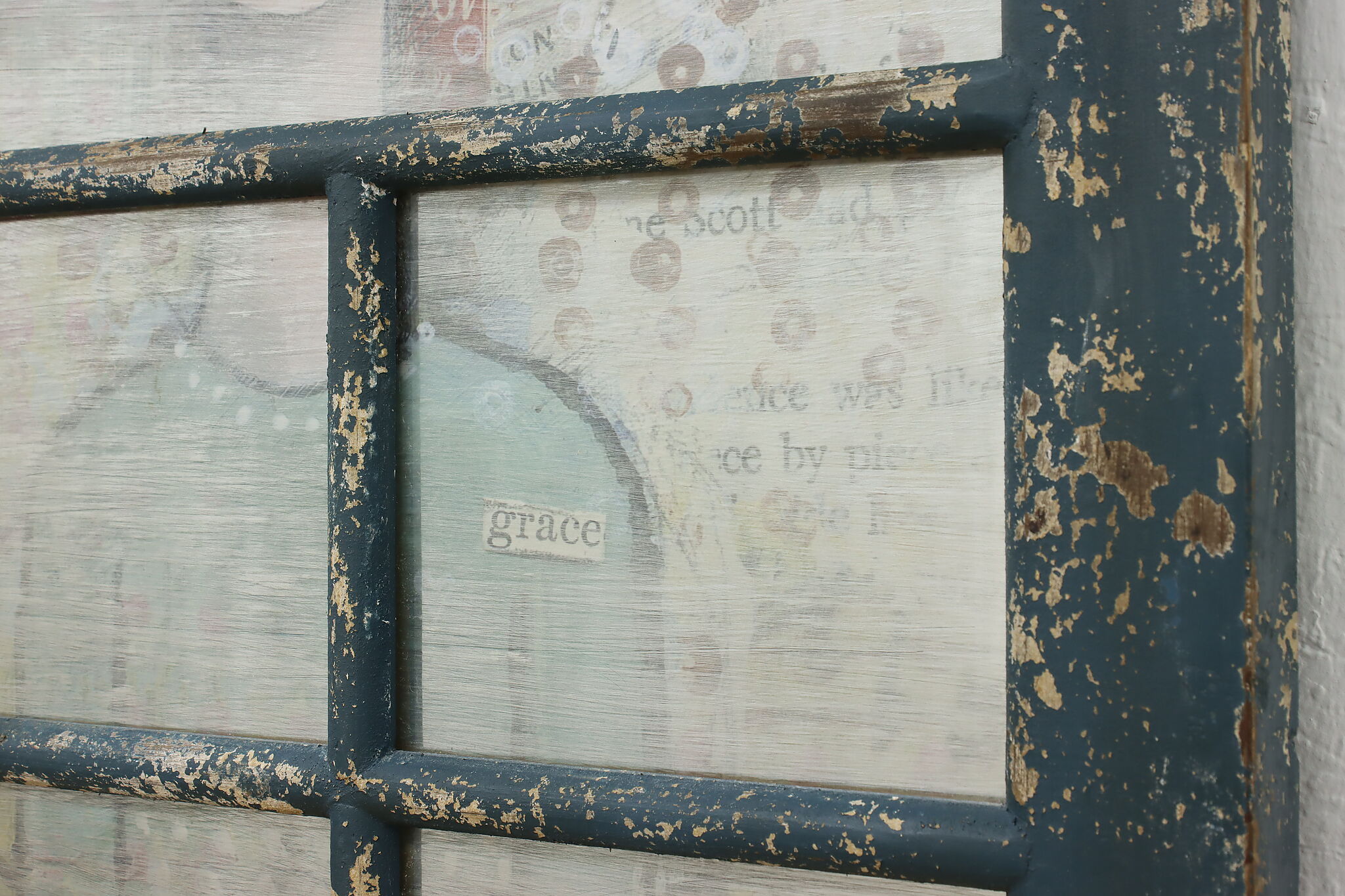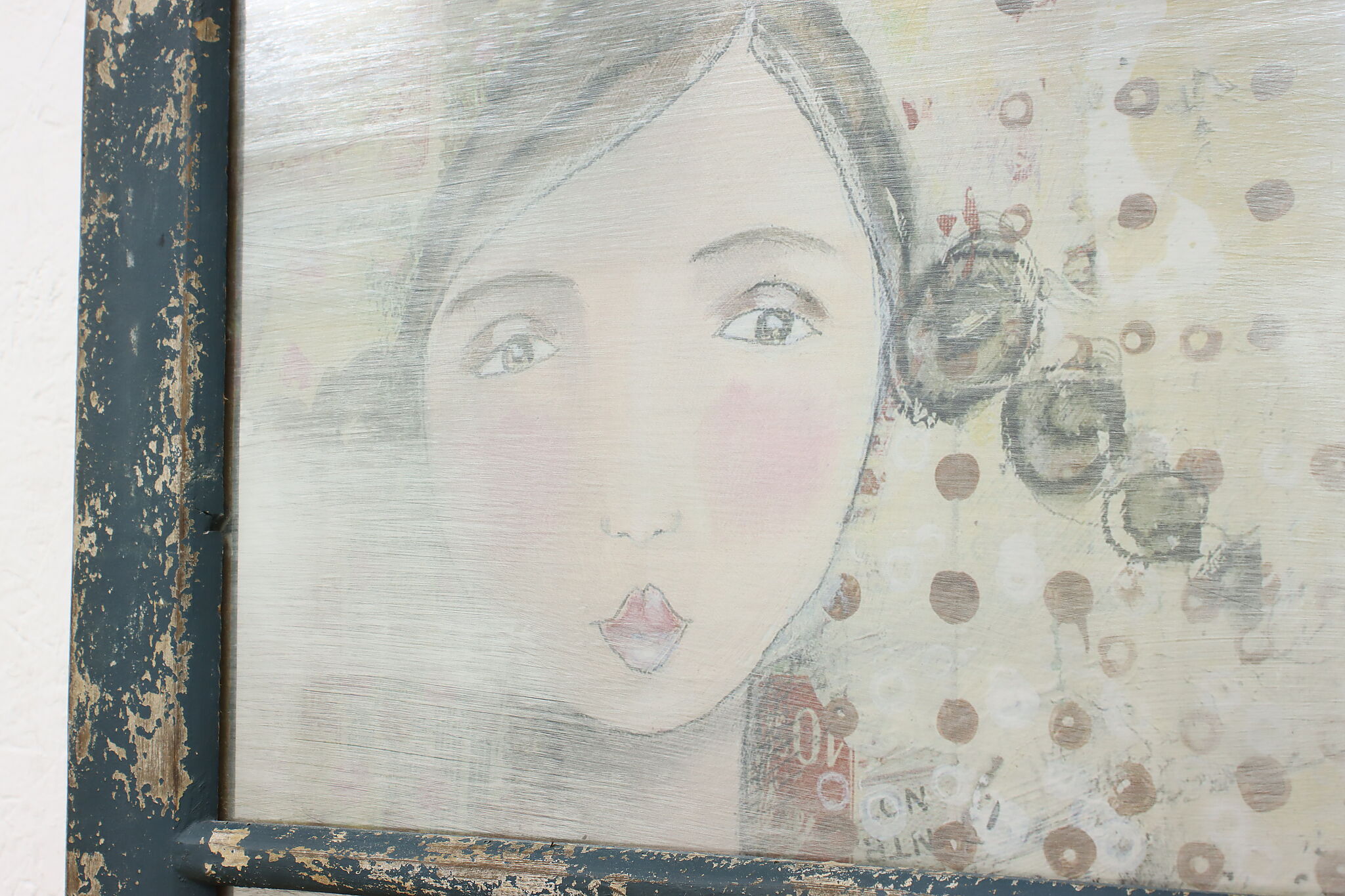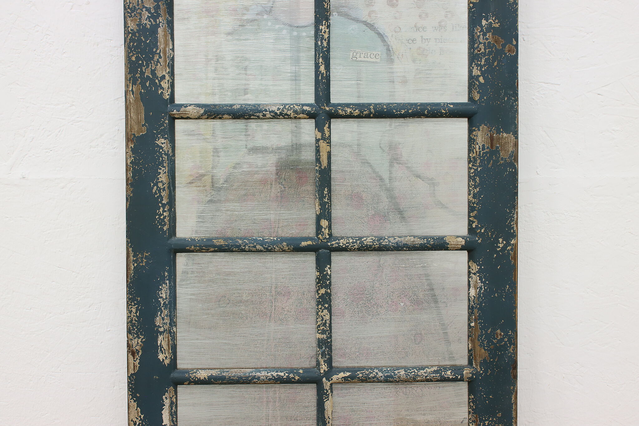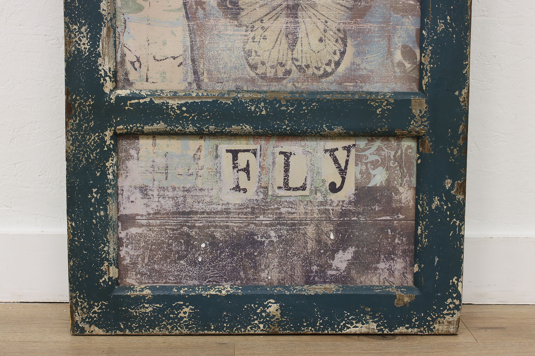 This farmhouse door has a painted metal panel with a portrait of a girl, newspaper clippings, and a butterfly set within a rustic frame.