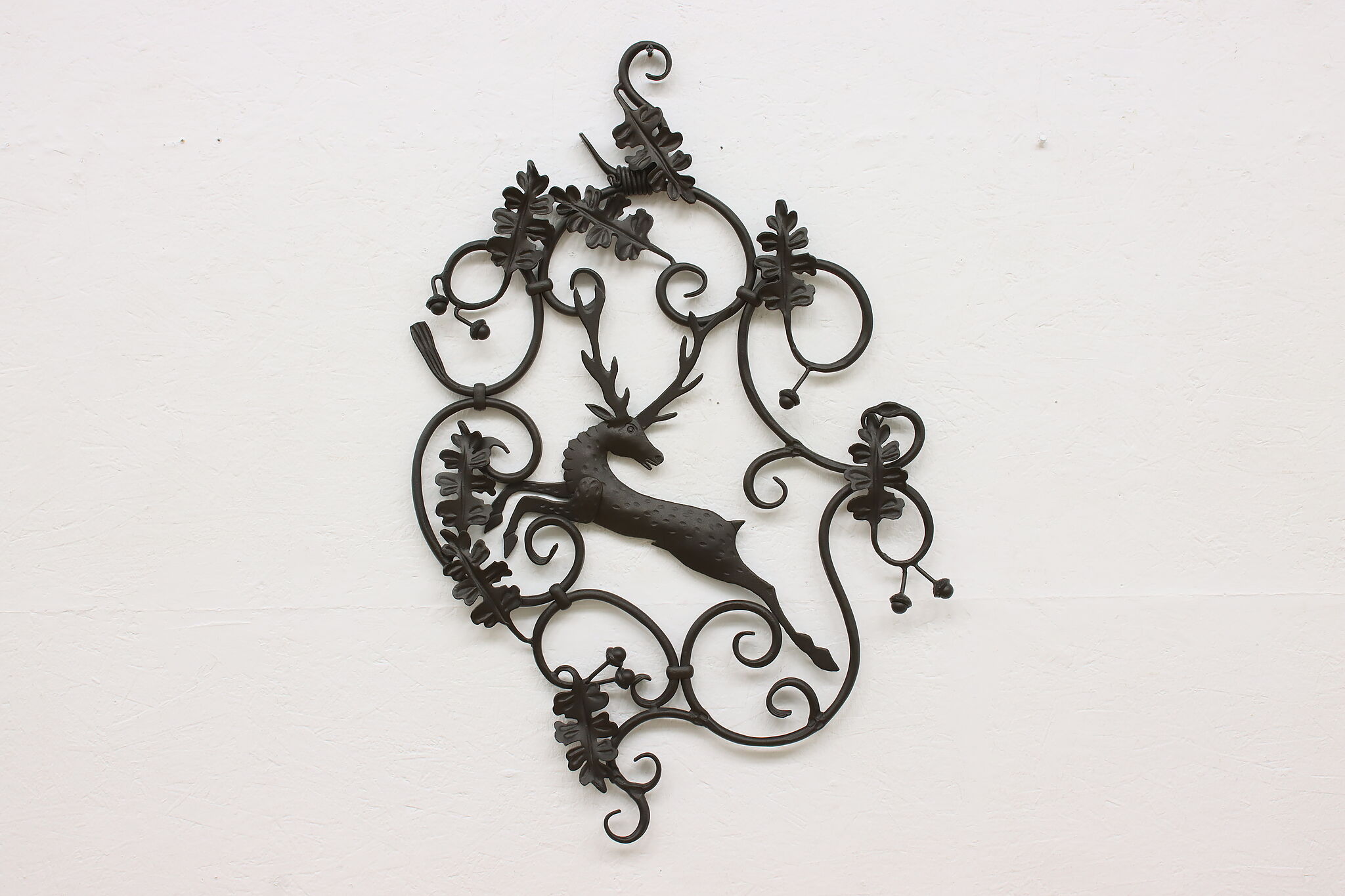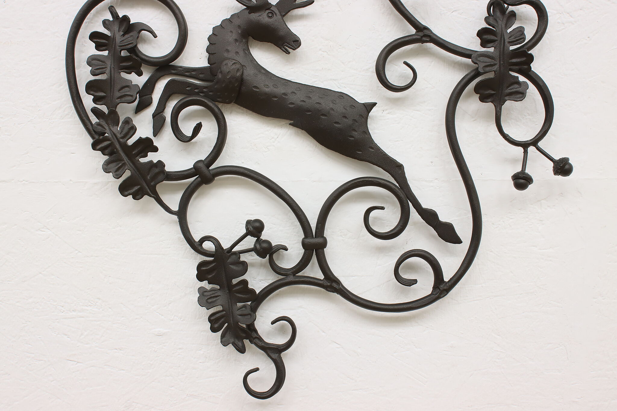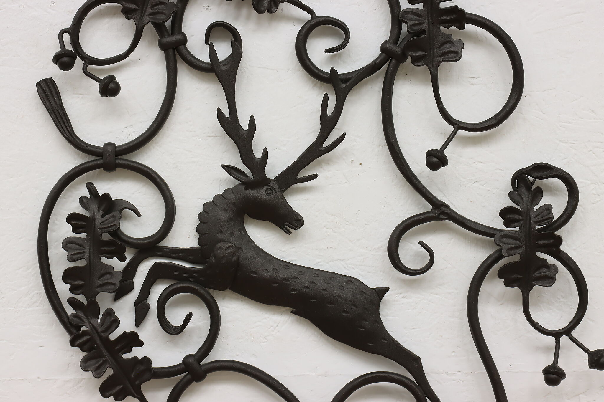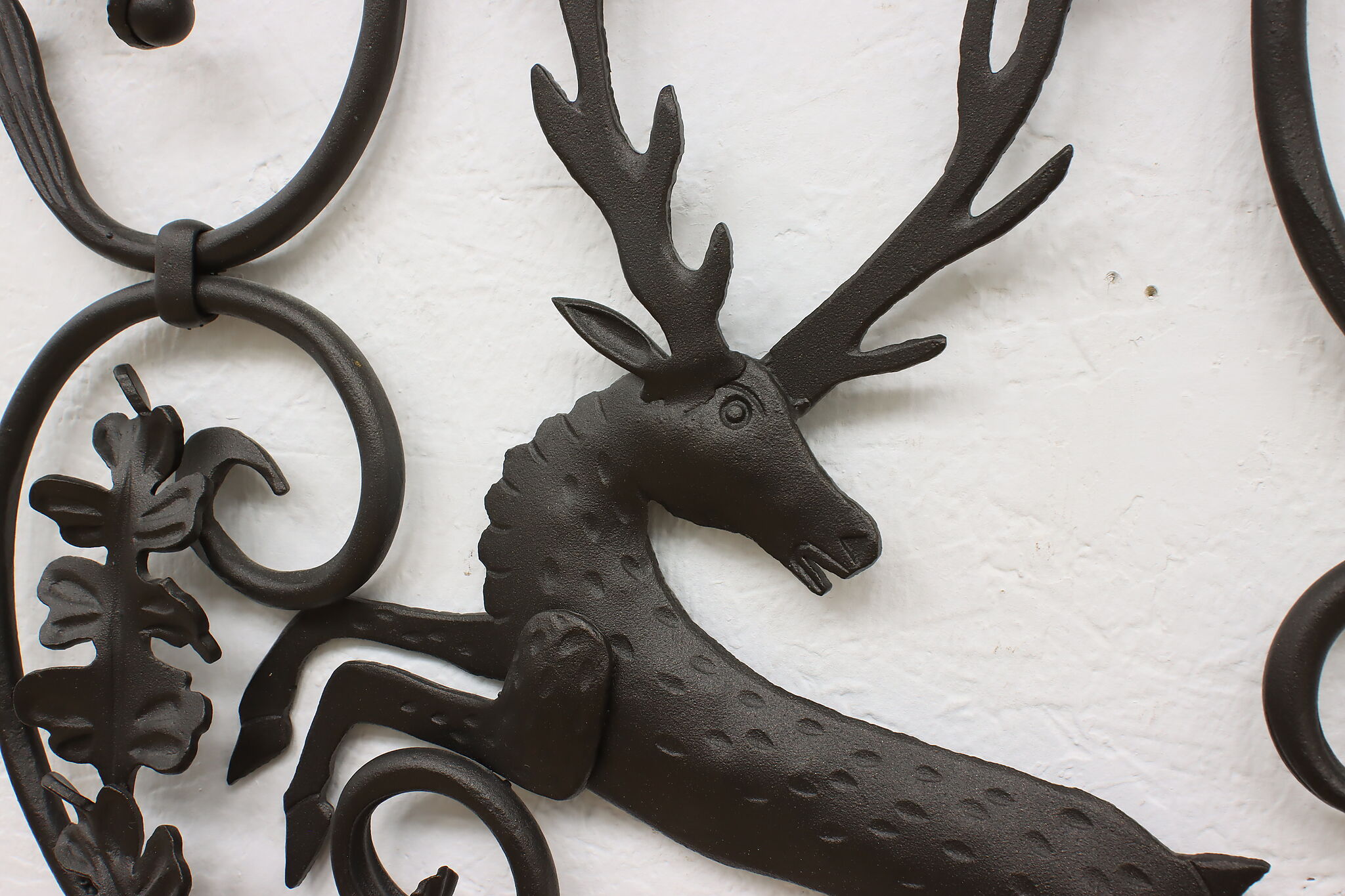 This wall sculpture of a stag surrounded by oak leaves and acorns would be delightful inside or outside of your home.