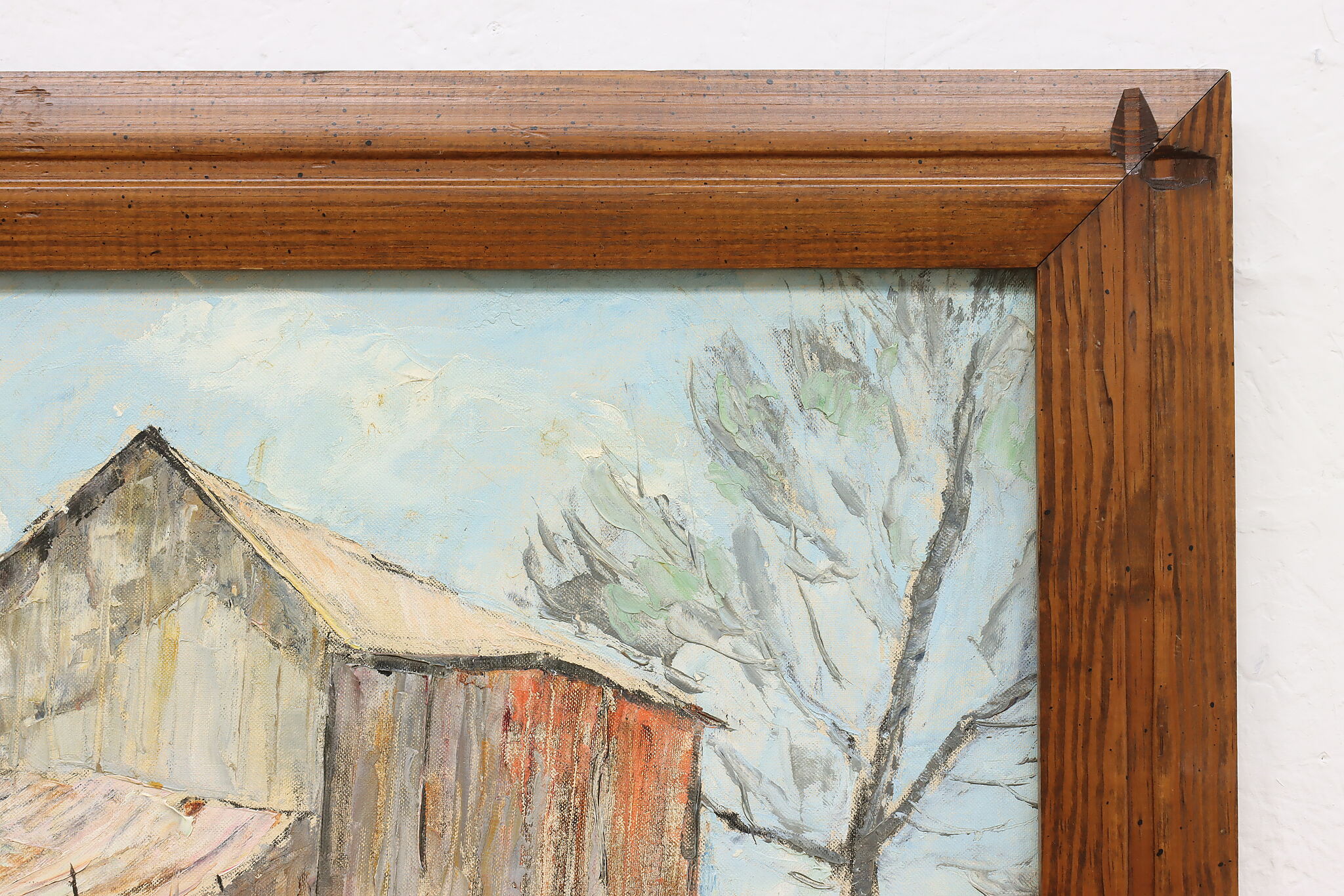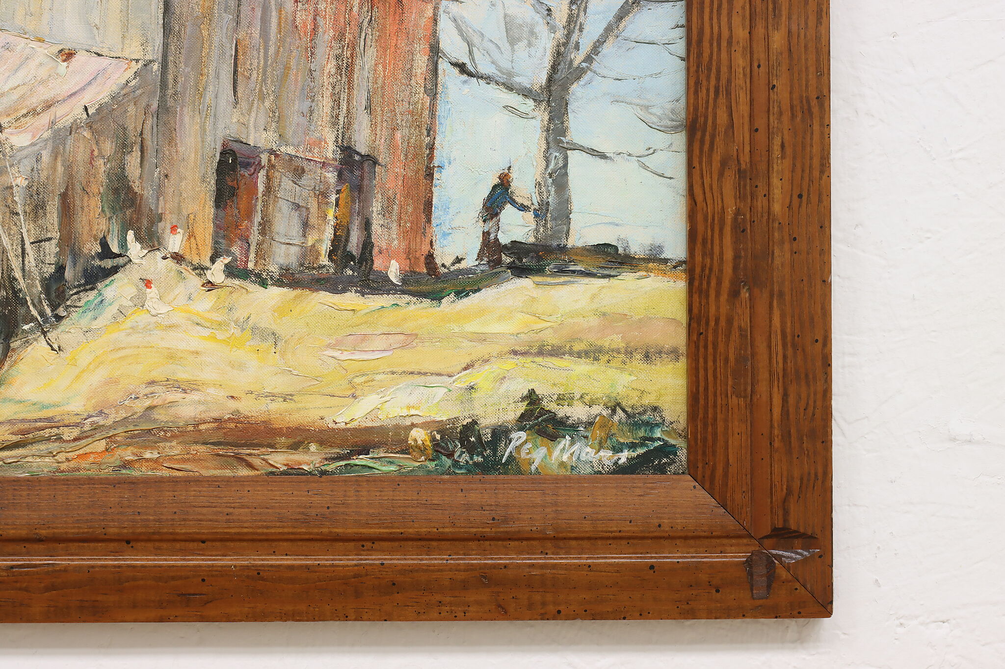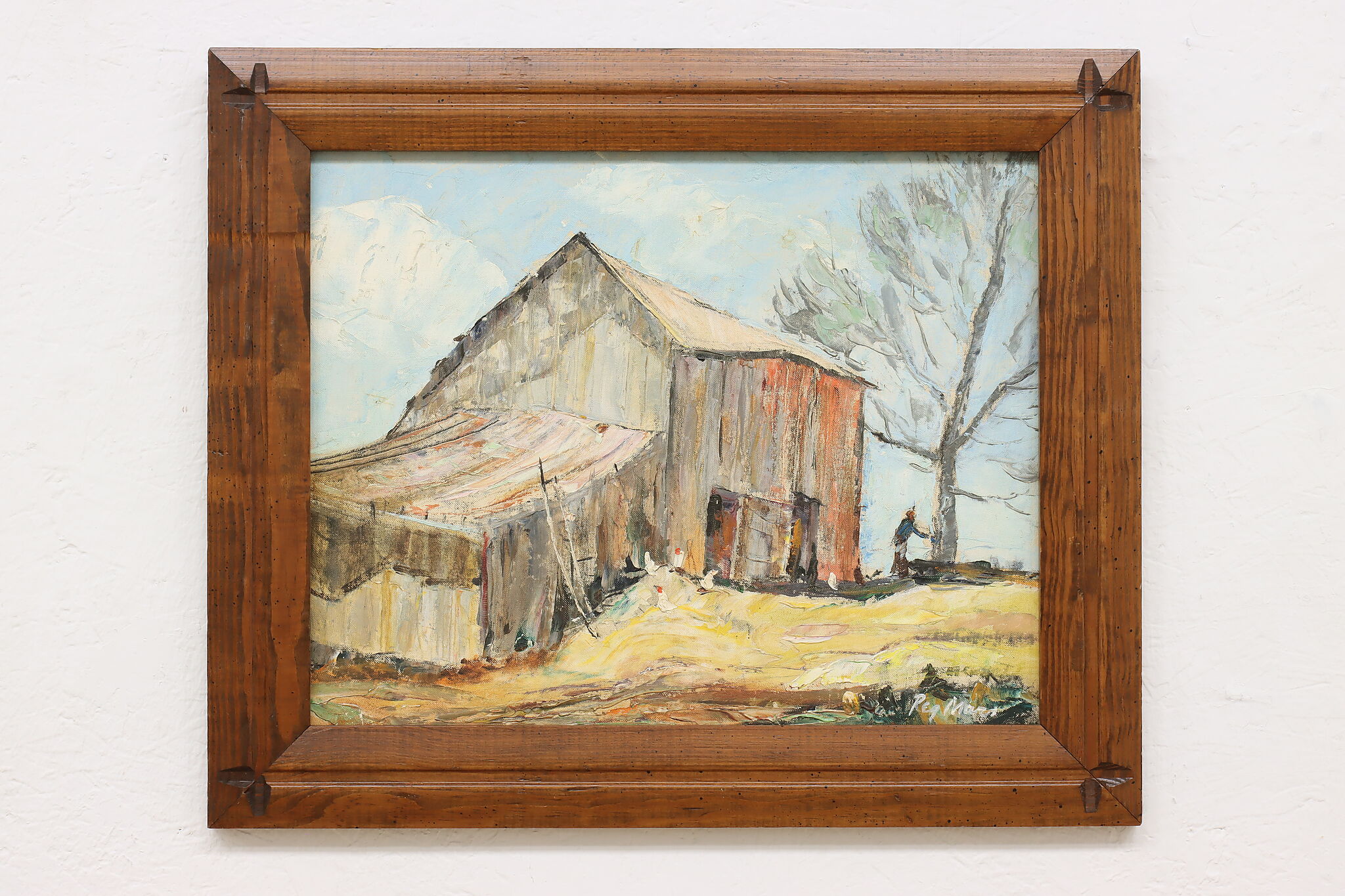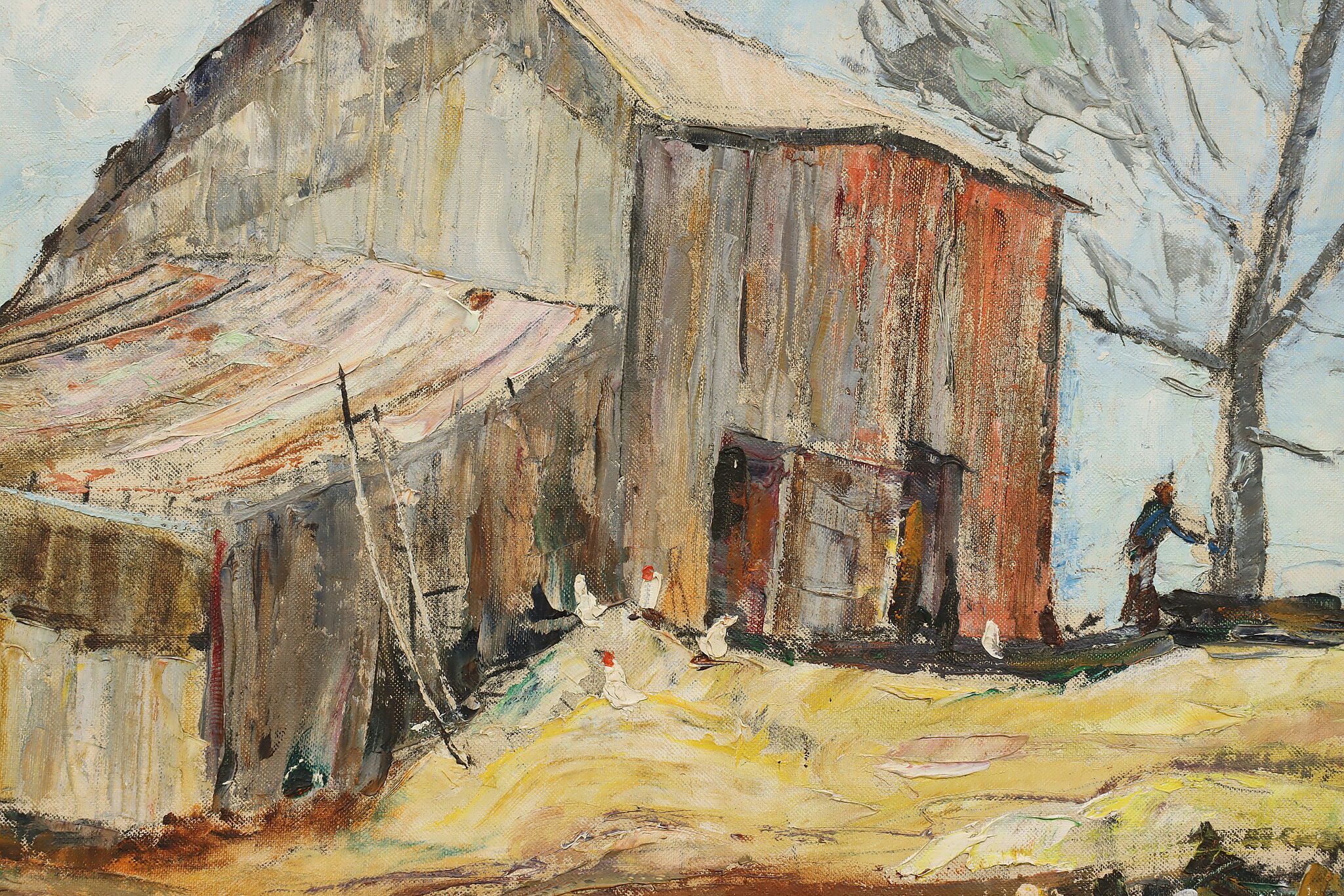 A snowy barnyard with chickens braving the cold weather for a meal is the subject of this charming rustic painting.