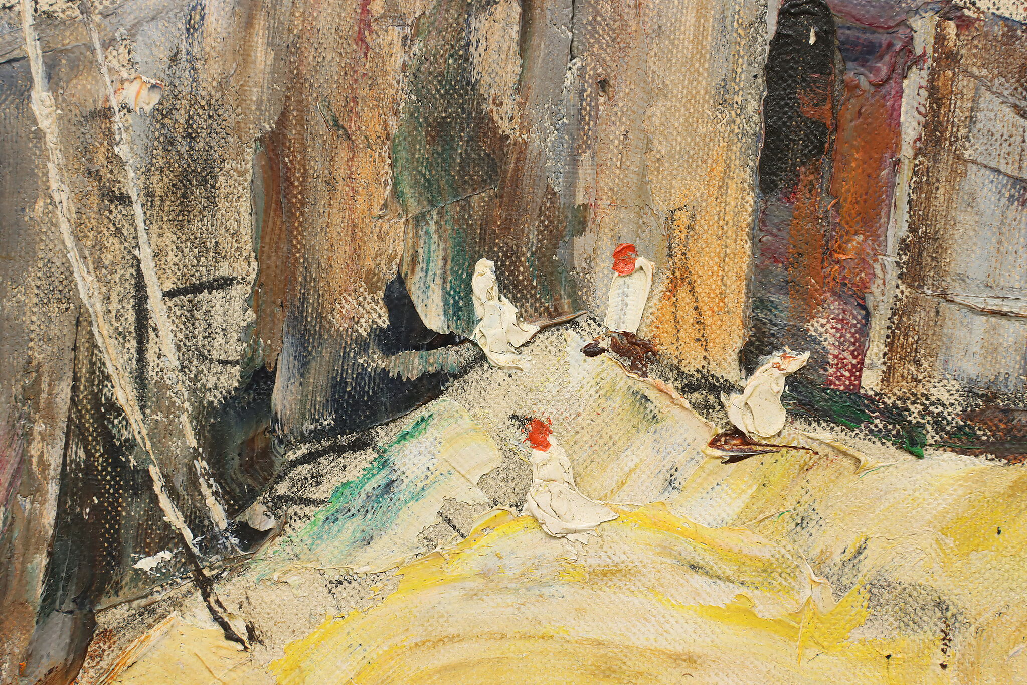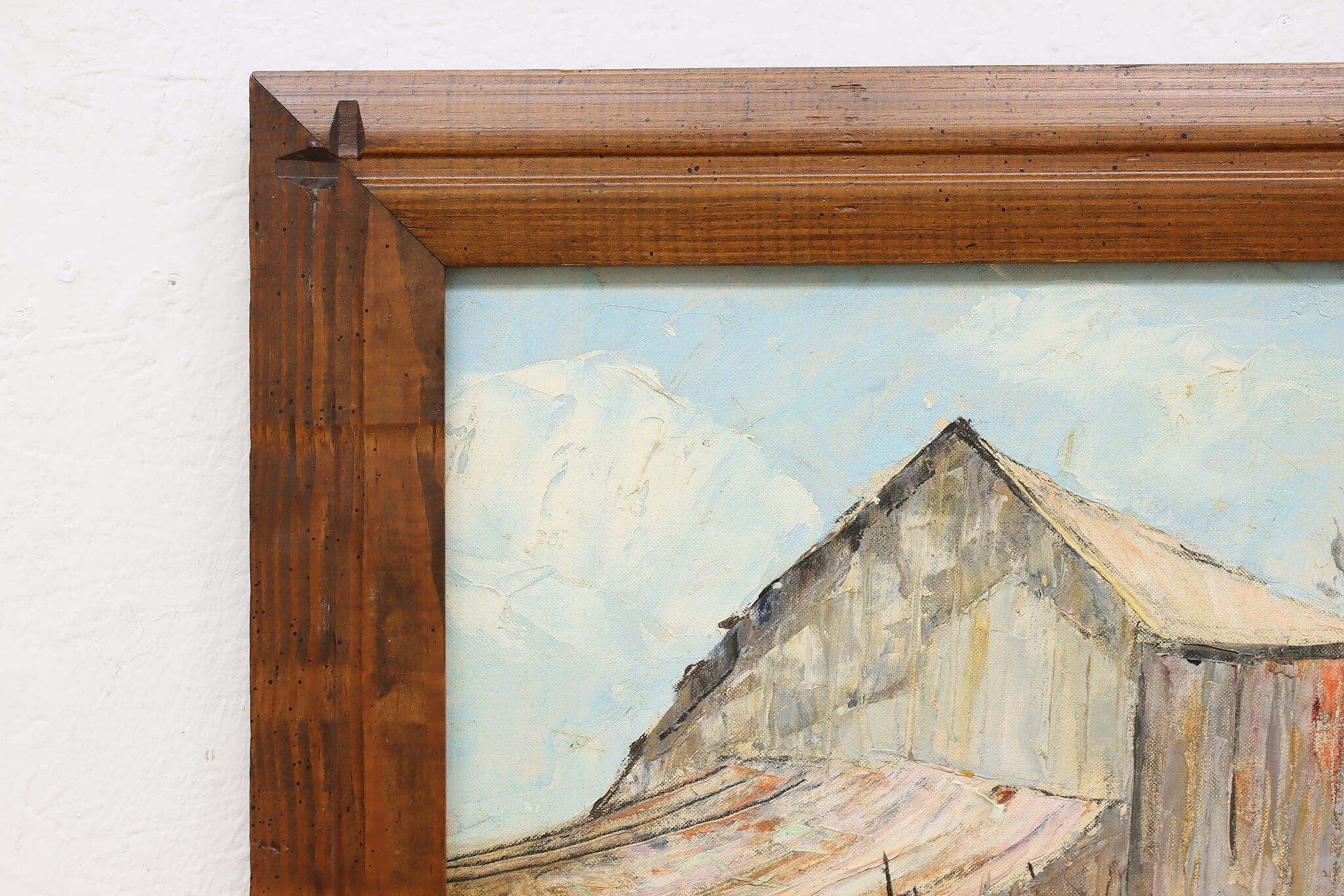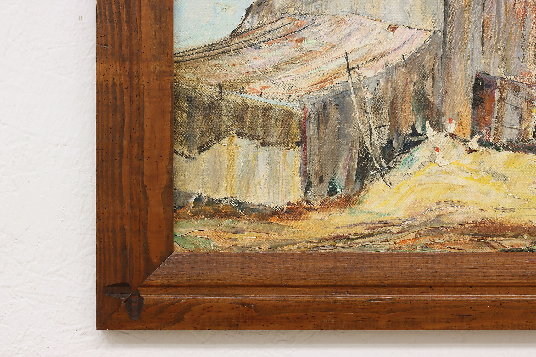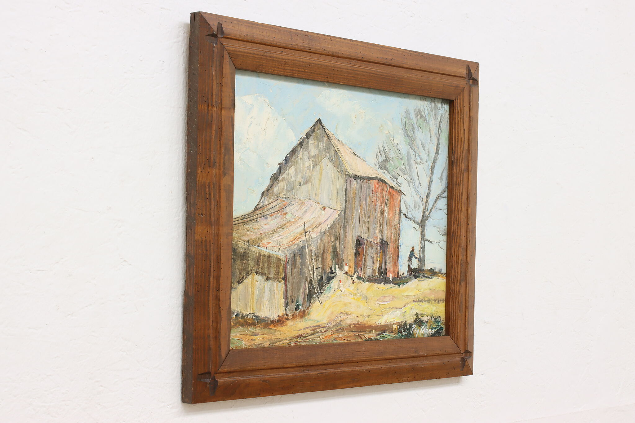 A snowy barnyard with chickens braving the cold weather for a meal is the subject of this charming rustic painting.