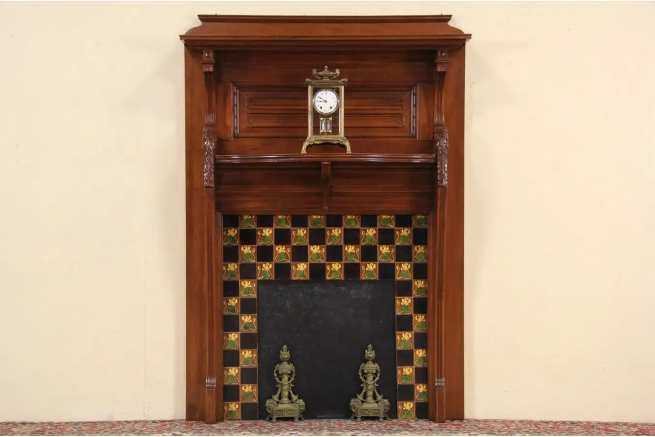 There are minor mars and shrinkage separations from age for antique character. American made, there is a "linenfold" panel. Hand painted ceramic tiles are probably original, and have been removed from the original masonry and glued to a separate panel as shown.