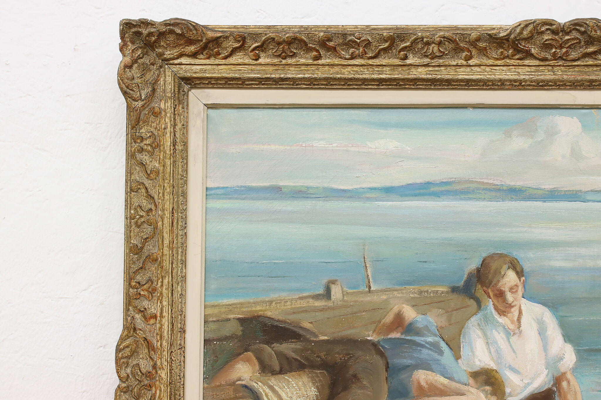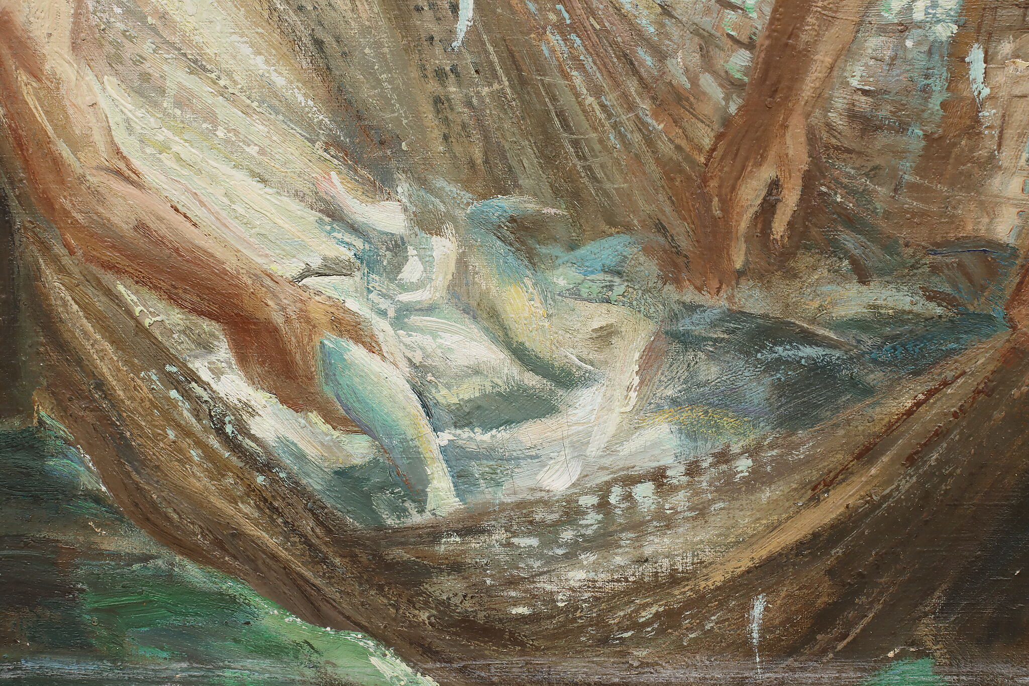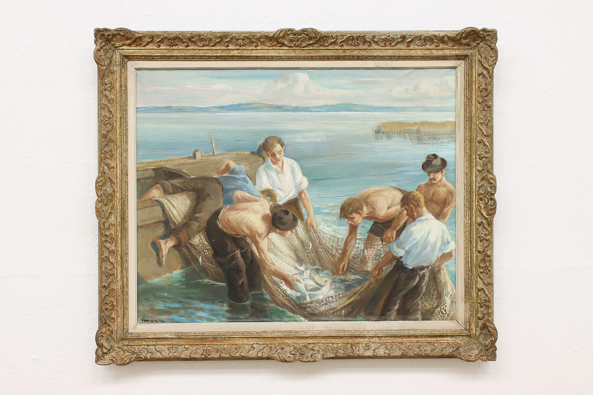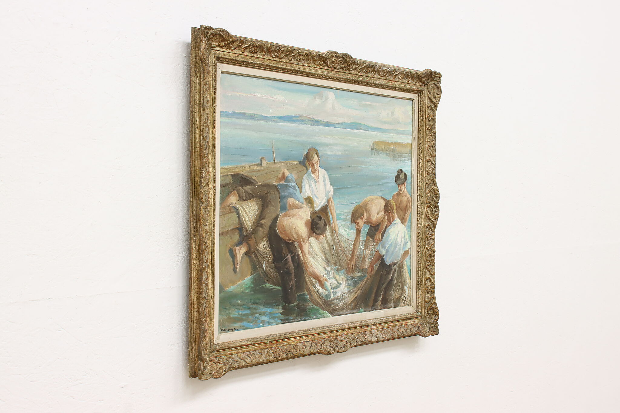 A busy harbor scene with fisherman bringing in the day's catch is the subject of this painting.