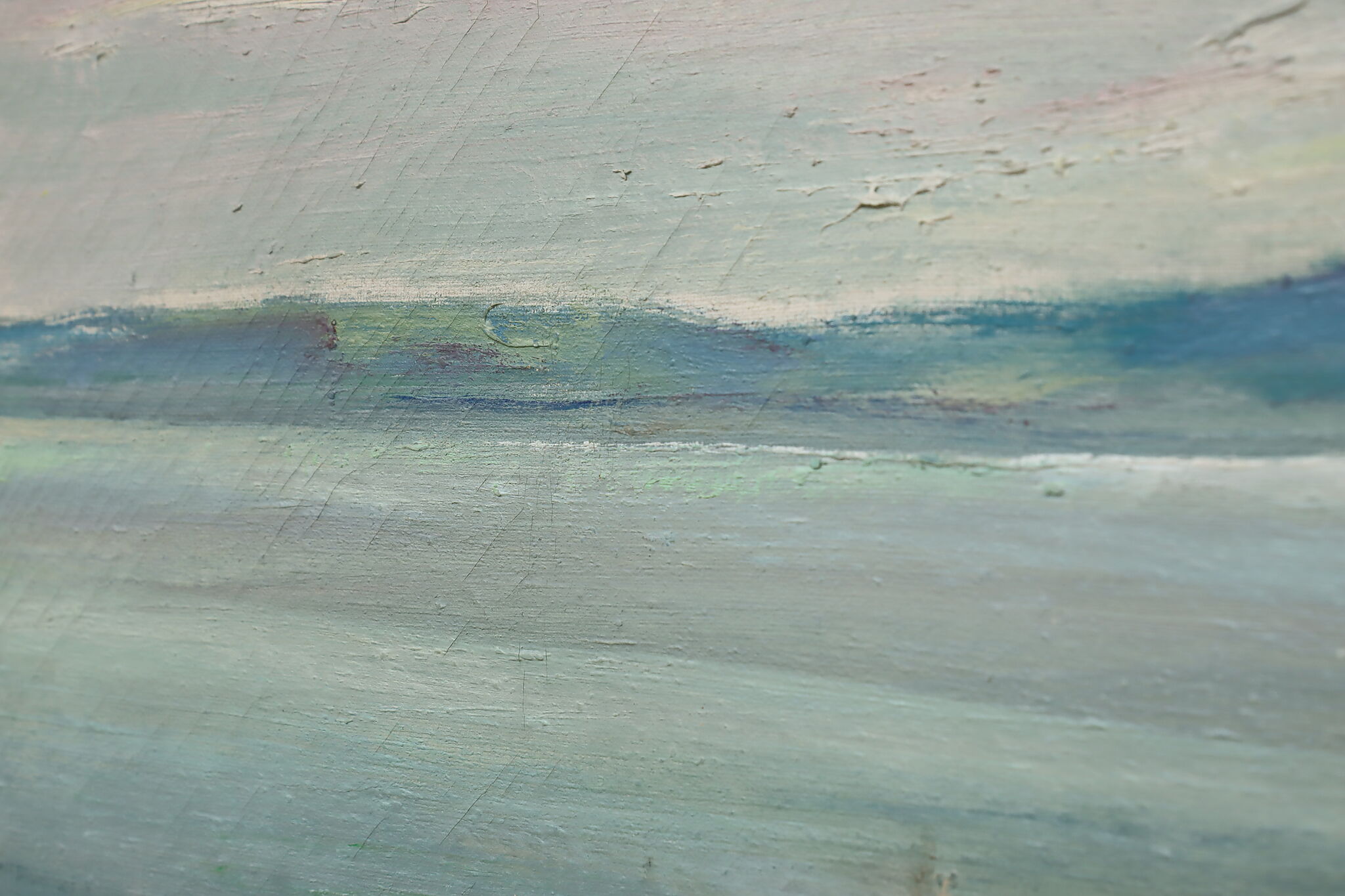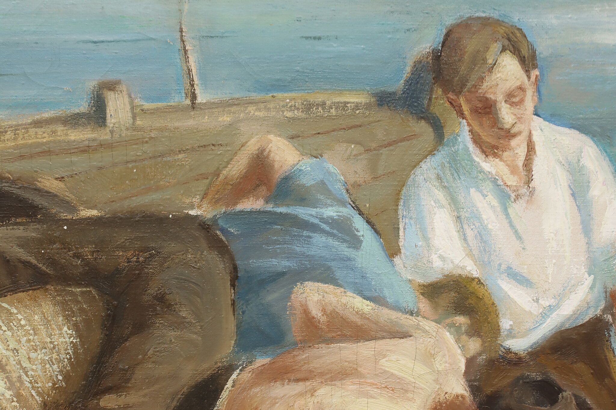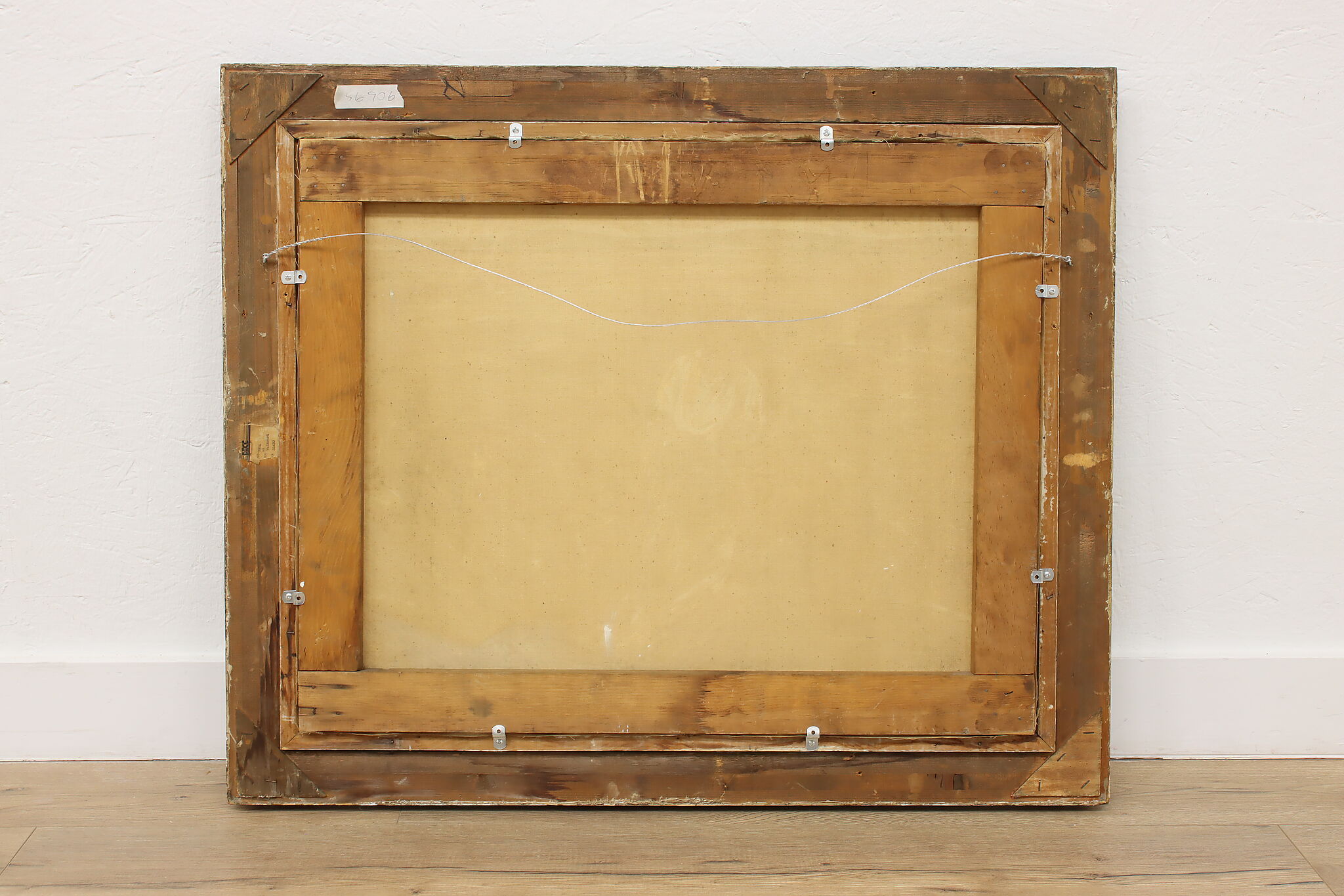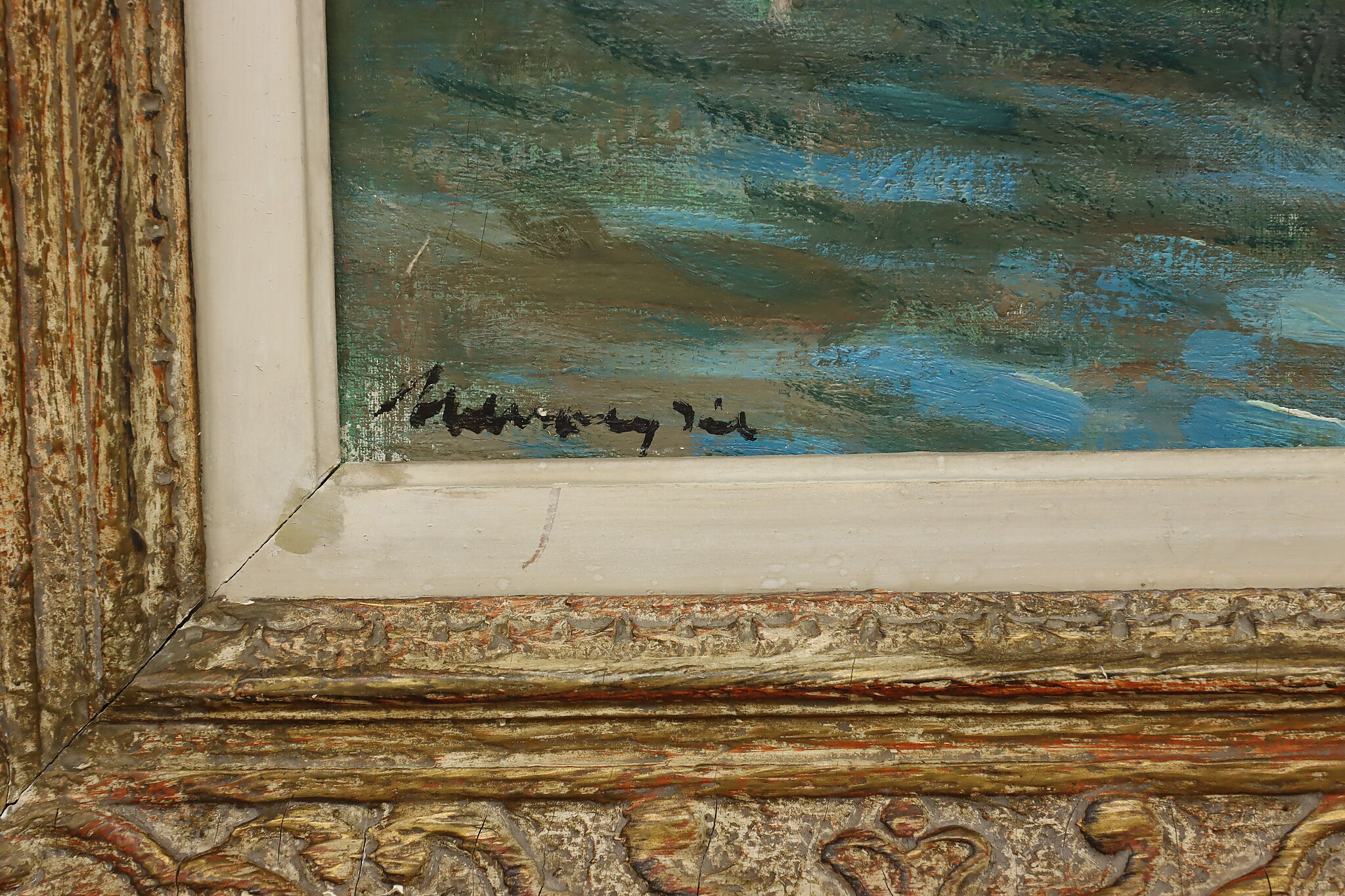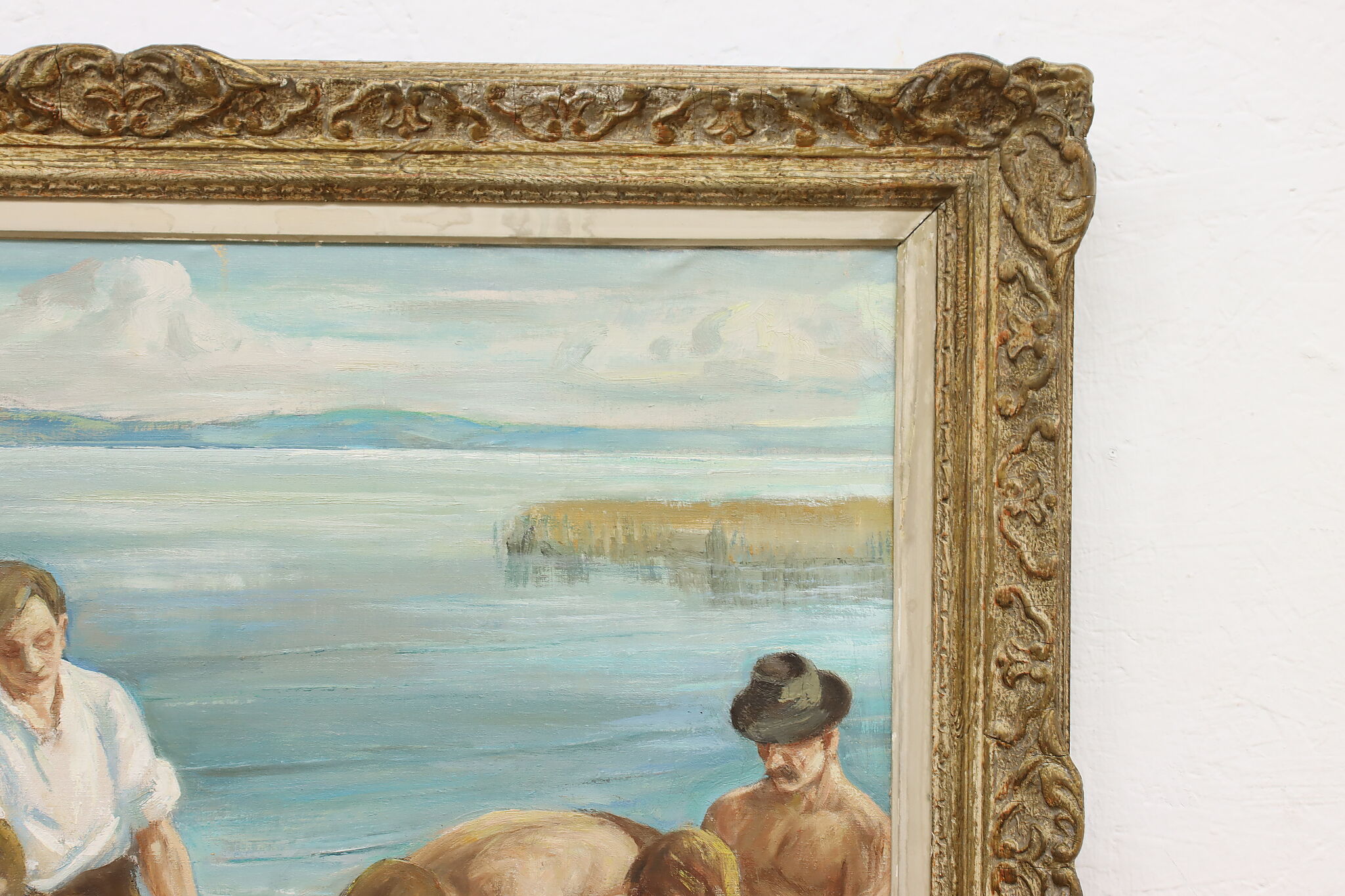 A busy harbor scene with fisherman bringing in the day's catch is the subject of this painting.