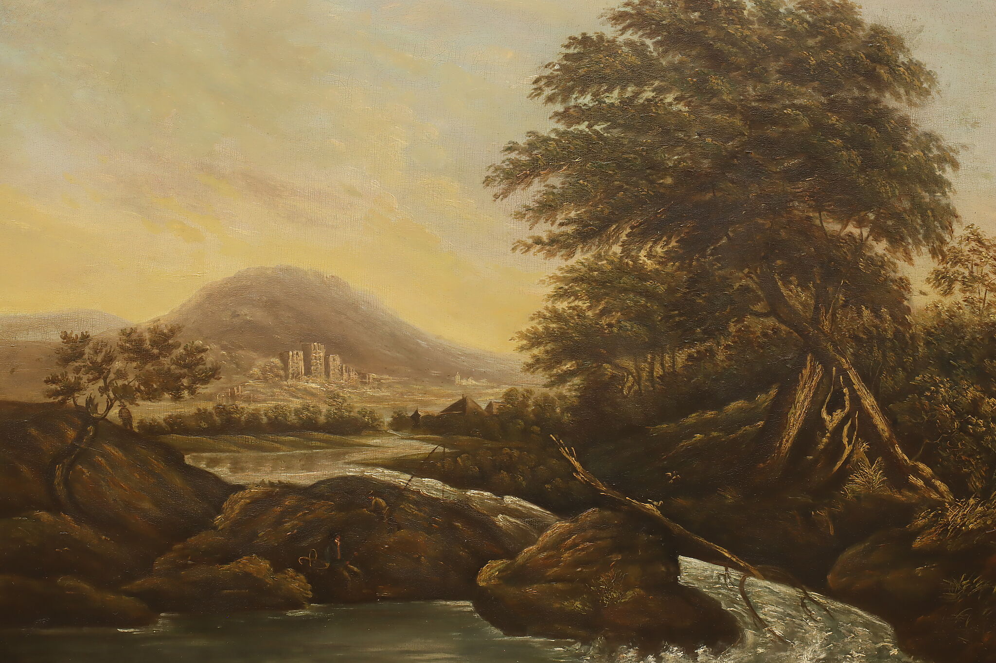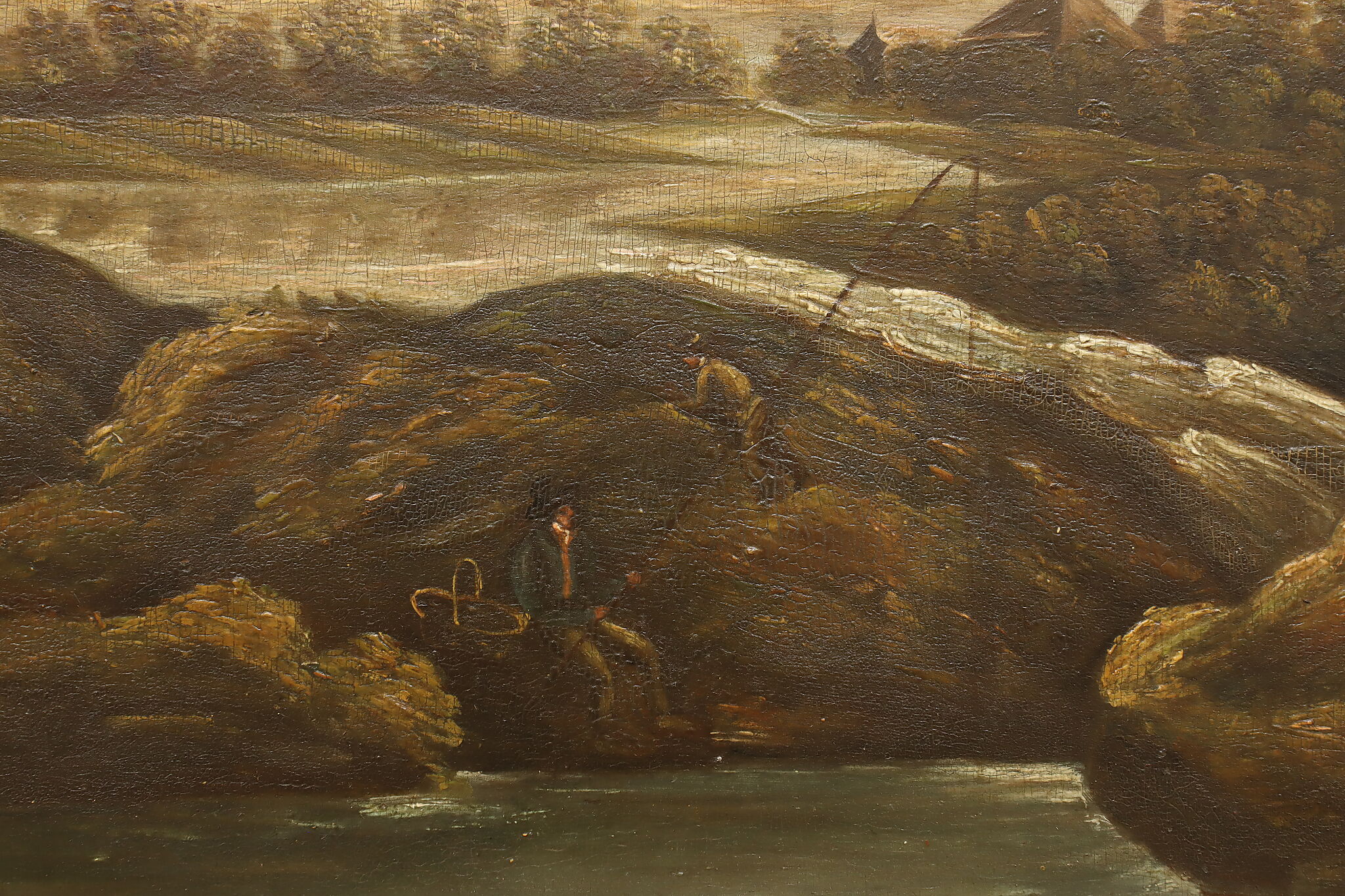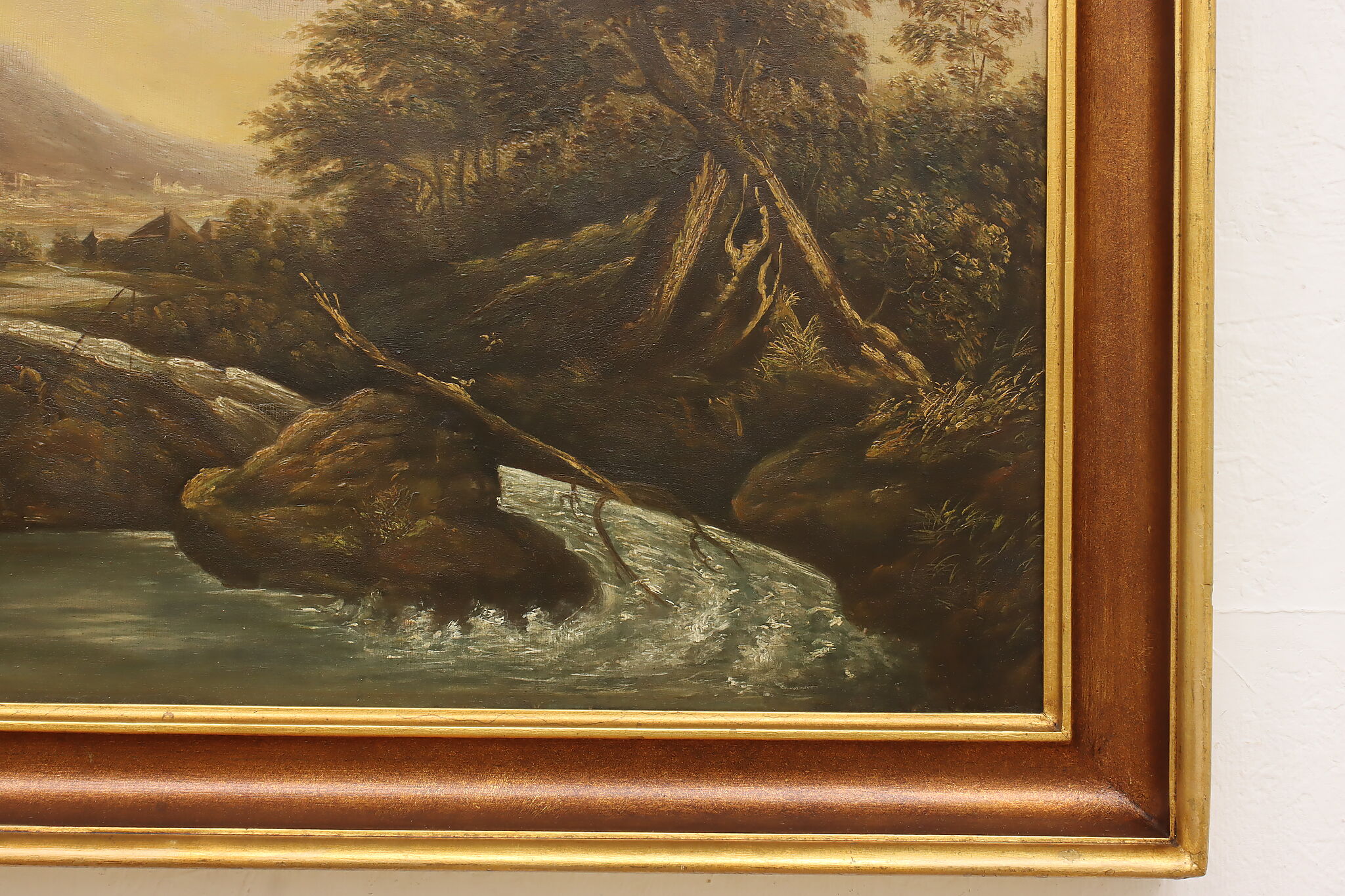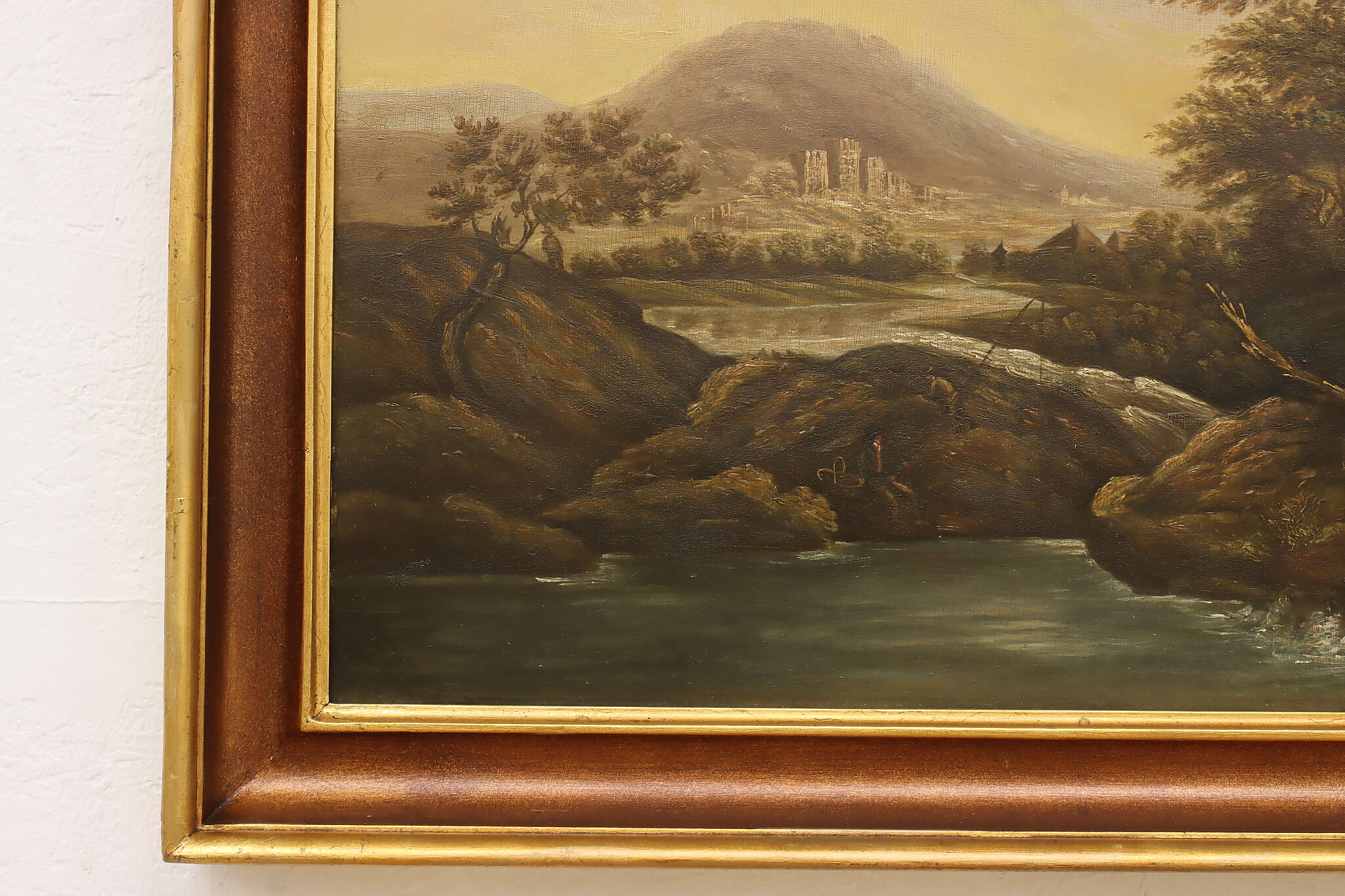 A beautiful landscape painting of the English countryside has two gentleman enjoying their day fishing.
