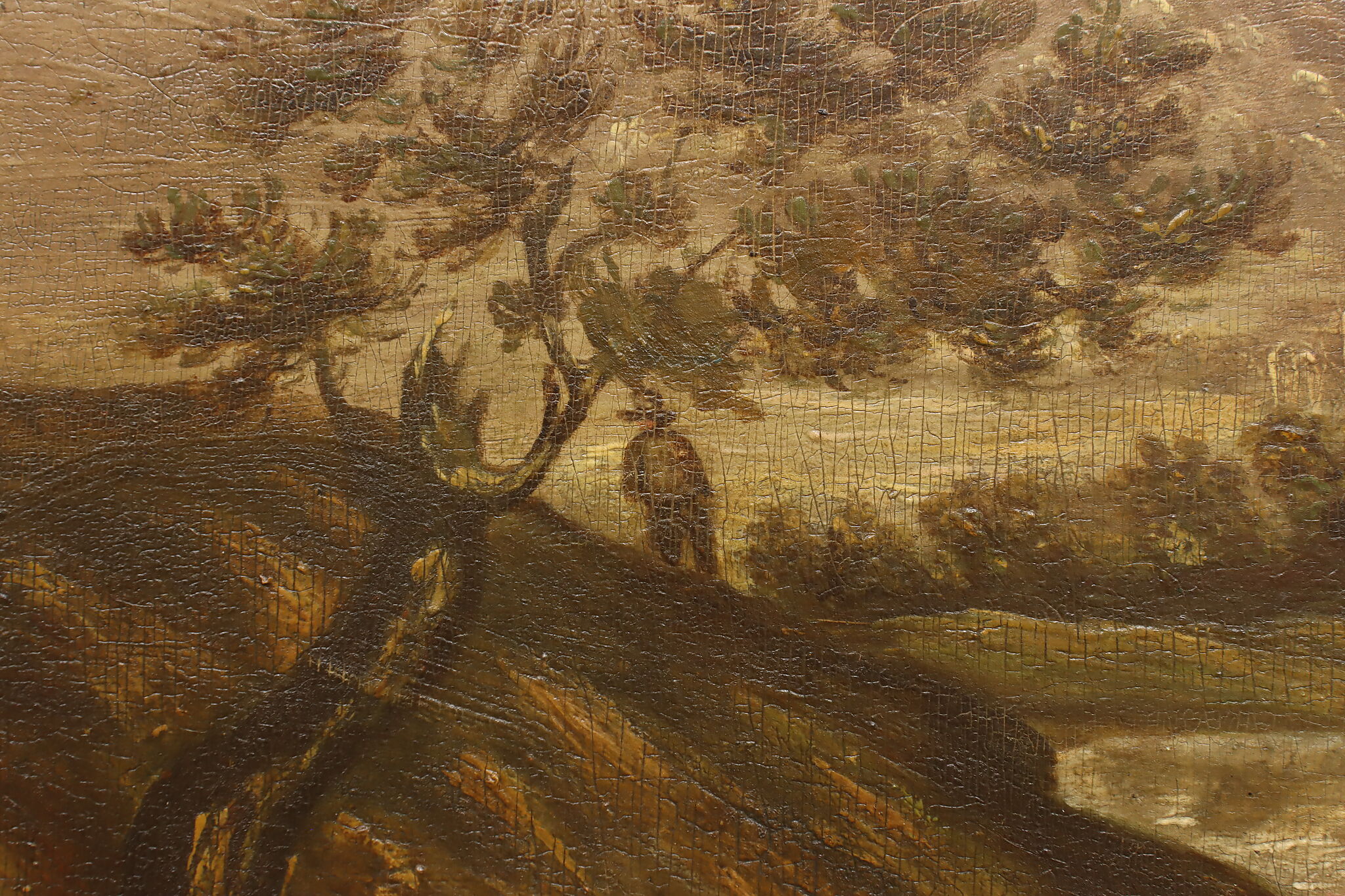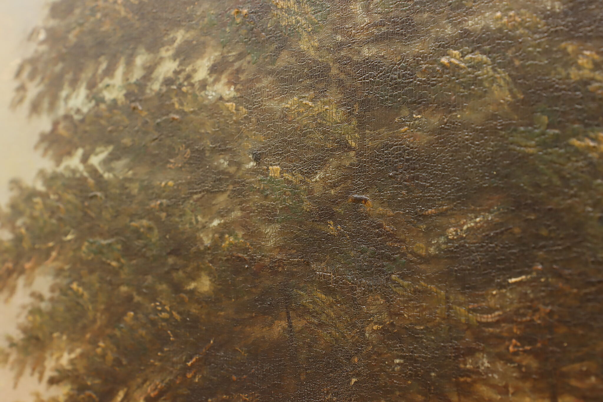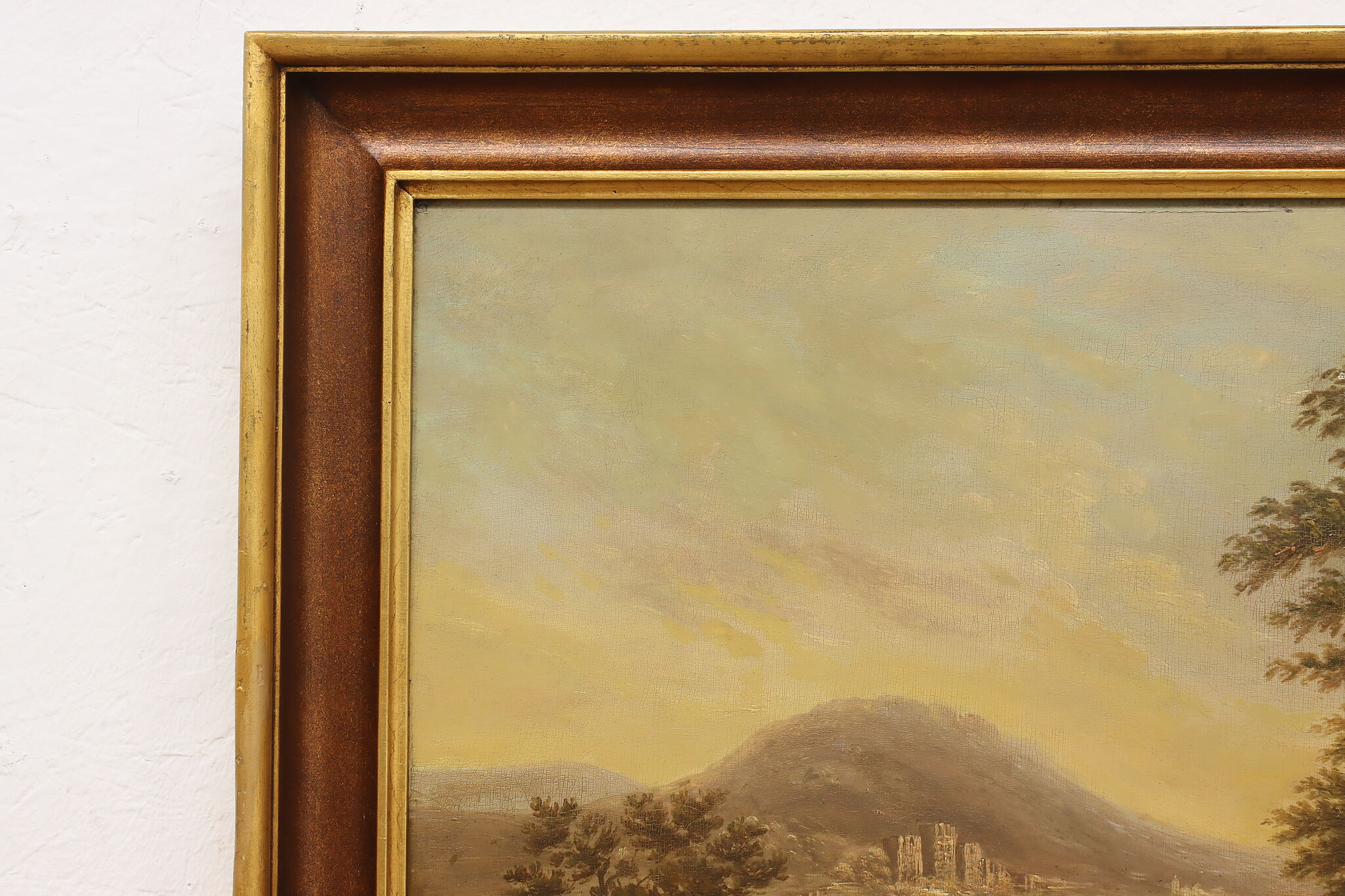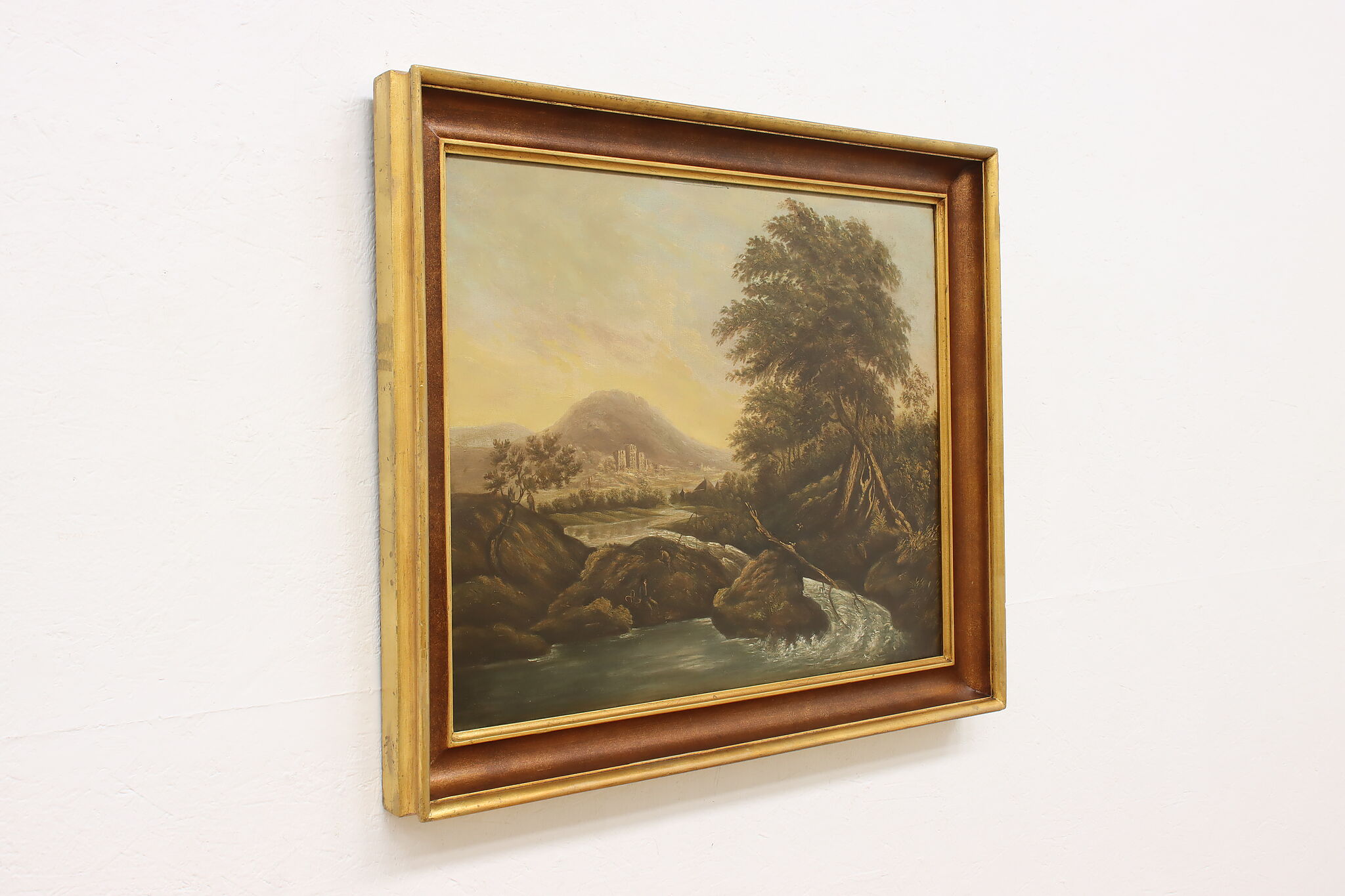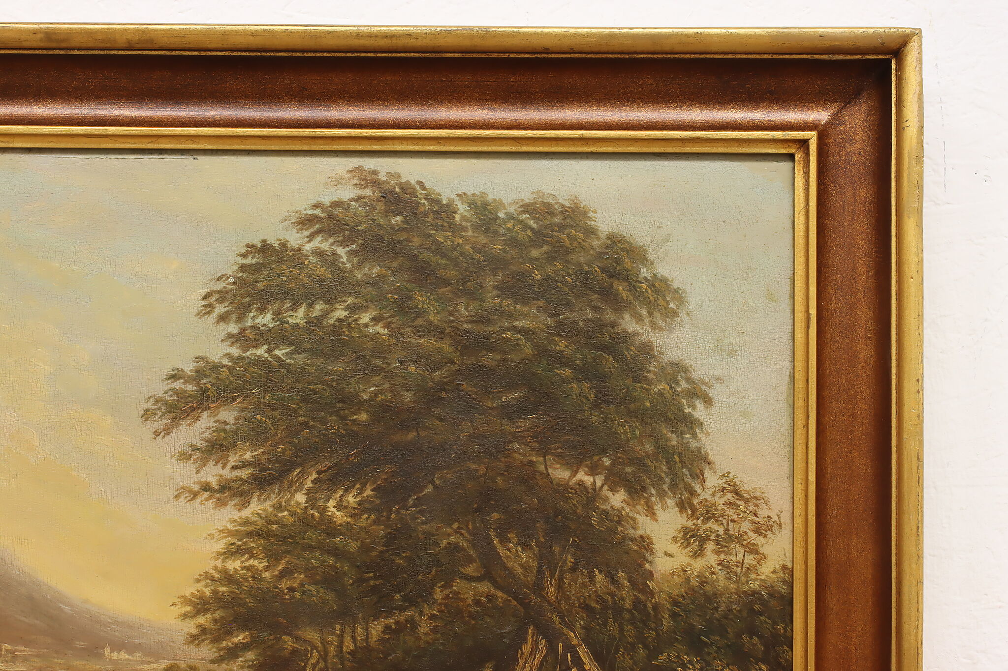 A beautiful landscape painting of the English countryside has two gentleman enjoying their day fishing.