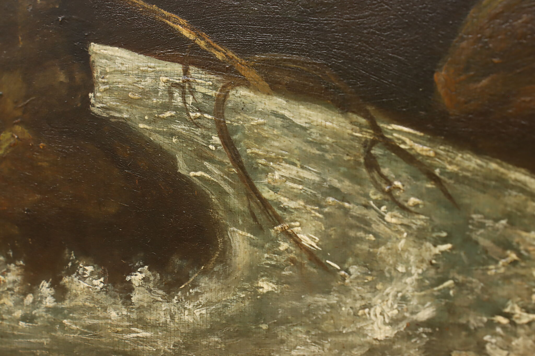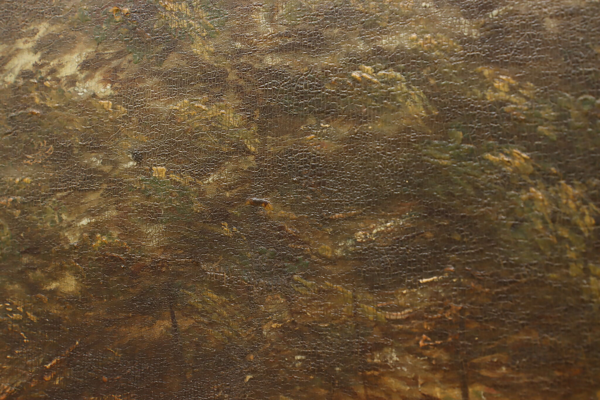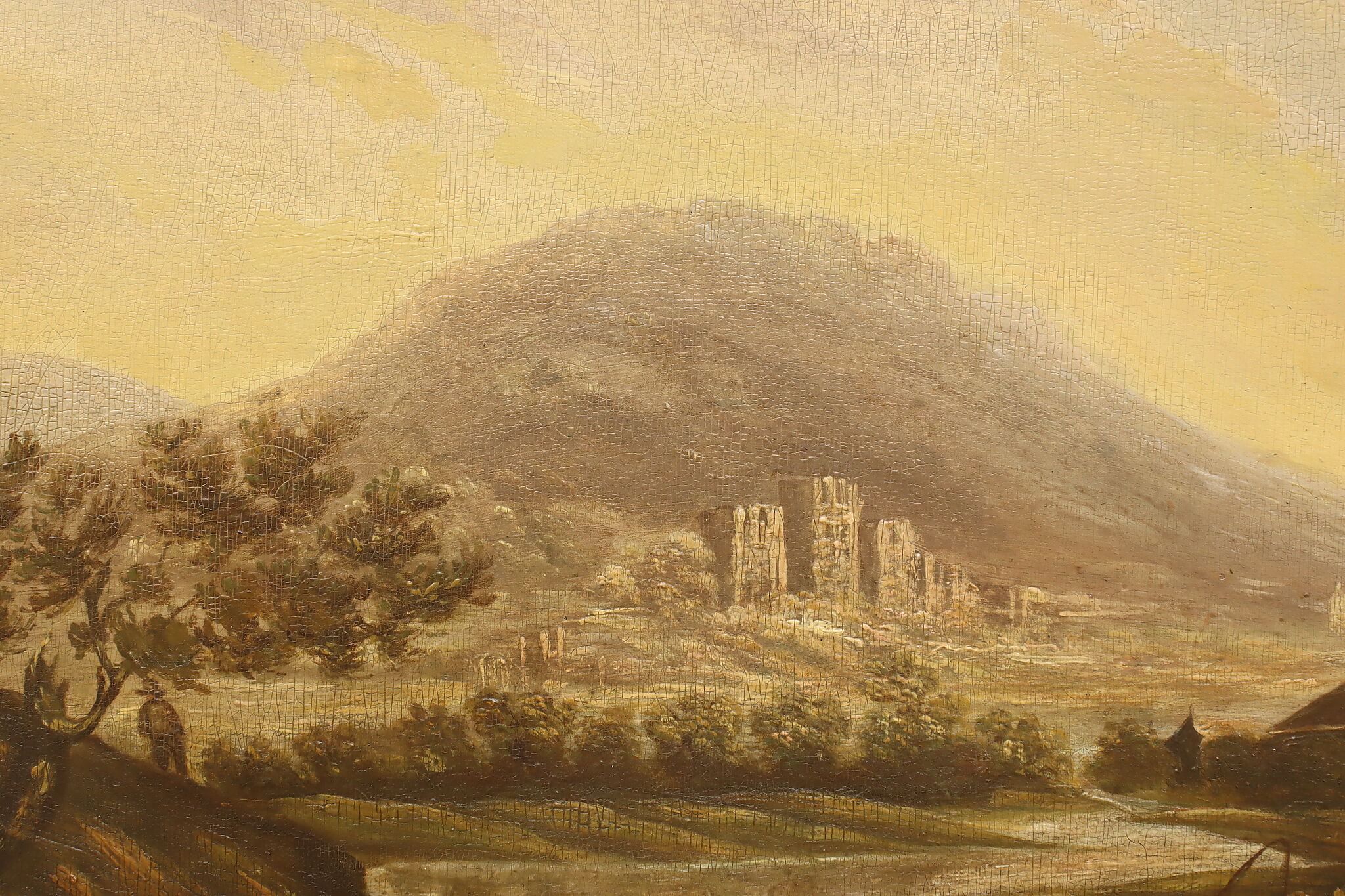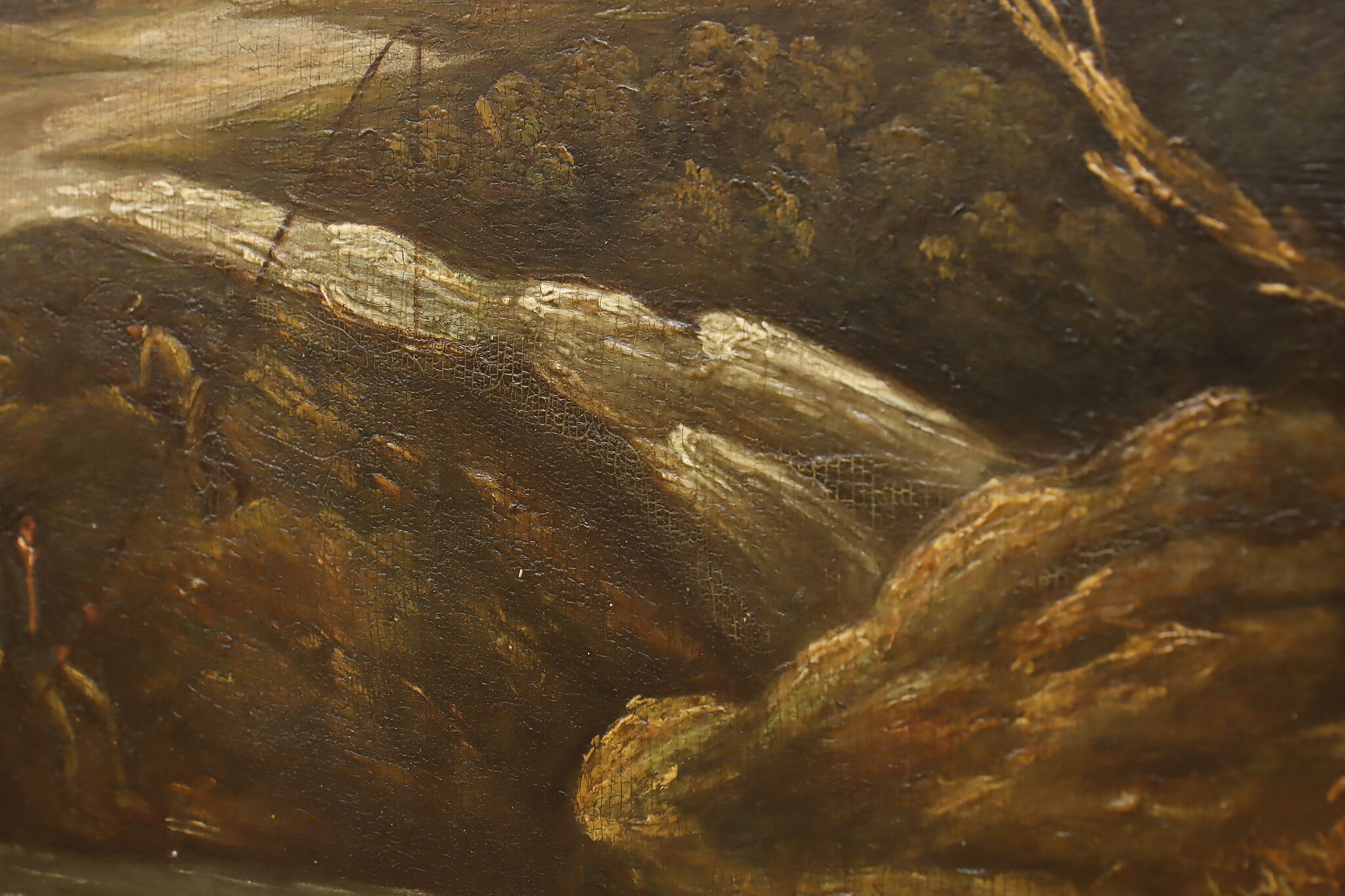 A beautiful landscape painting of the English countryside has two gentleman enjoying their day fishing.