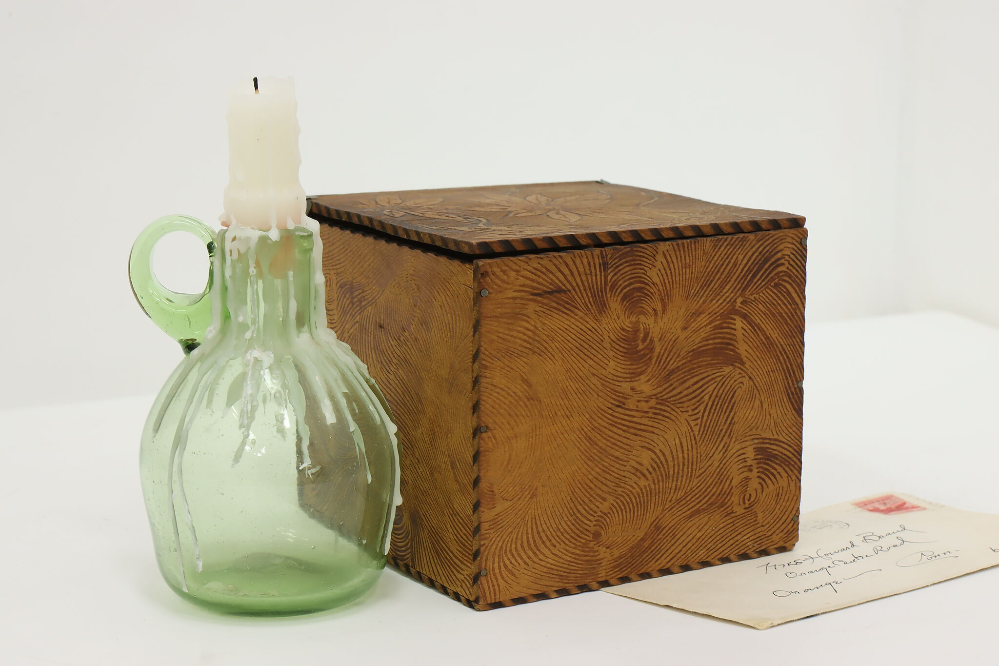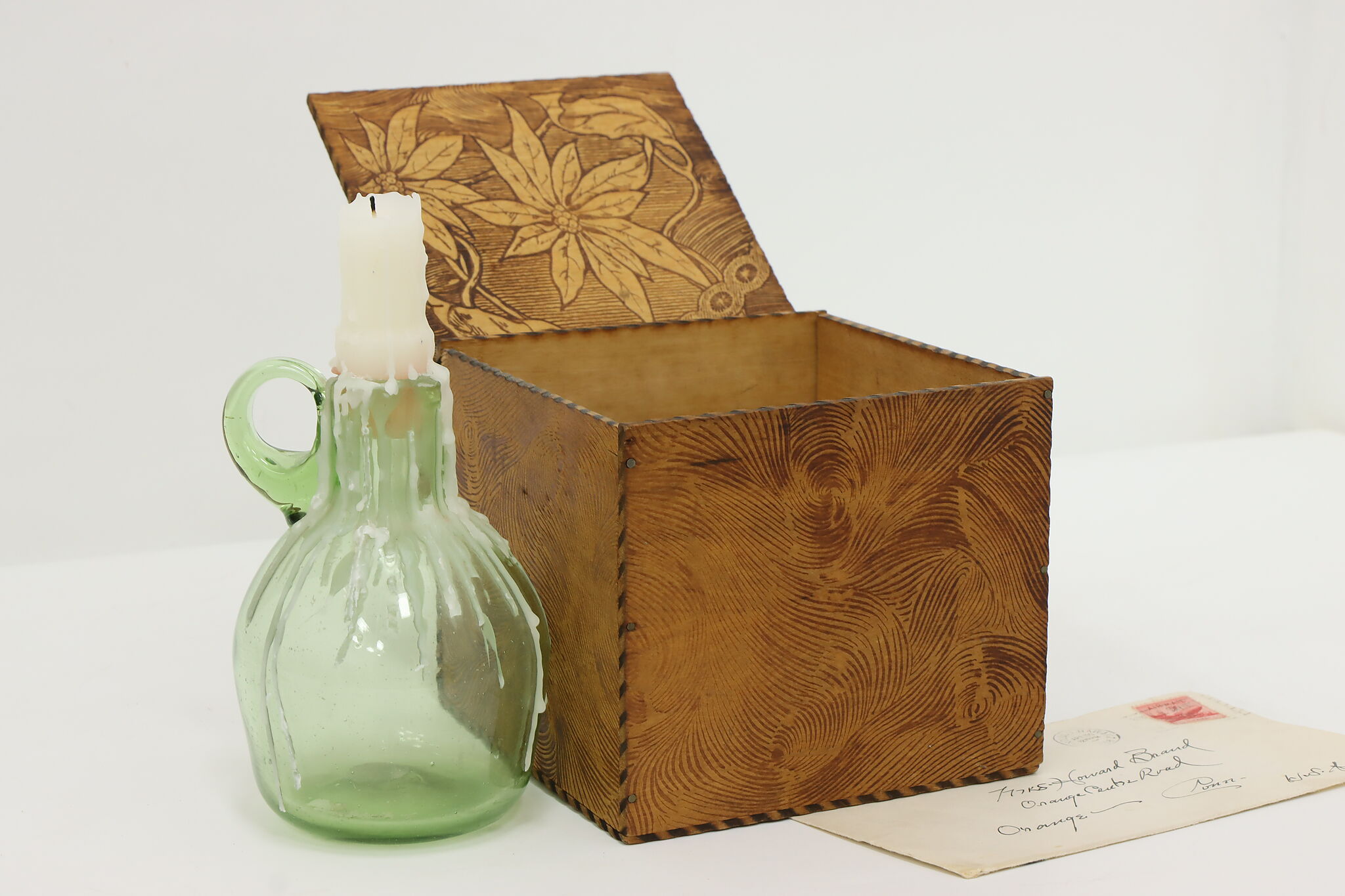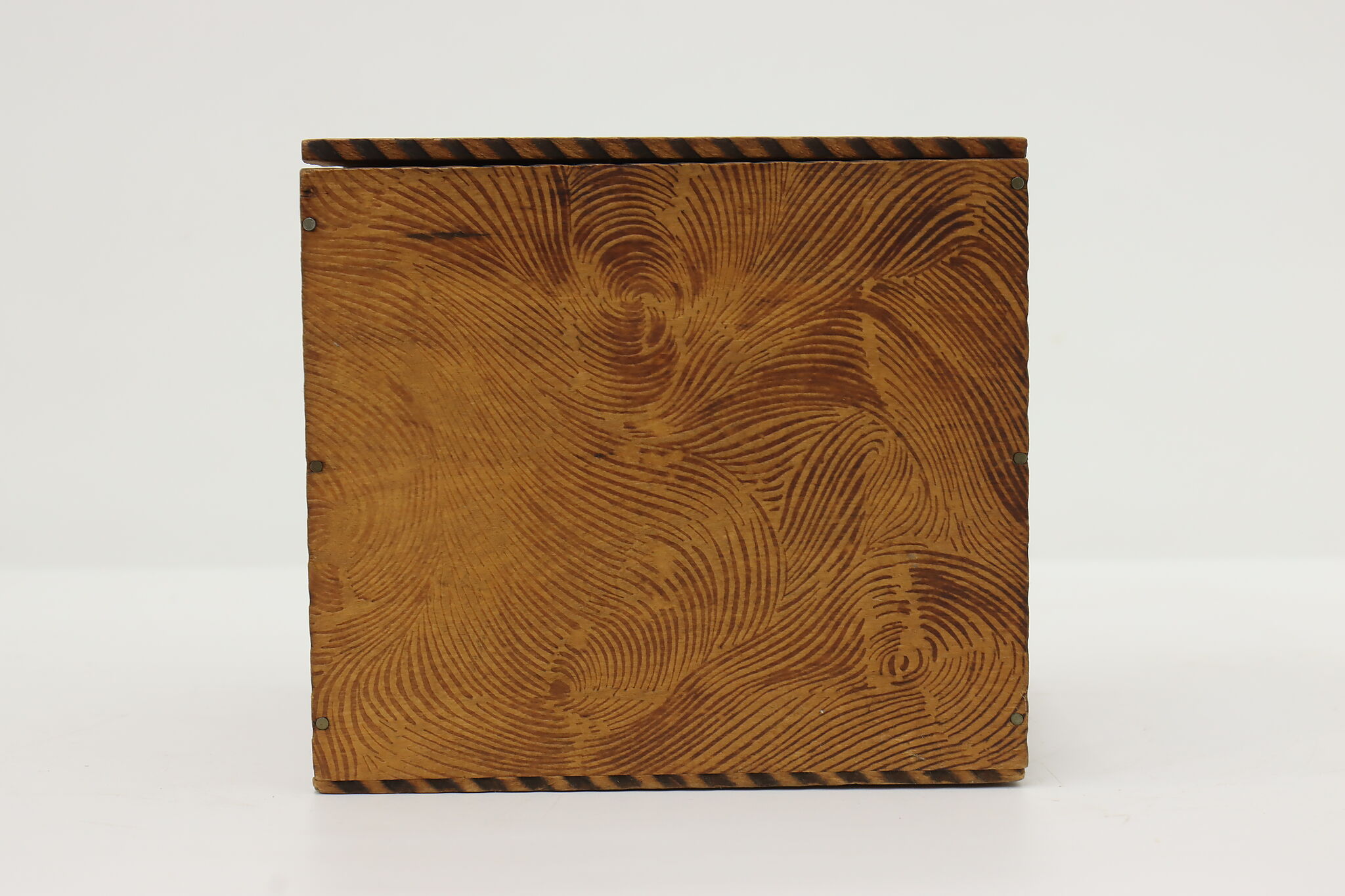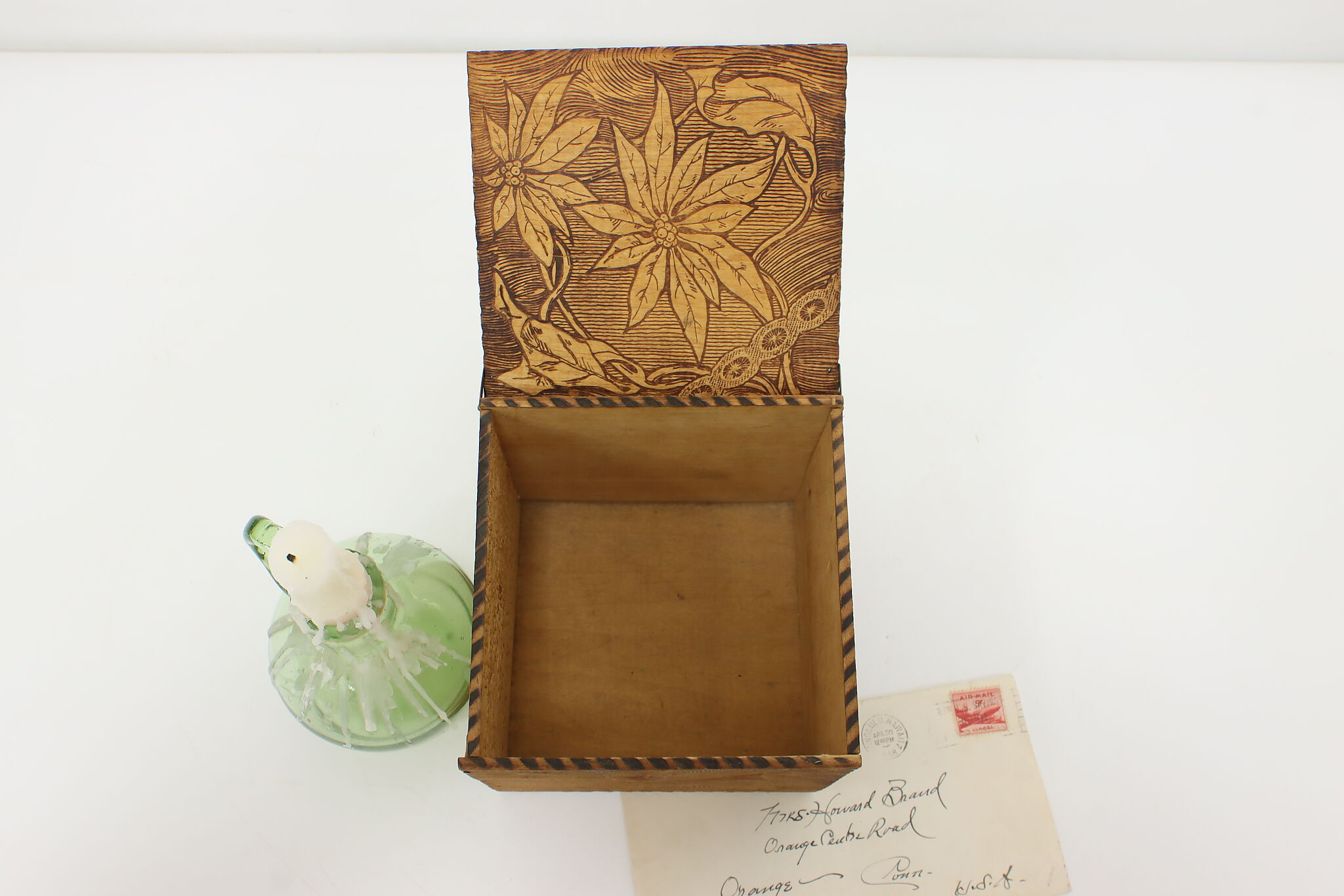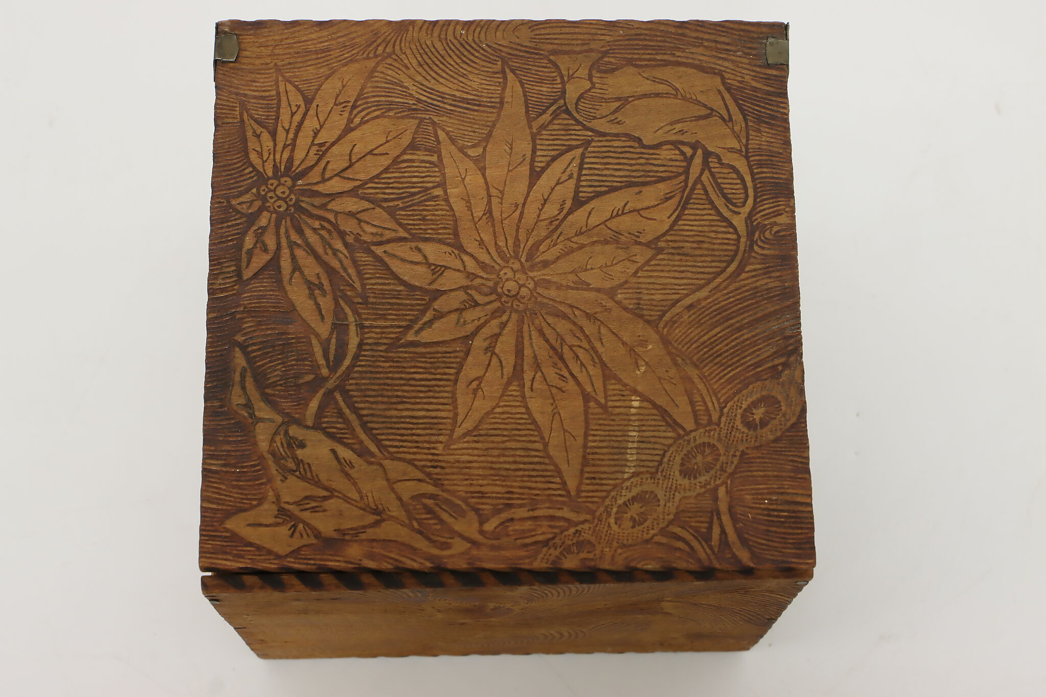 Charmingly handcrafted, this jewelry or keepsake box has beautiful "burned wood" or pyrography flowers.