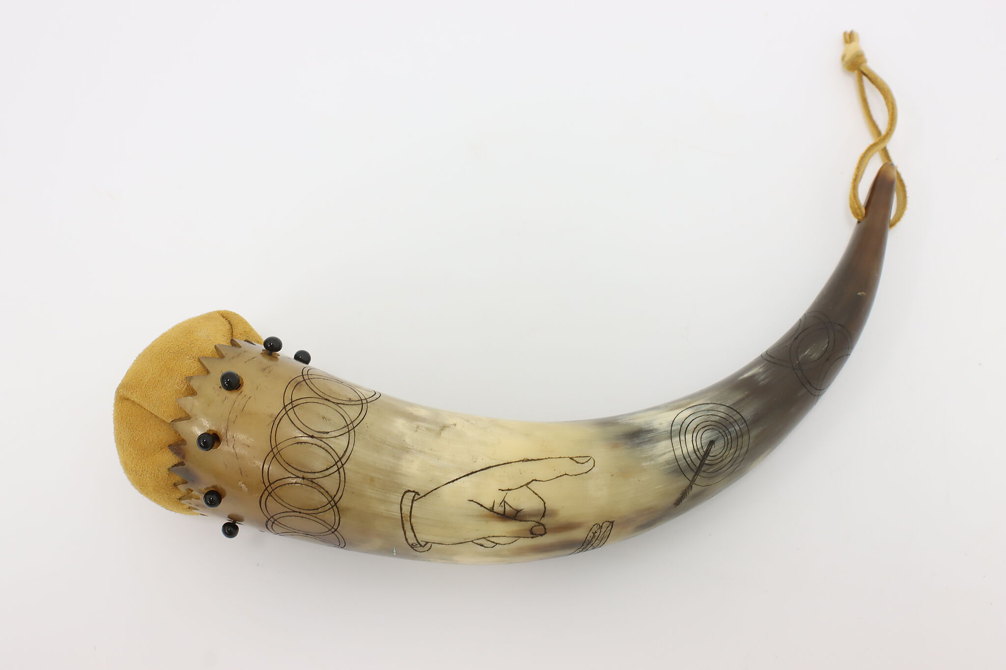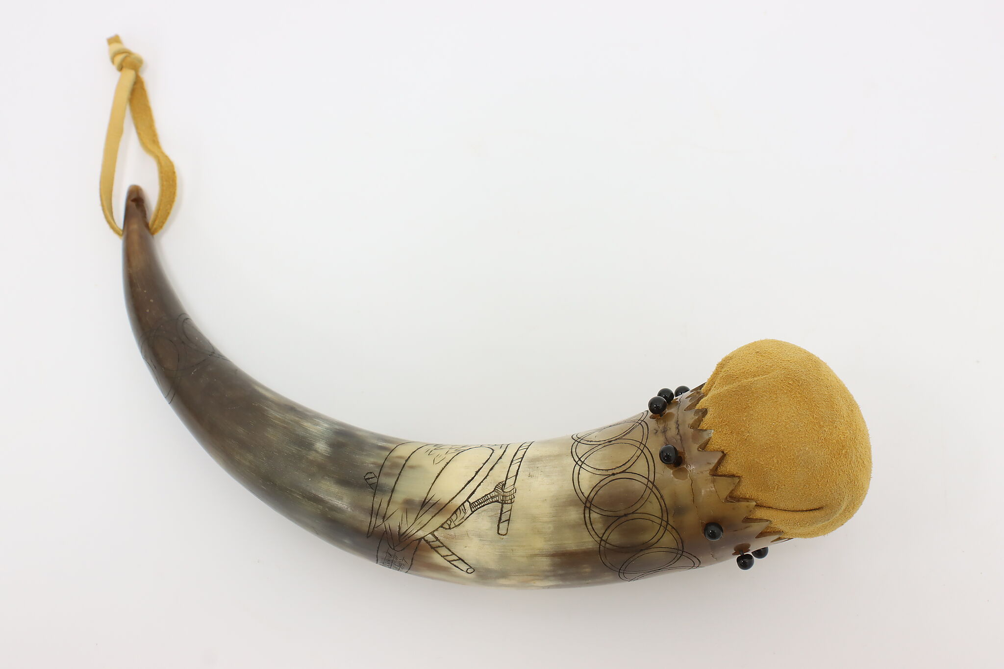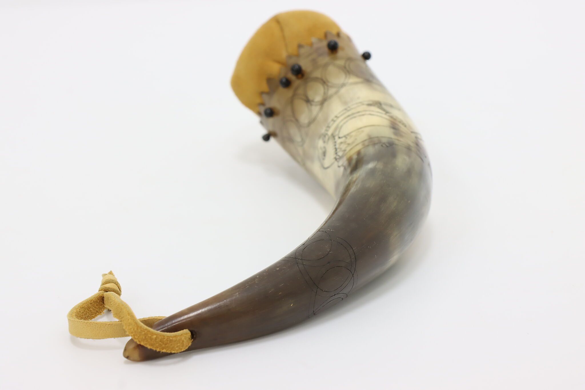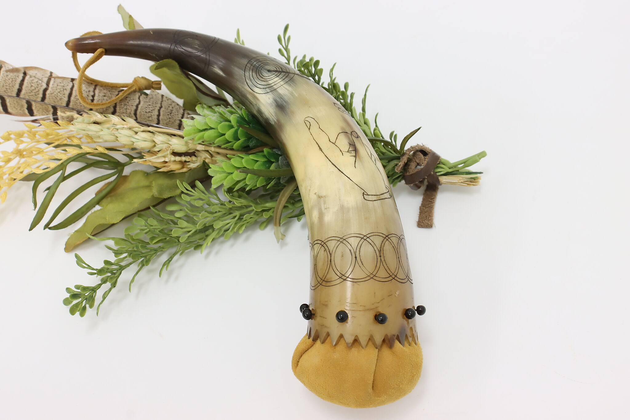 This unique decor piece is an unknown animal horn with engraved detailing and leather accents.