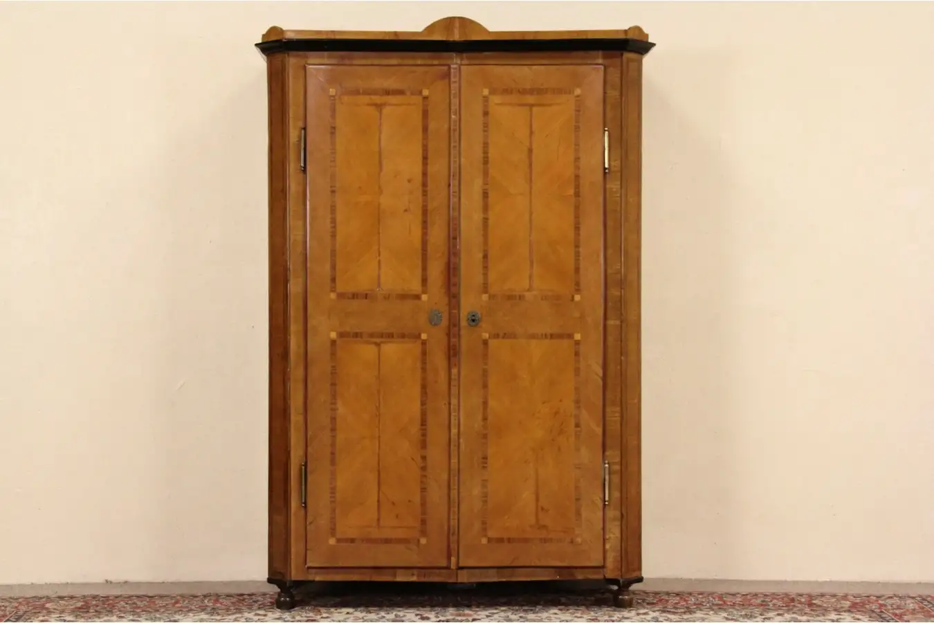 Fruitwood with inlaid kingwood and ebony banding, the old finish is well preserved with warm patina on this European antique furniture. However, there are numerous dings, losses at the edges, shrinkage separations and warps from age, see photos.
