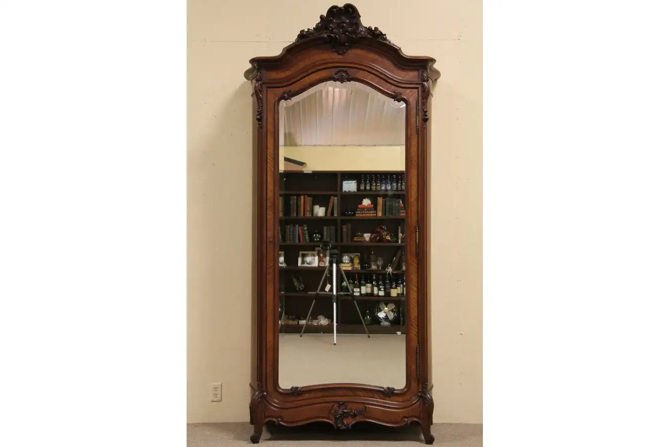 Artfully hand carved in France about 1890, a single door armoire has gently curved sides and an original shaped and beveled mirror door. Delicate details carved in solid mahogany are set off with diamond matched panels.