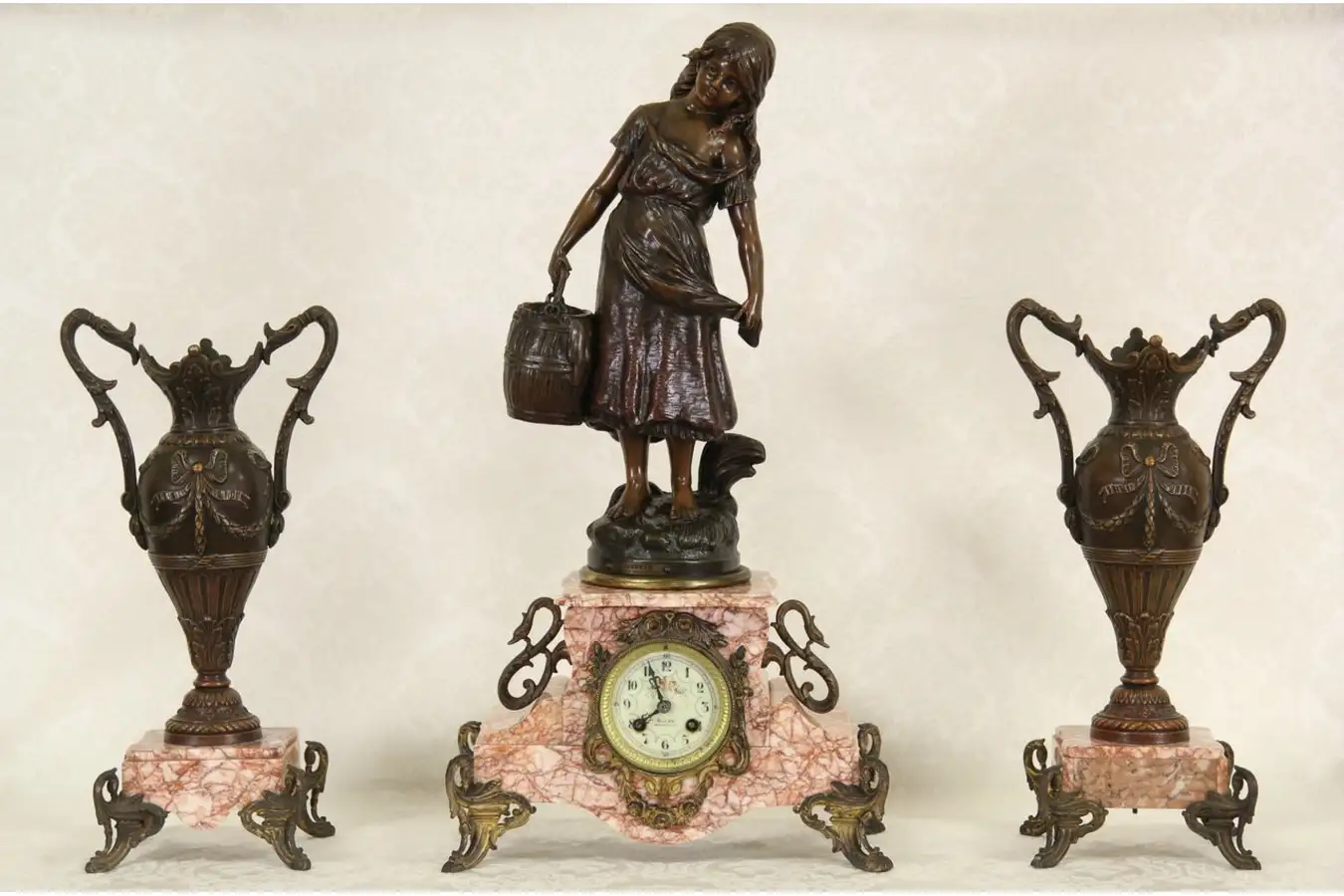 An exquisite French three piece marble mantel clock set from the 1890's includes a signed sculpture,"Cosette" from "Les Mis," after the famous book, "Les Miserables" of Victor Hugo. The statue and side urns are "spelter" or white metal alloy, similar to pewter, that has an original patinated bronze finish.
