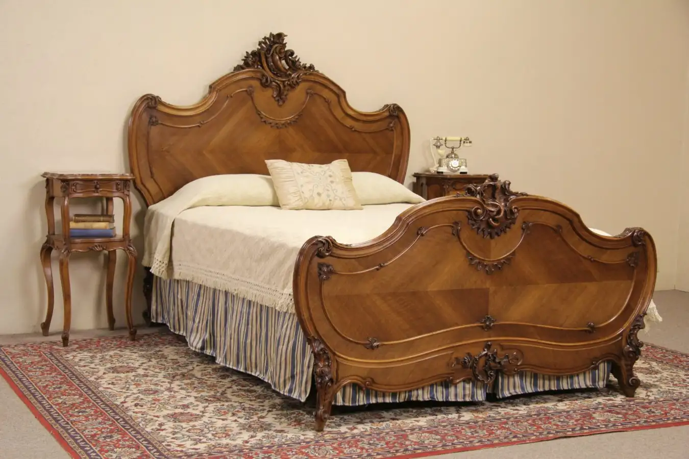 Waxed and buffed, all that is needed to maintain its warm patina is an occasional wipe with a soft dry cloth. The diamond matched panels are beautiful. Side rails are modern steel adapted to fit a standard modern queen size mattress and spring unit as shown in pictures. Wood slats underneath are included.