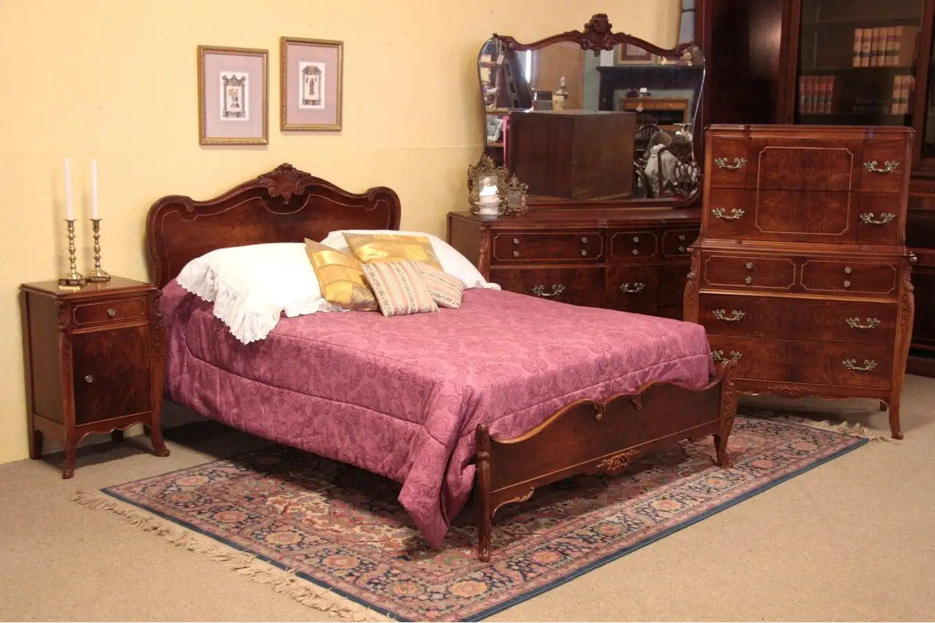 Serene elegance distinguishes a four piece French style bedroom set from about 1940, including a full or double size bed, night stand, large dresser with mirror and tall chest on chest. This wonderful vintage furniture is glowing walnut with matched burl drawer fronts and subtly carved details, all in wonderful condition.