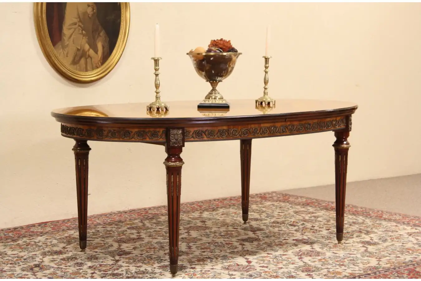 A magnificent oval dining table was beautifully crafted in France in the 1940's, and is all original. Cast bronze mounts are intact on this palatial vintage furniture. Under the table is a signature by the maker, "Ehalt of Fegersheim near Strasbourg," see photo.