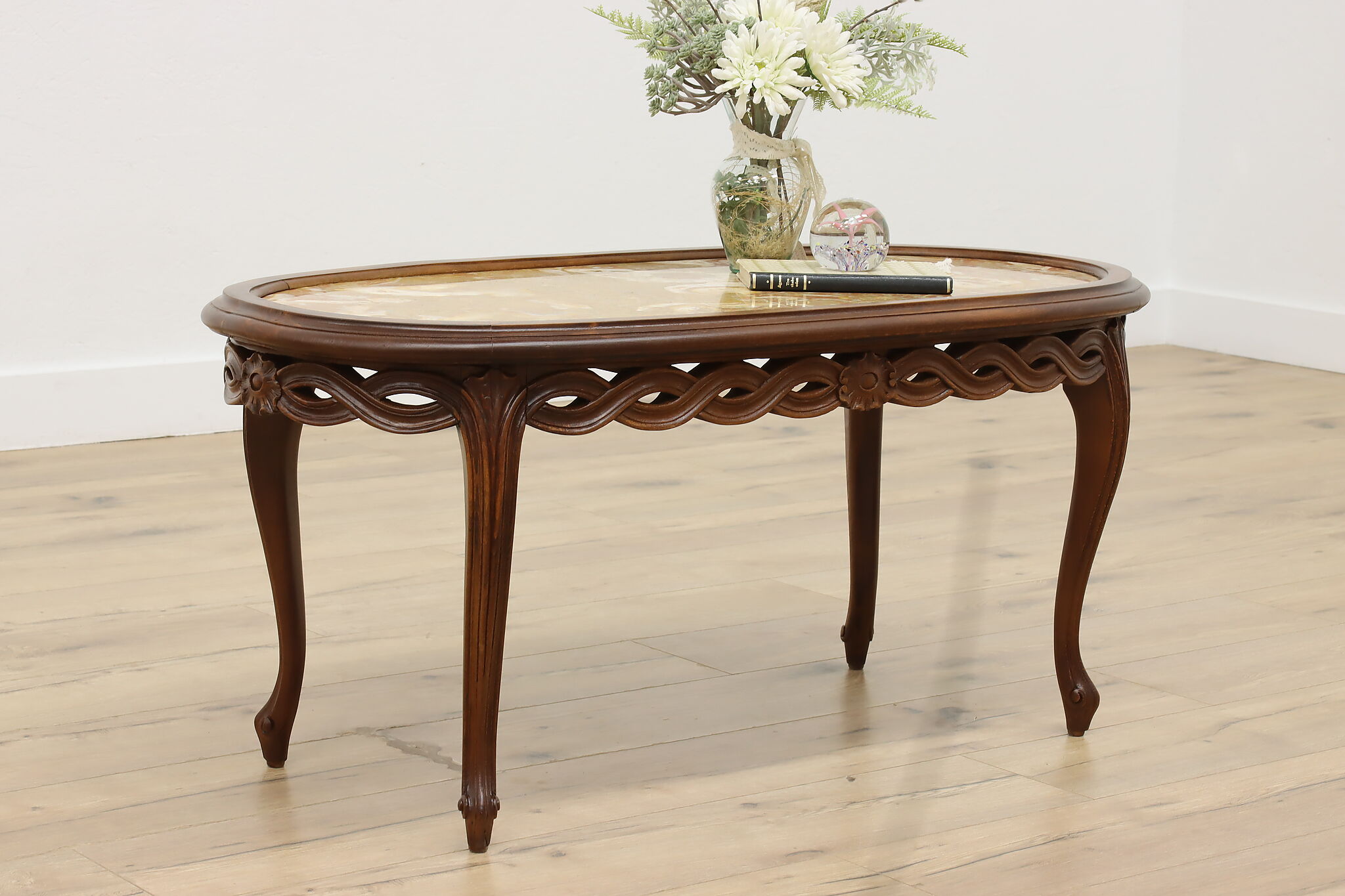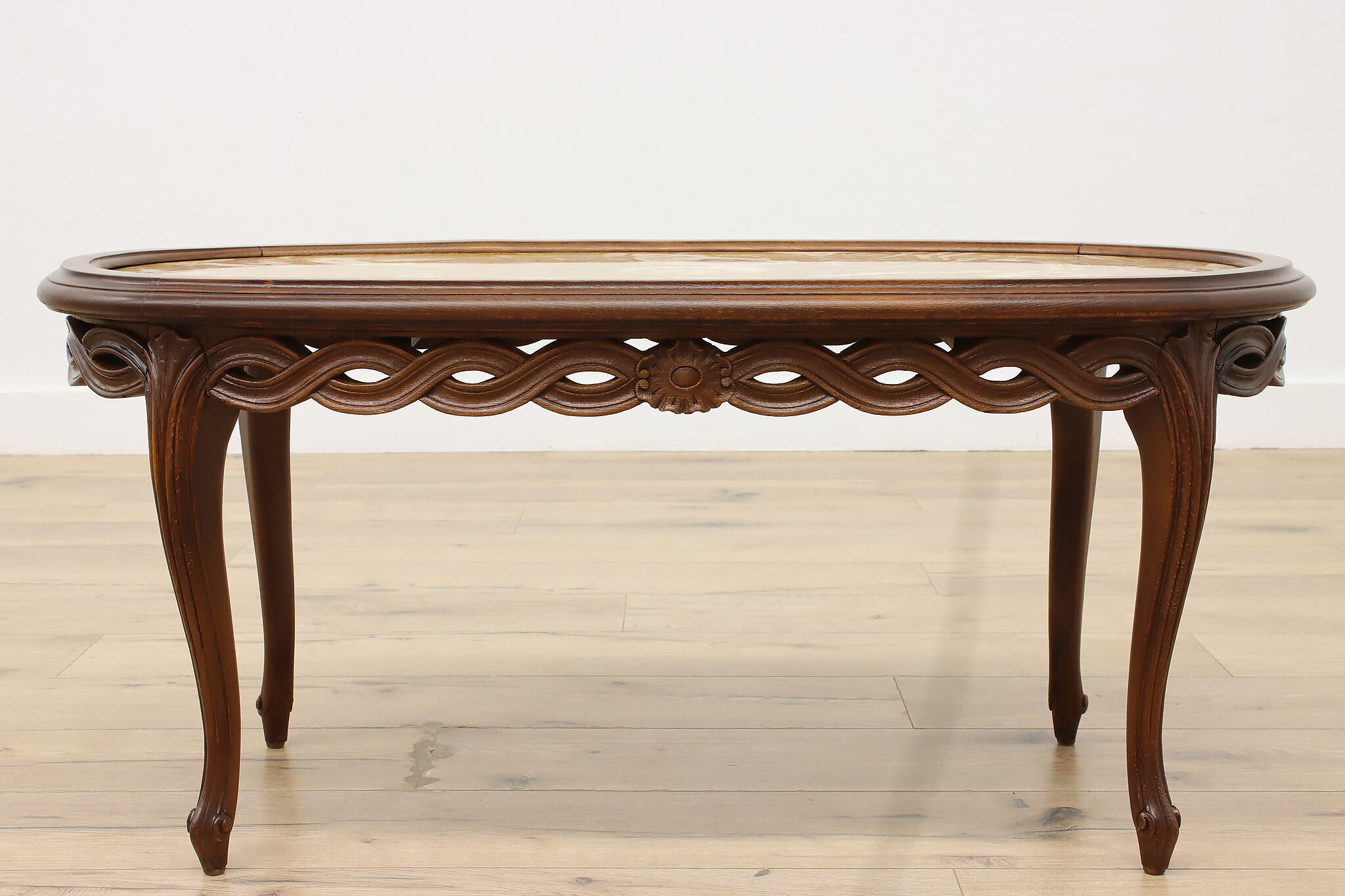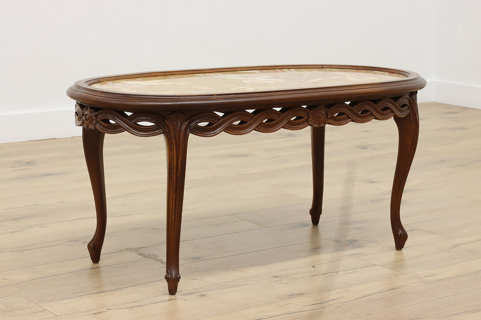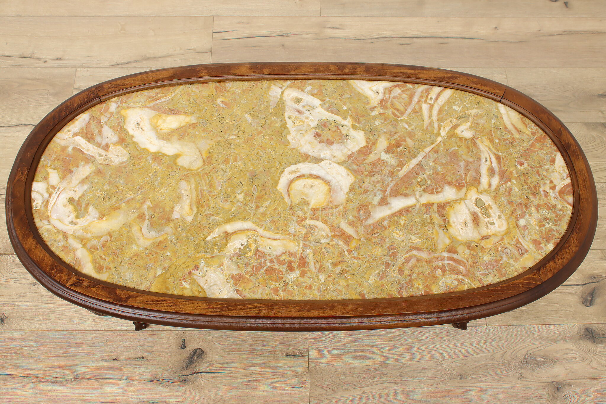 This lovely French coffee table has a beautiful "Lumachella" marble top, with many fossils and bold colors.