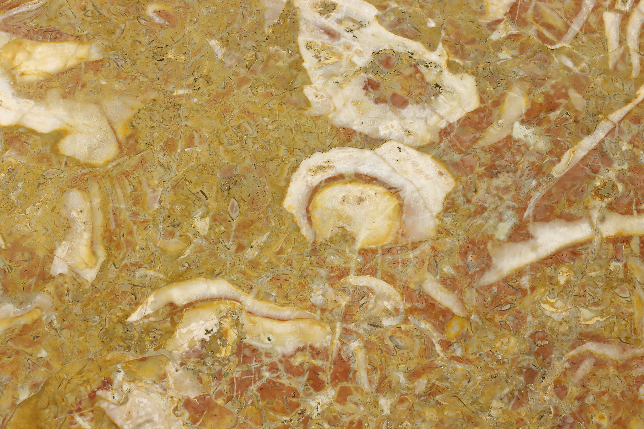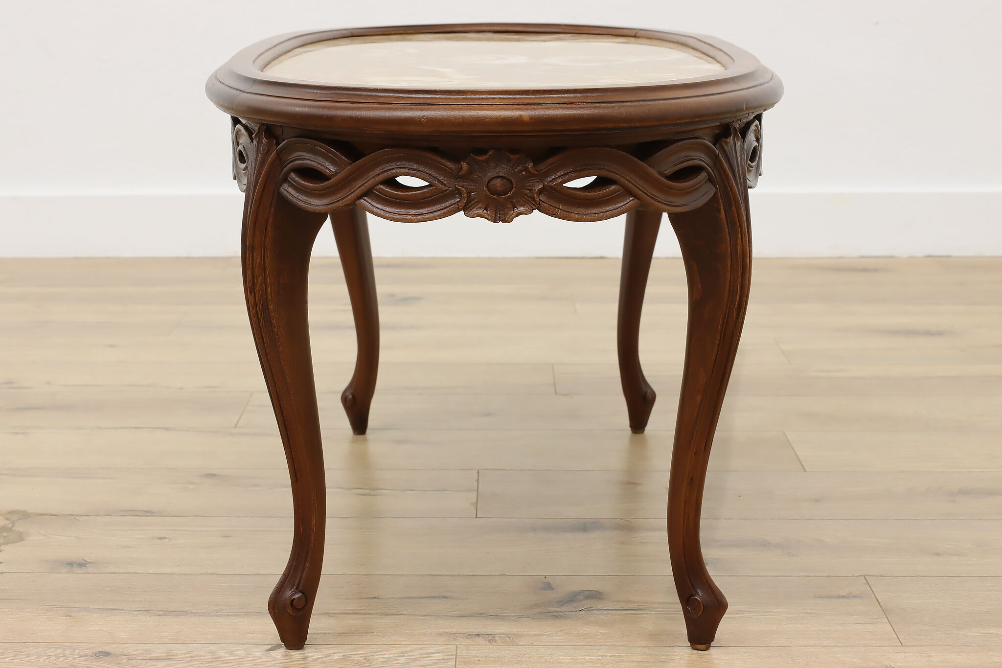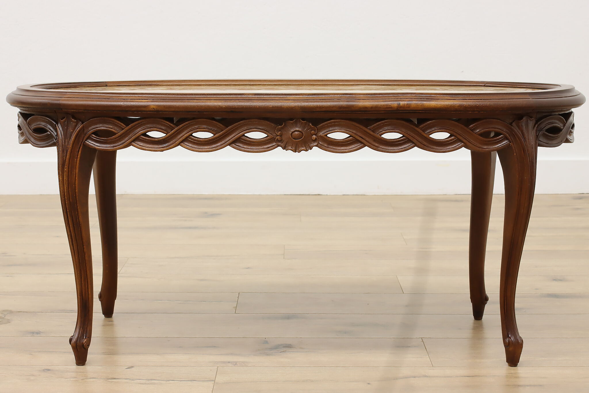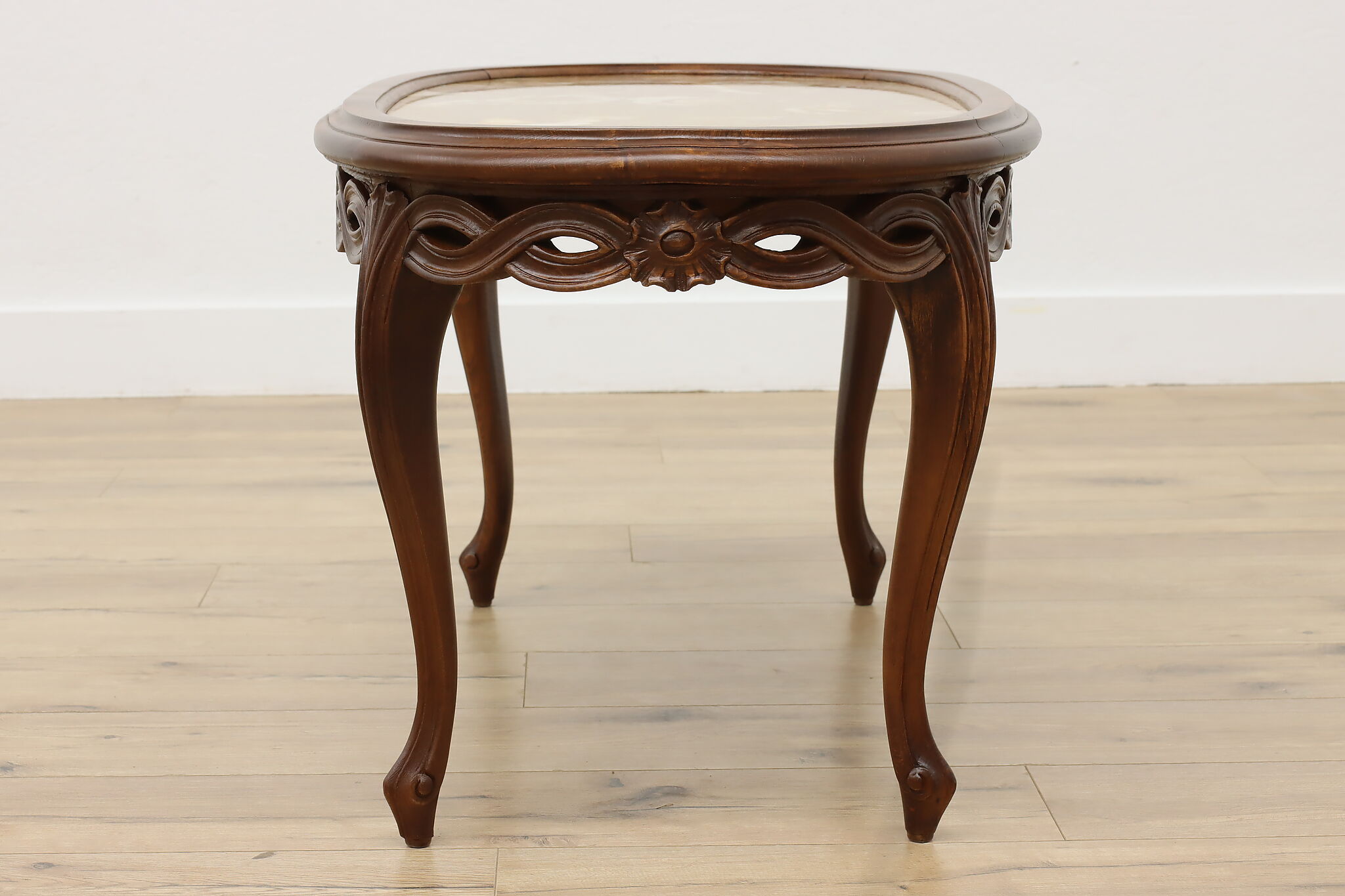 This lovely French coffee table has a beautiful "Lumachella" marble top, with many fossils and bold colors.