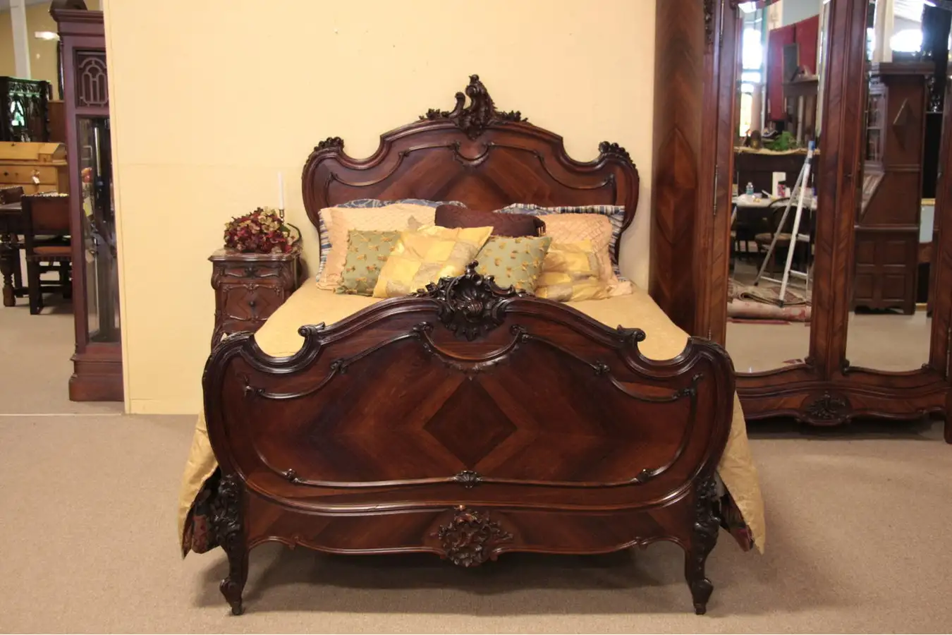Furniture dating from the 1890's, measurements of this exquisite antique furniture are 5'4" wide, 7'5" long, the headboard is 5'6" tall and the footboard is 42" high. Companion pieces in photo are sold.