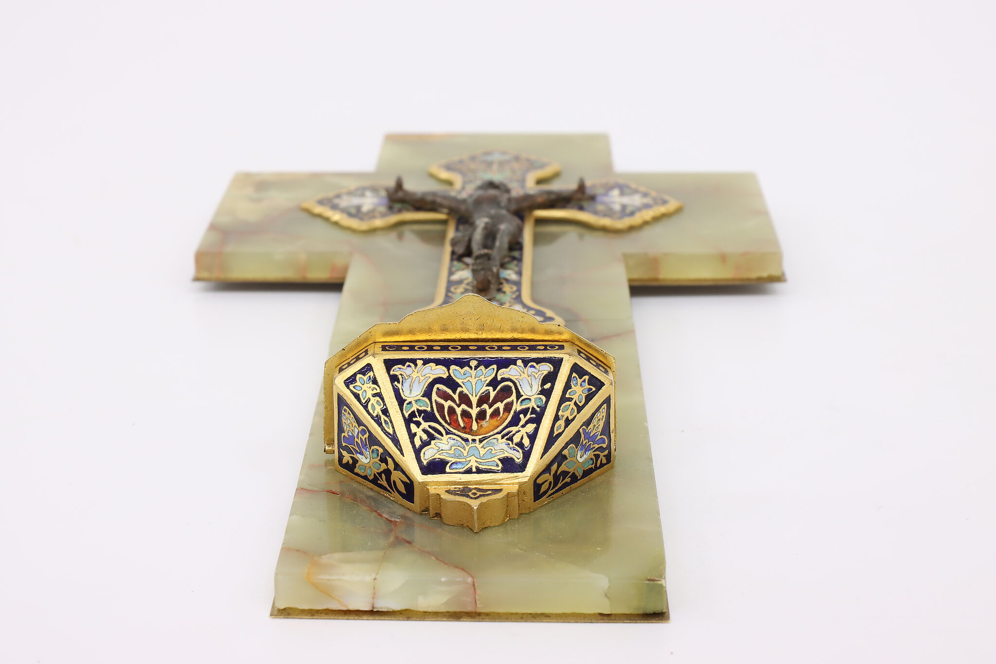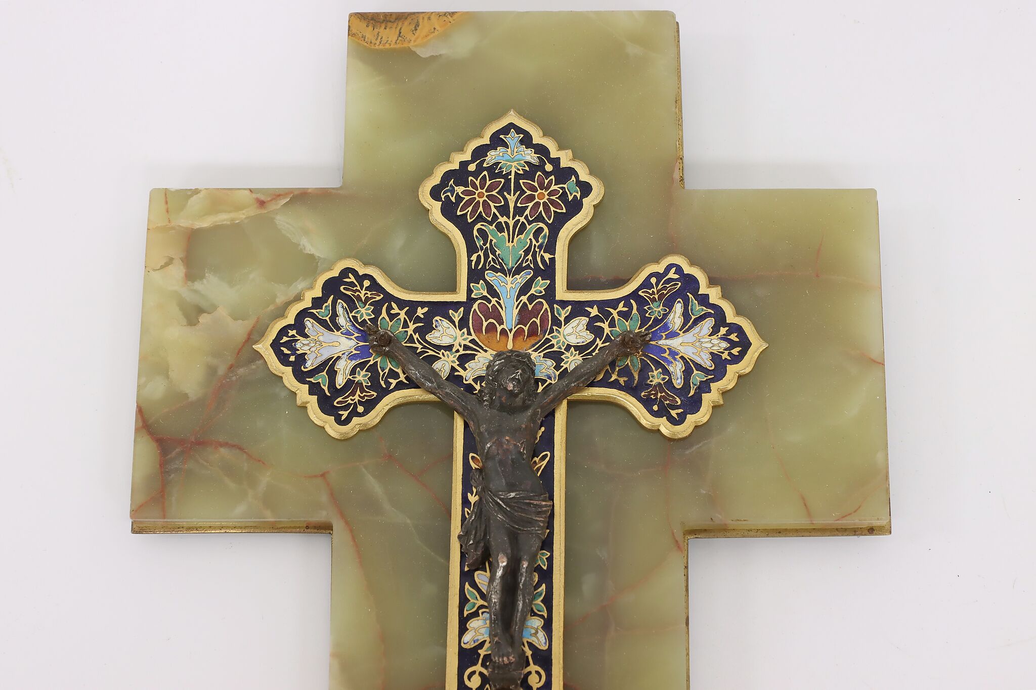 A wonderful French Champleve enamel crucifix with Jesus is mounted on an onyx cross.
