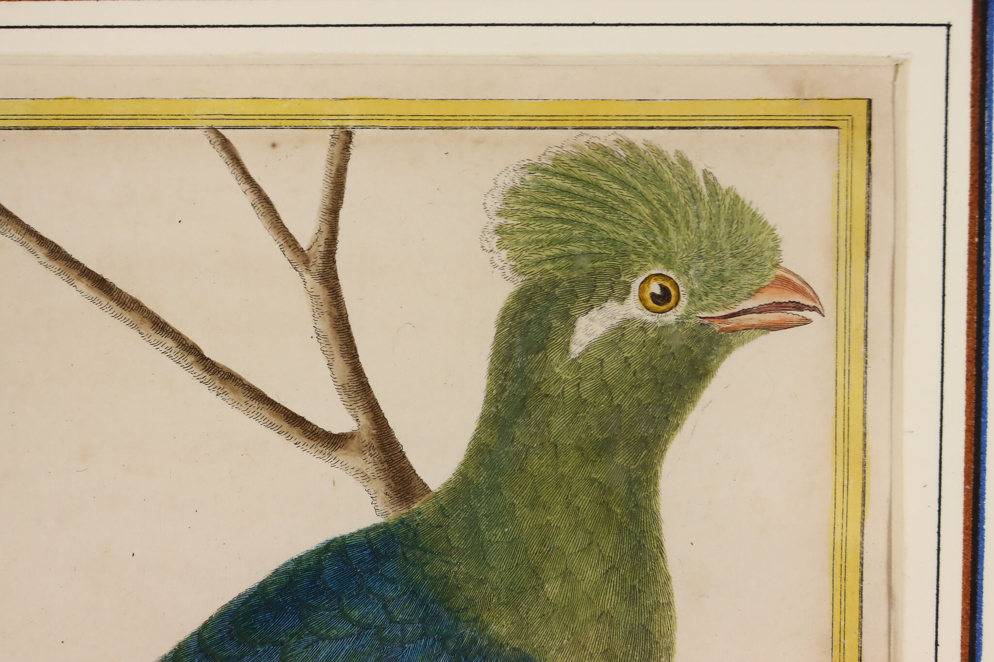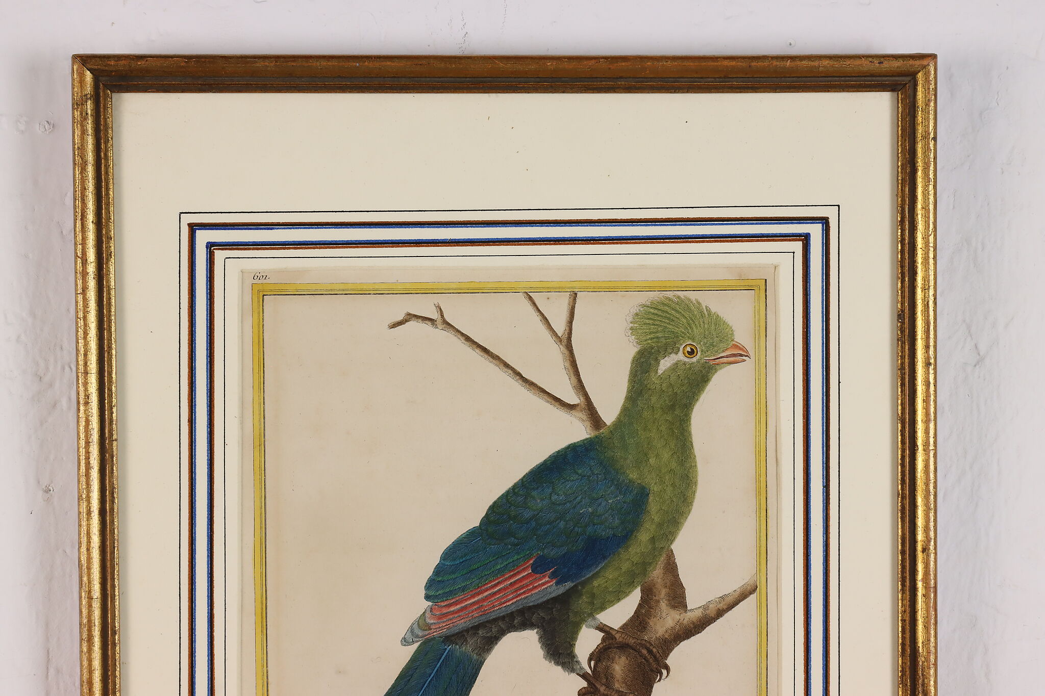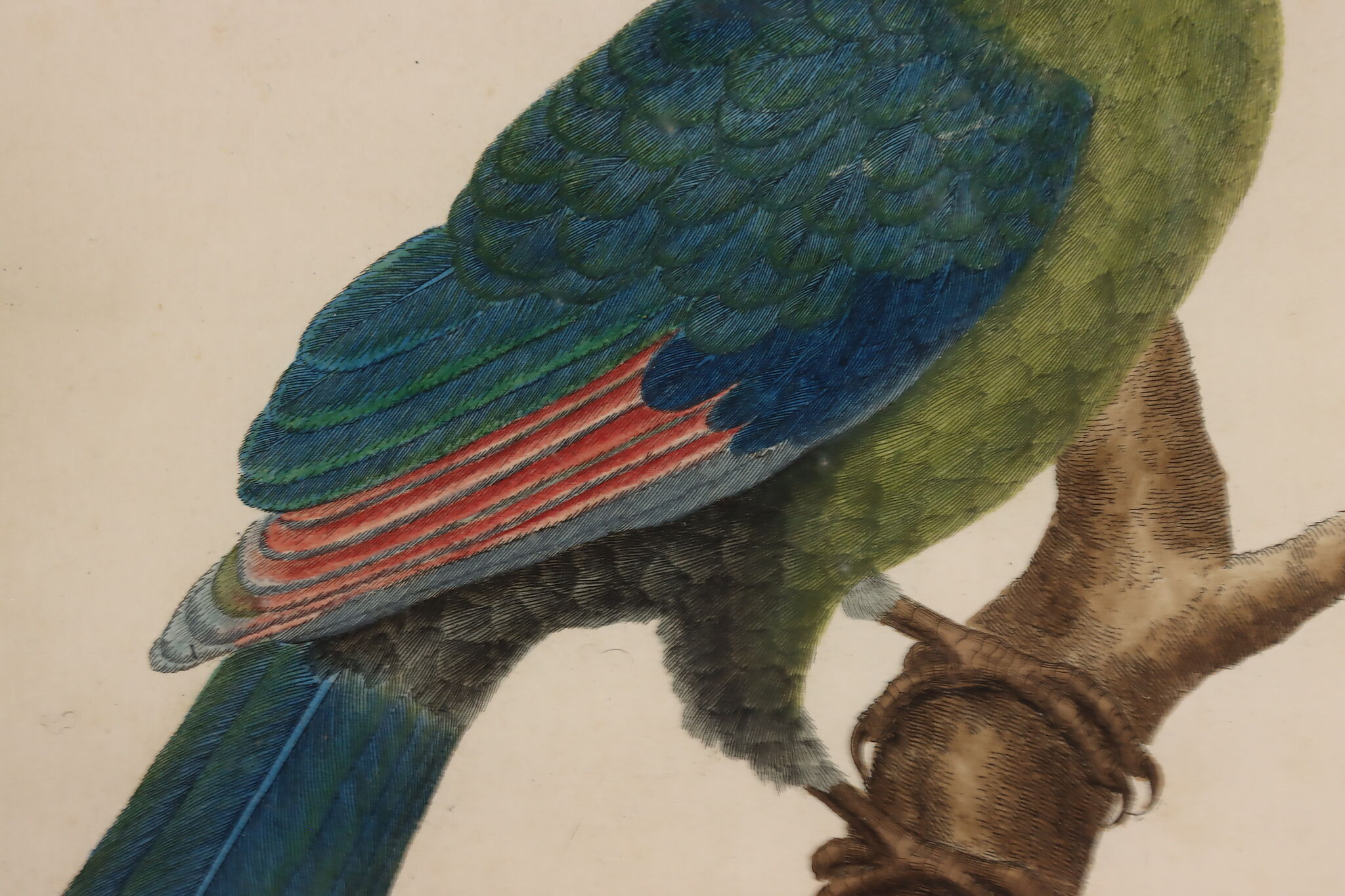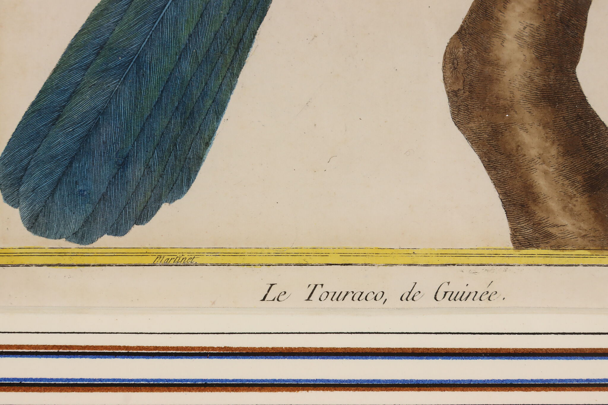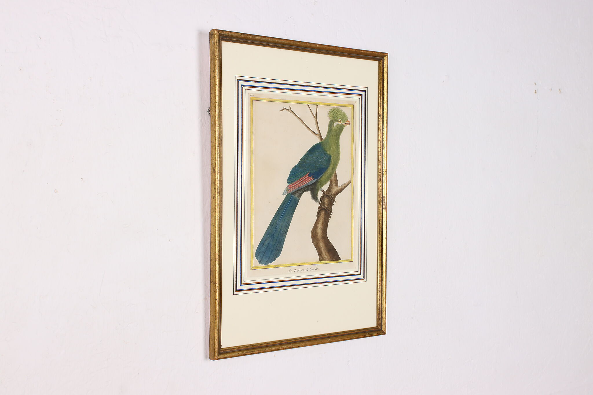 A fantastic hand-colored engraving of a green lourie bird is by French artist, François Nicolas Martinet, an engraver who helped illustrate the 18th century French encyclopedia, "Histoire Naturelle."