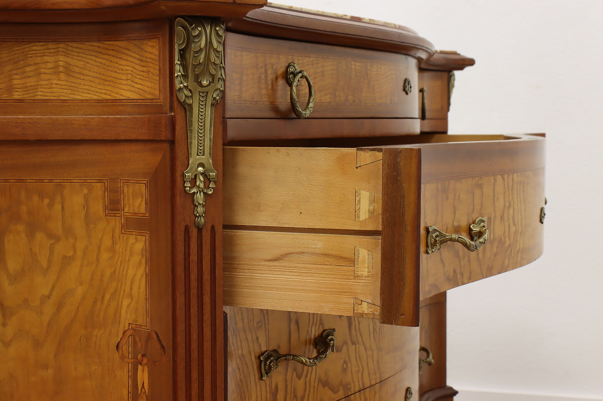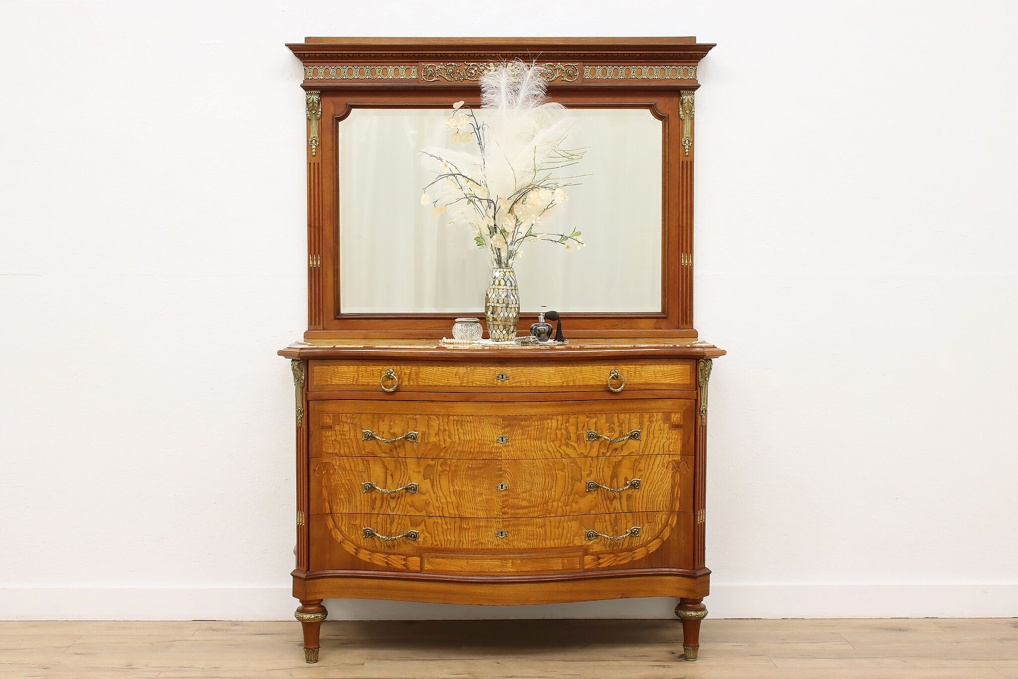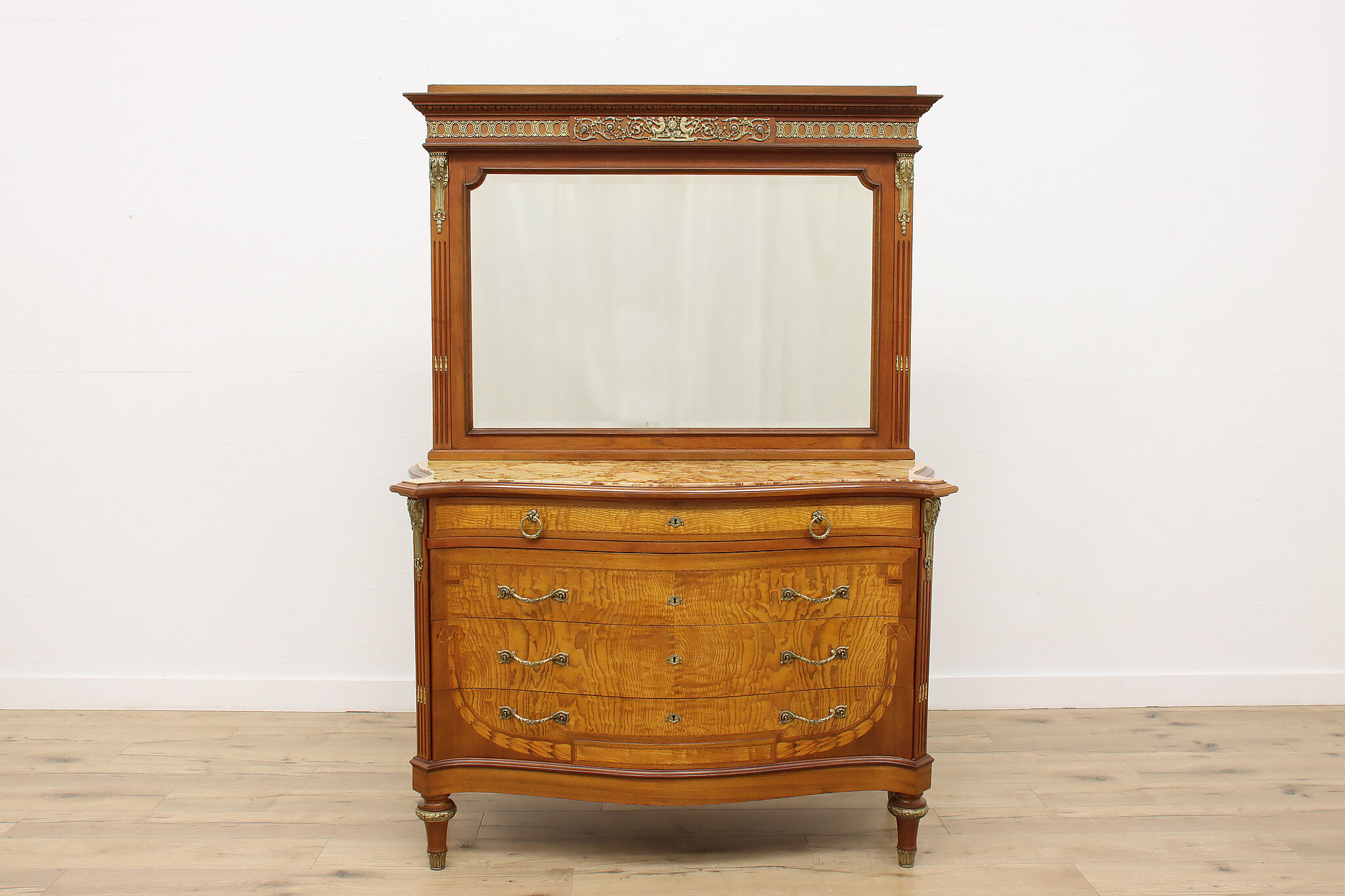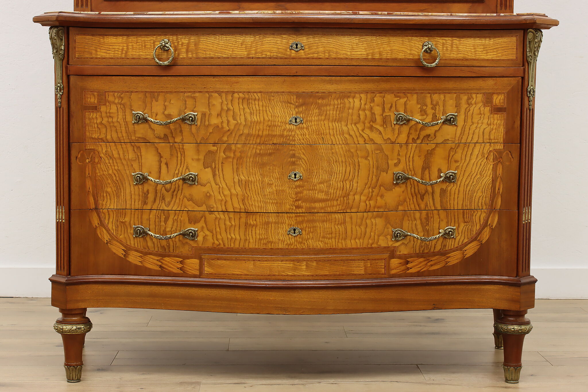 Master craftsman in France created this luxurious chest or dresser, adorning it with gorgeous inlaid marquetry and banding plus an ornate brass crest with cherubs.