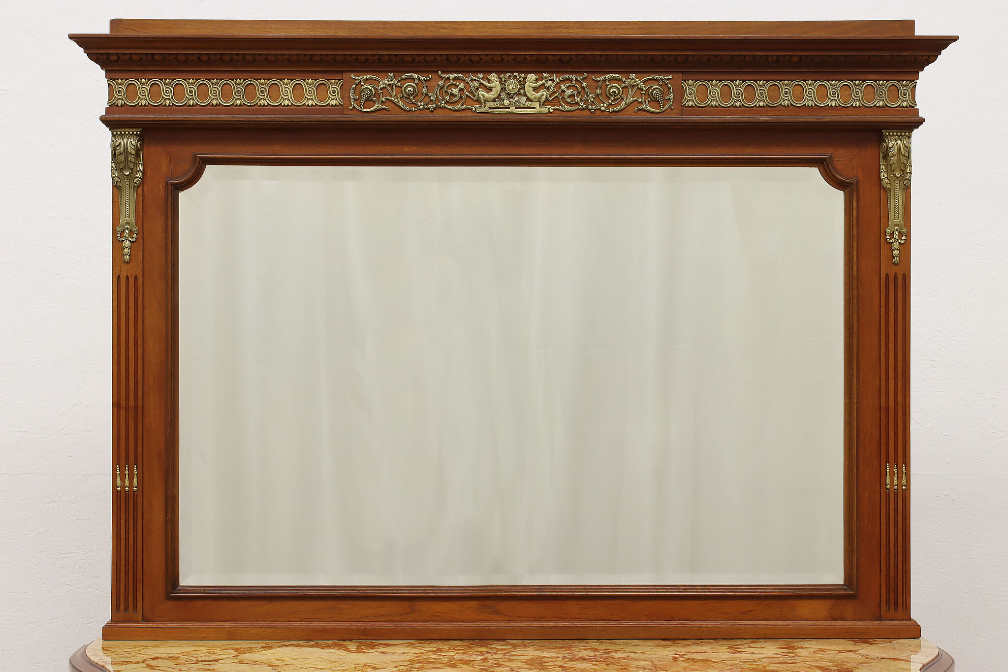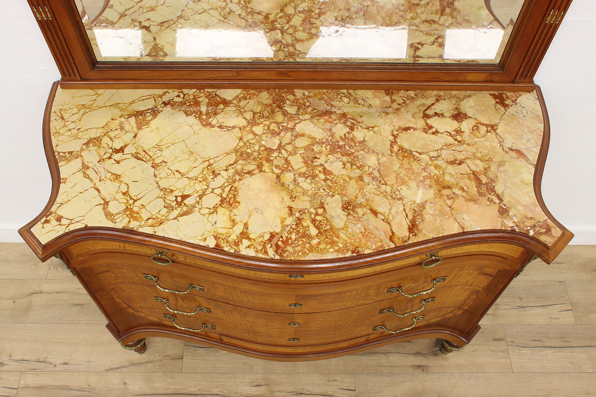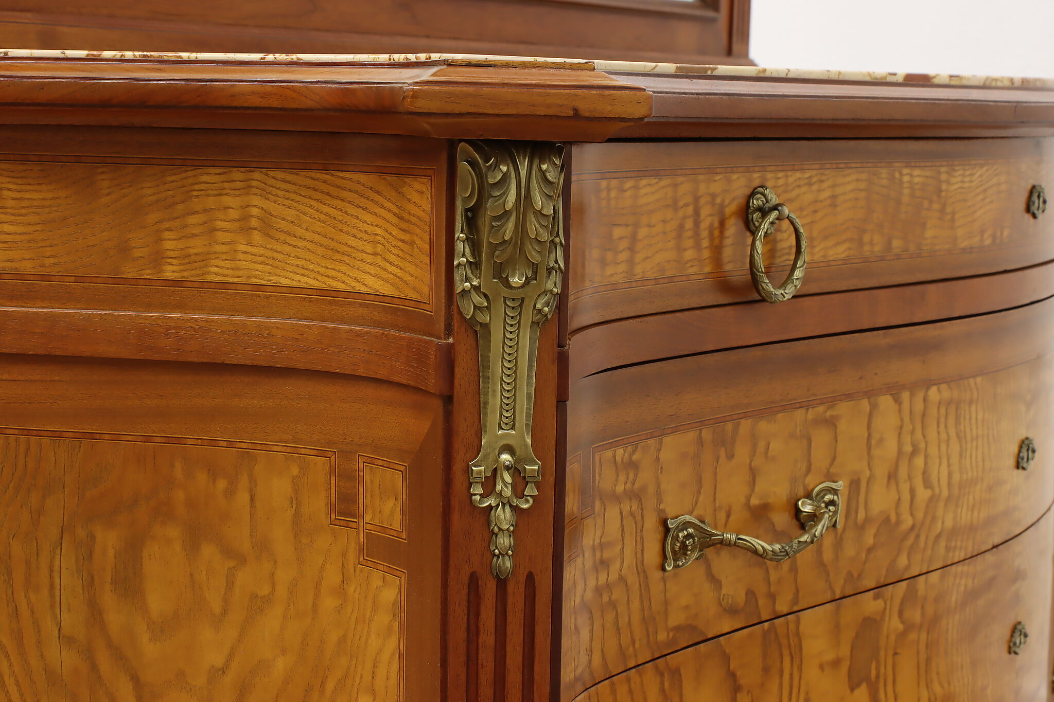 Master craftsman in France created this luxurious chest or dresser, adorning it with gorgeous inlaid marquetry and banding plus an ornate brass crest with cherubs.