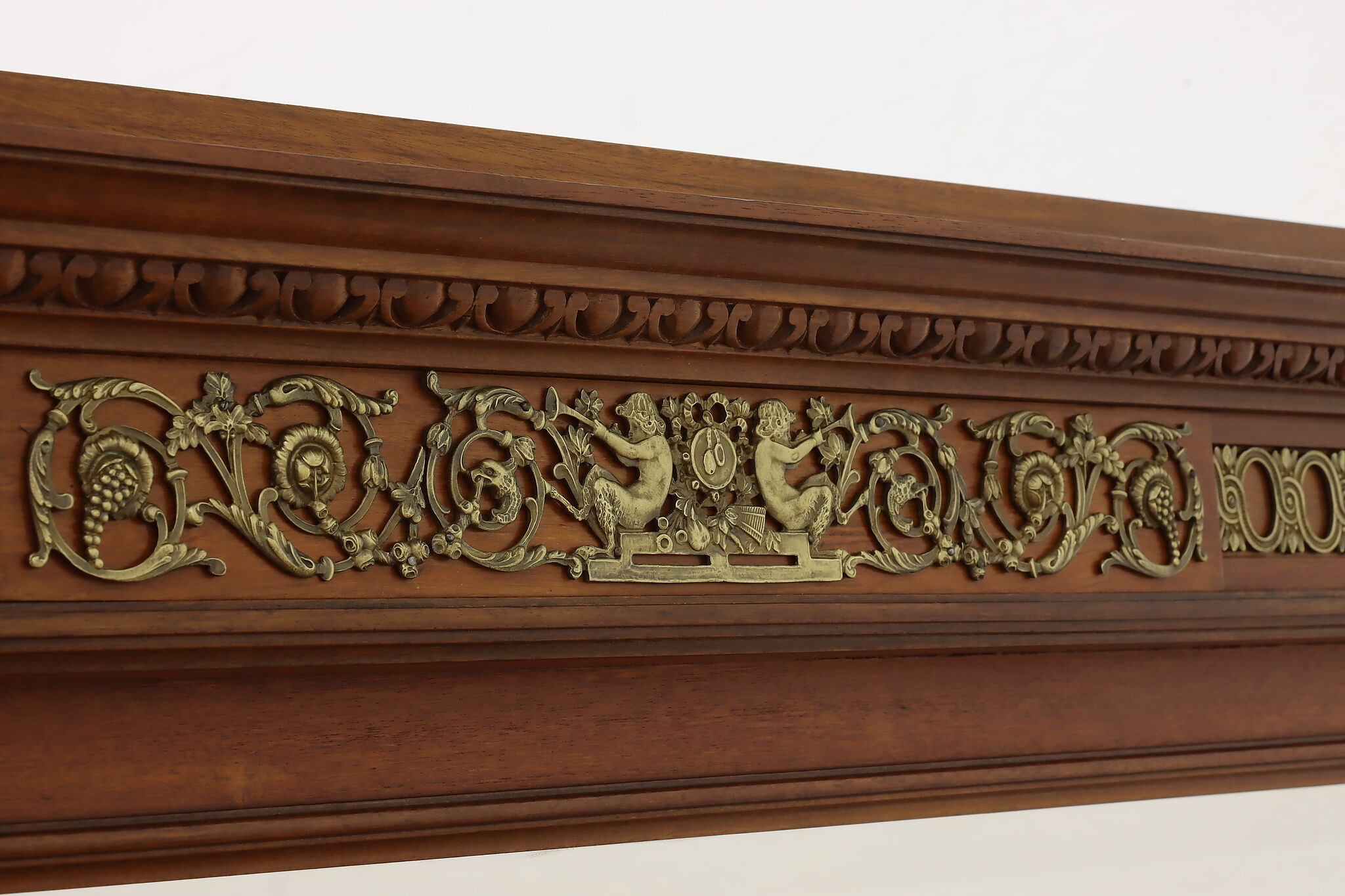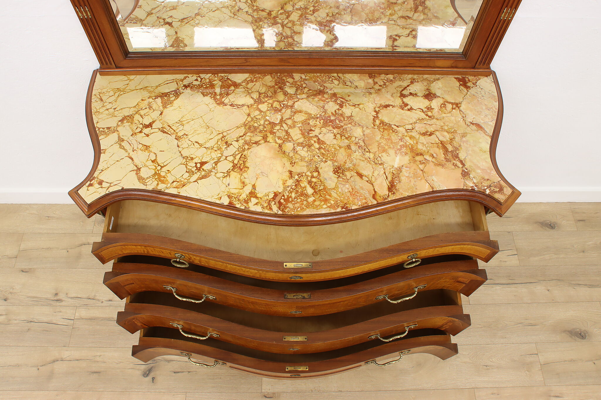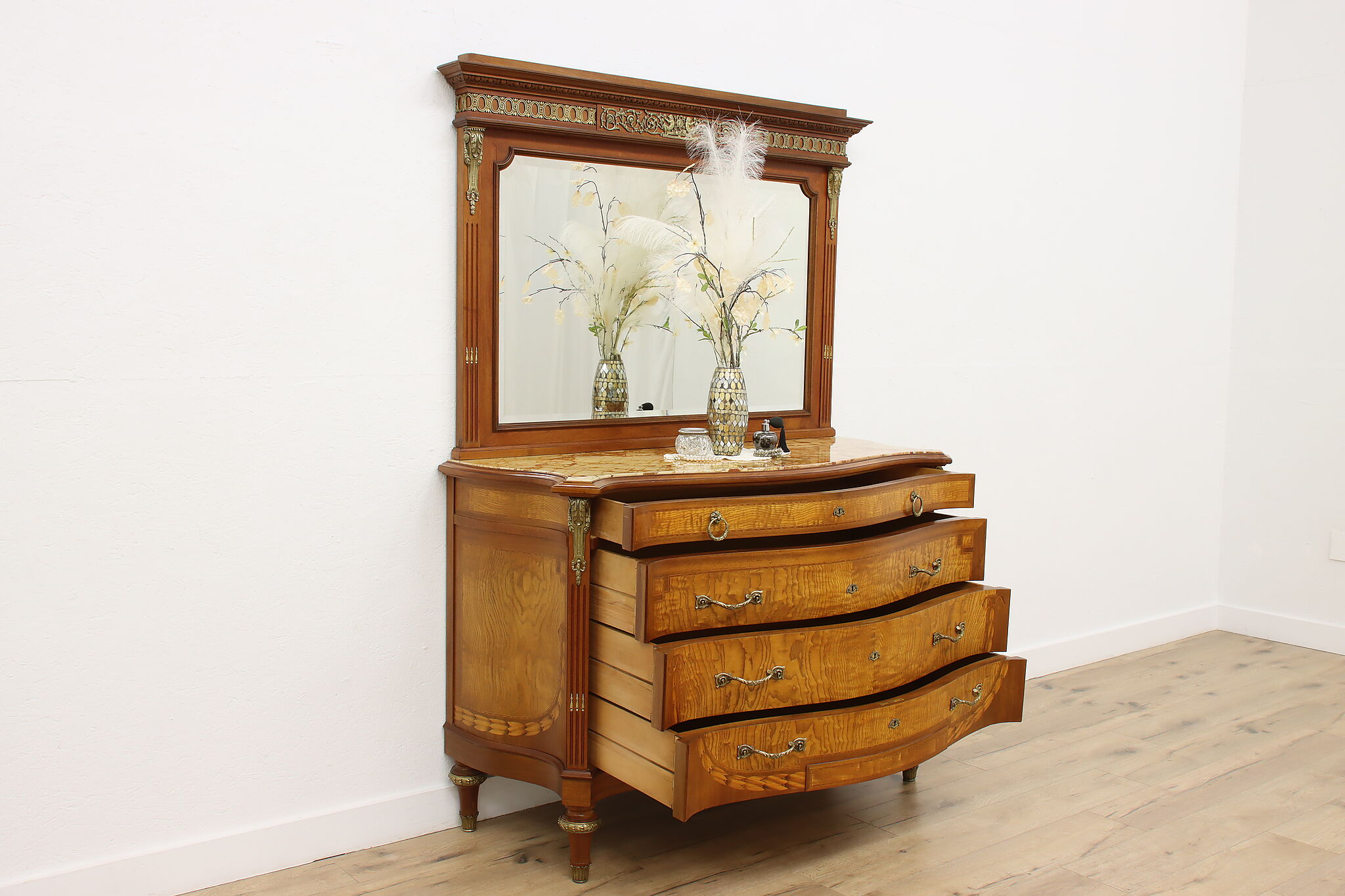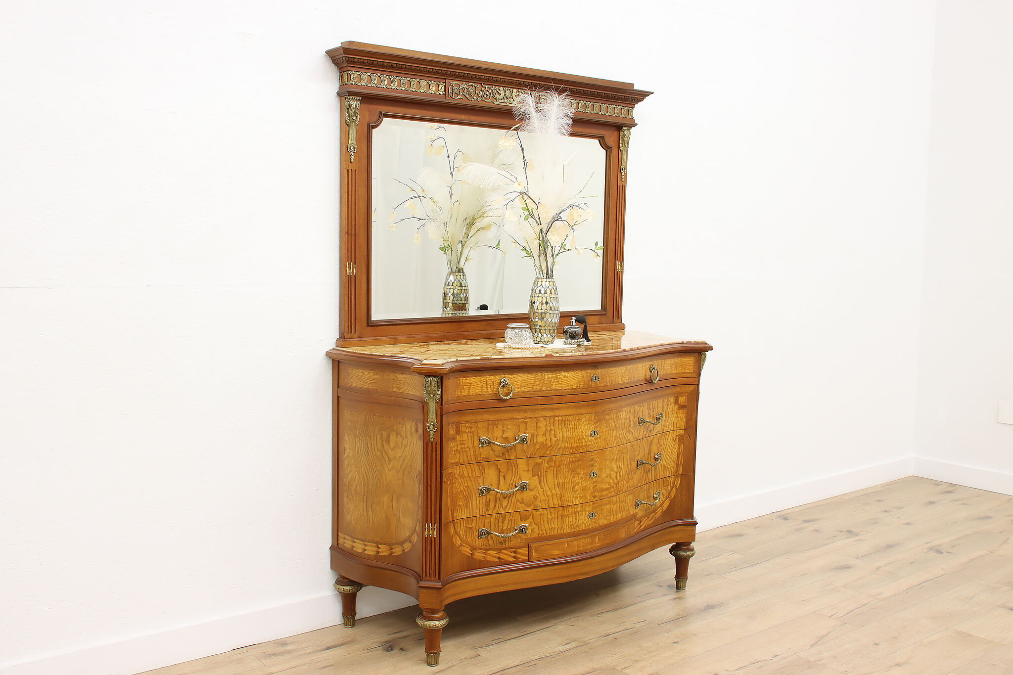 Master craftsman in France created this luxurious chest or dresser, adorning it with gorgeous inlaid marquetry and banding plus an ornate brass crest with cherubs.