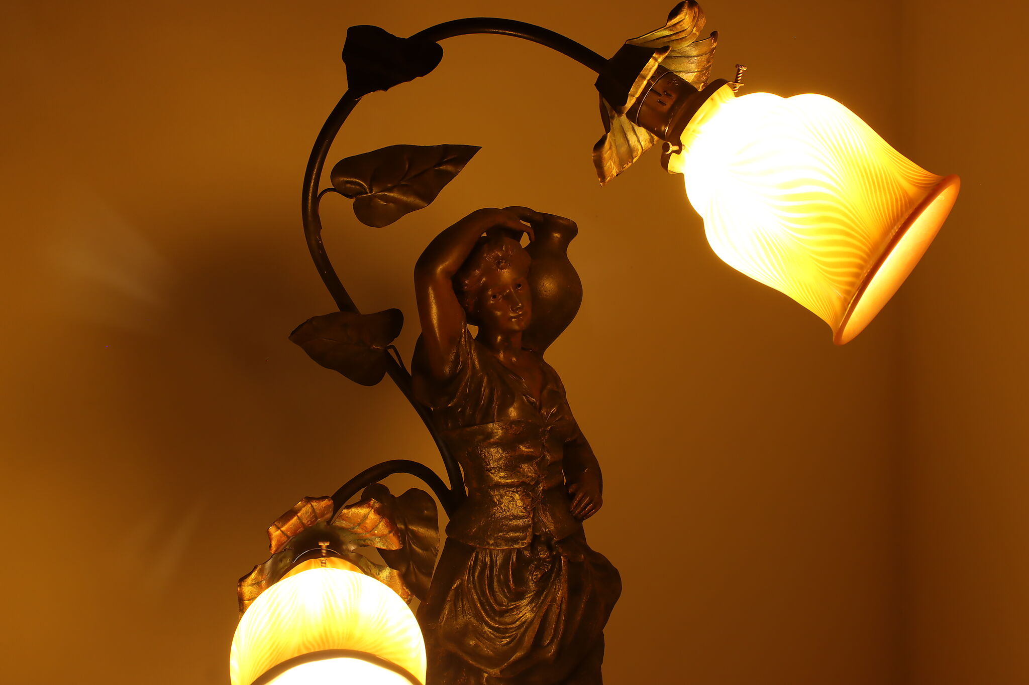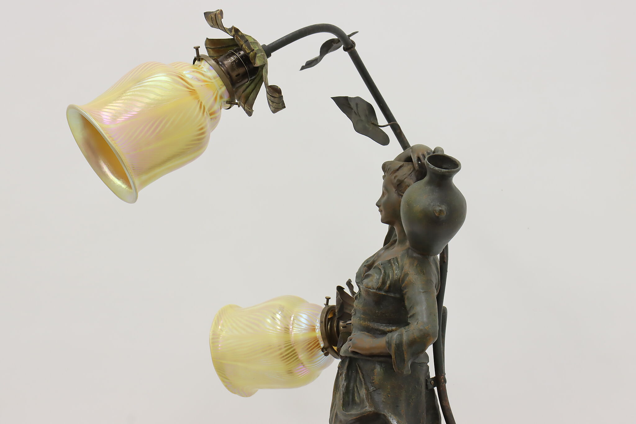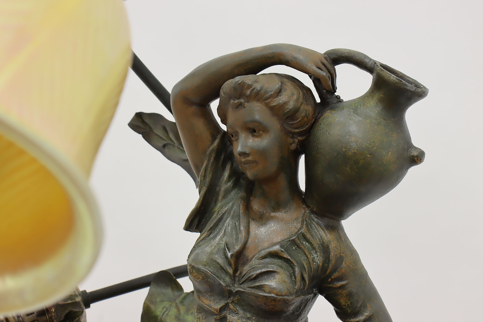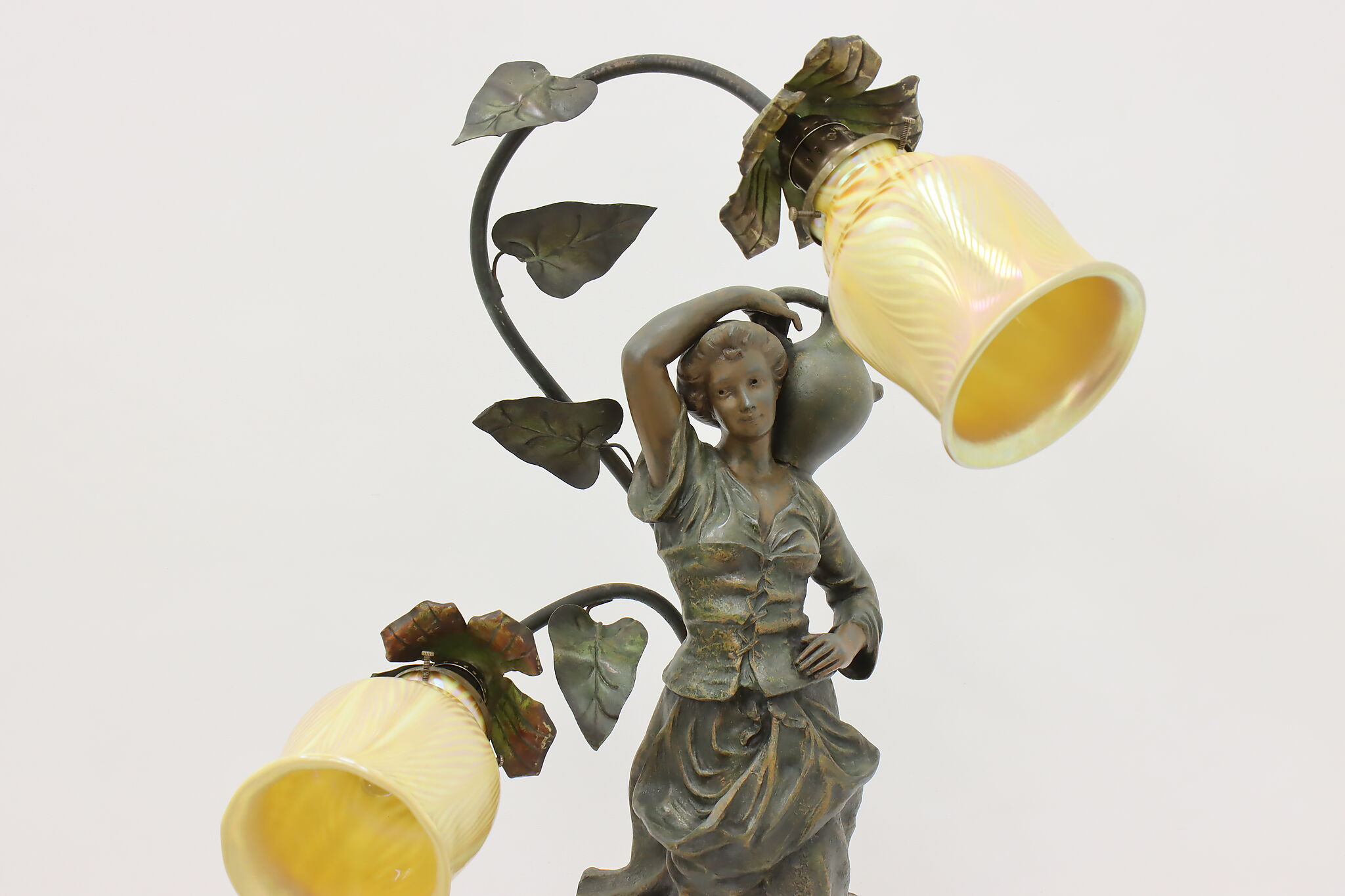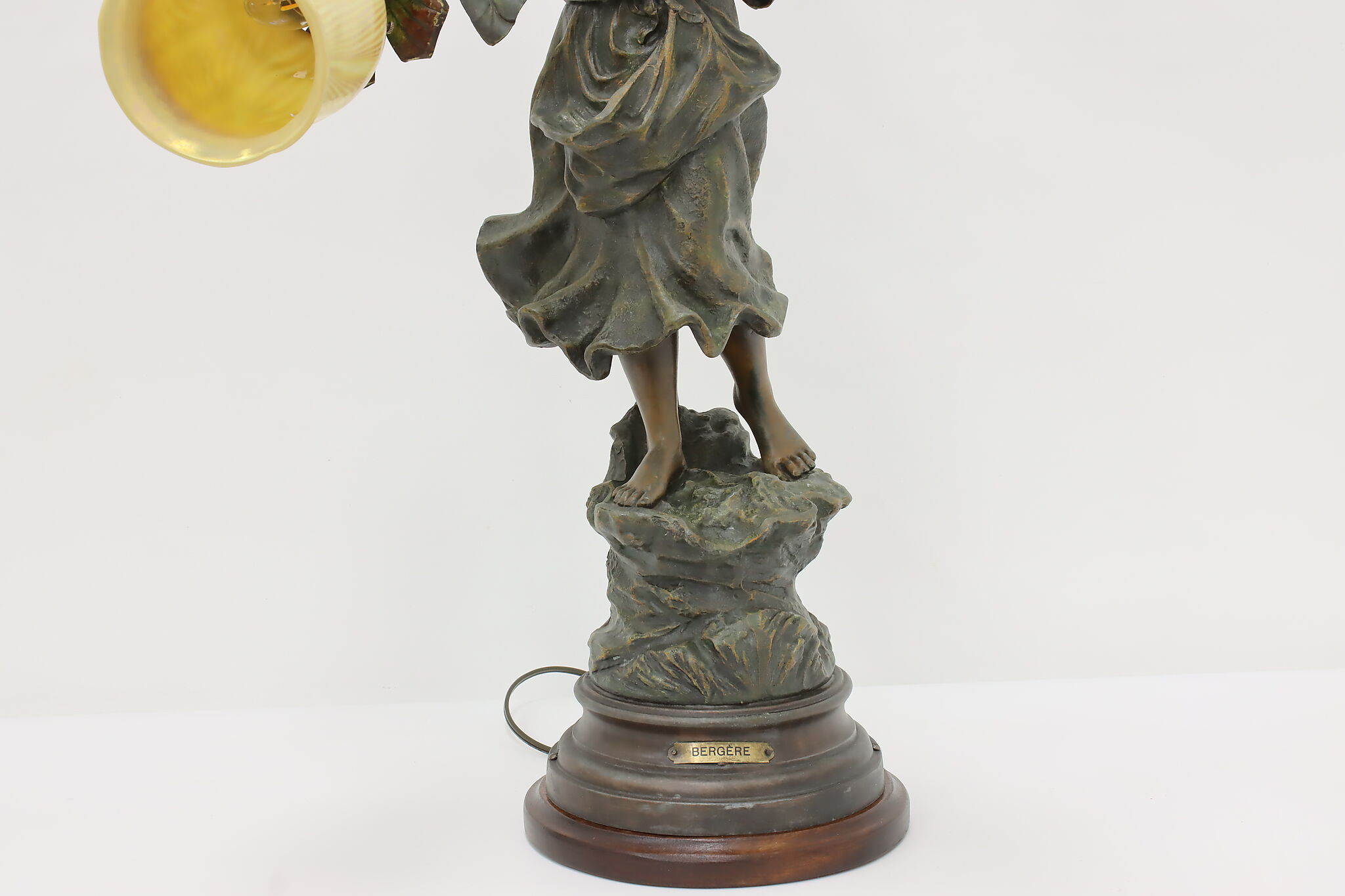 Place this French lamp on an entry or center console to display the beautiful craftsmanship of the shepherdess sculpture and art glass shades.