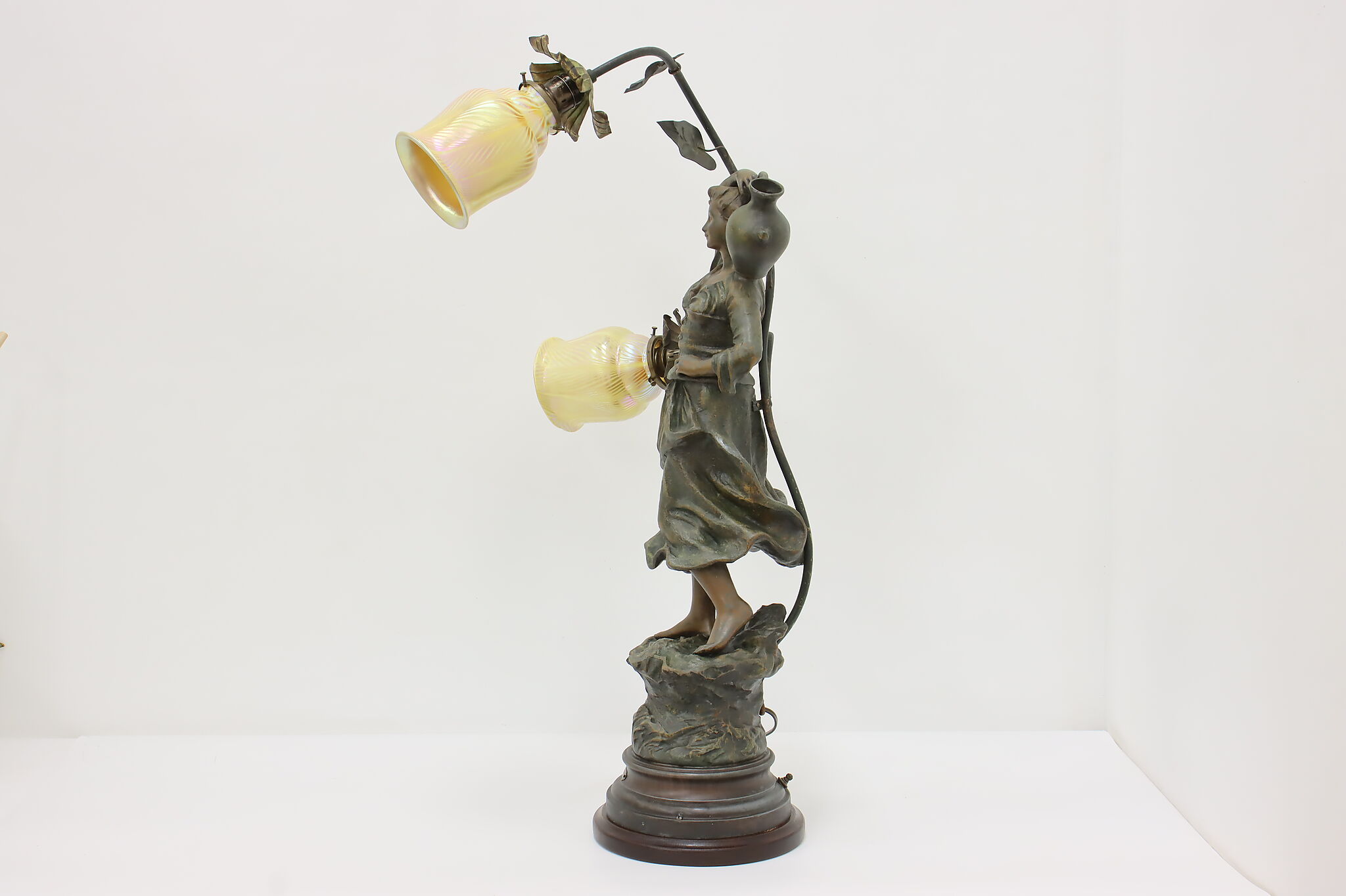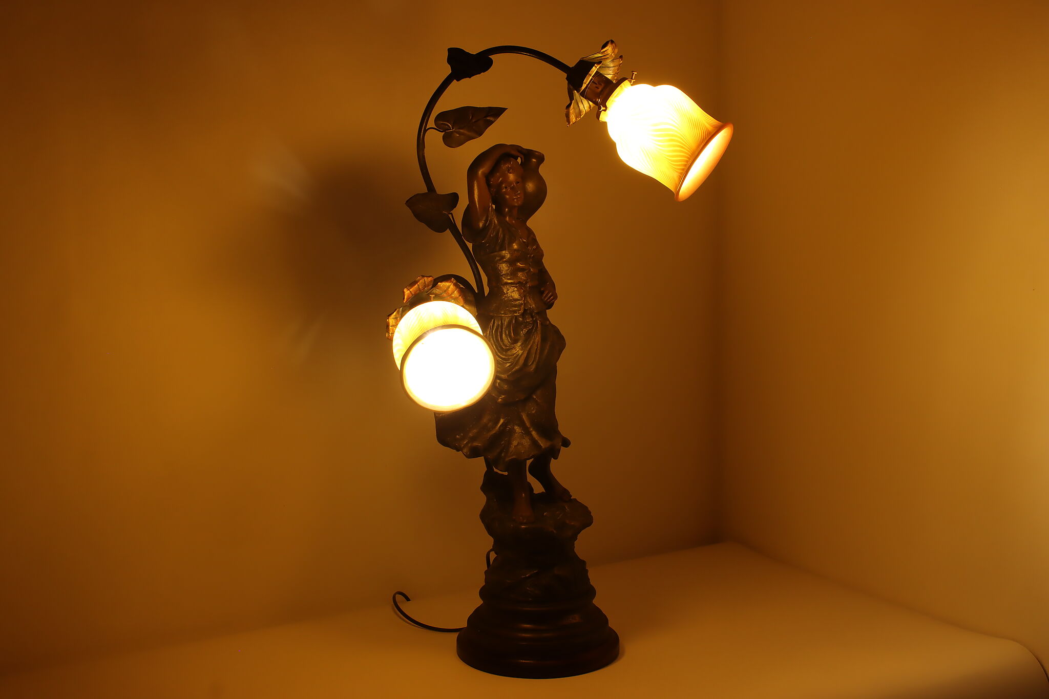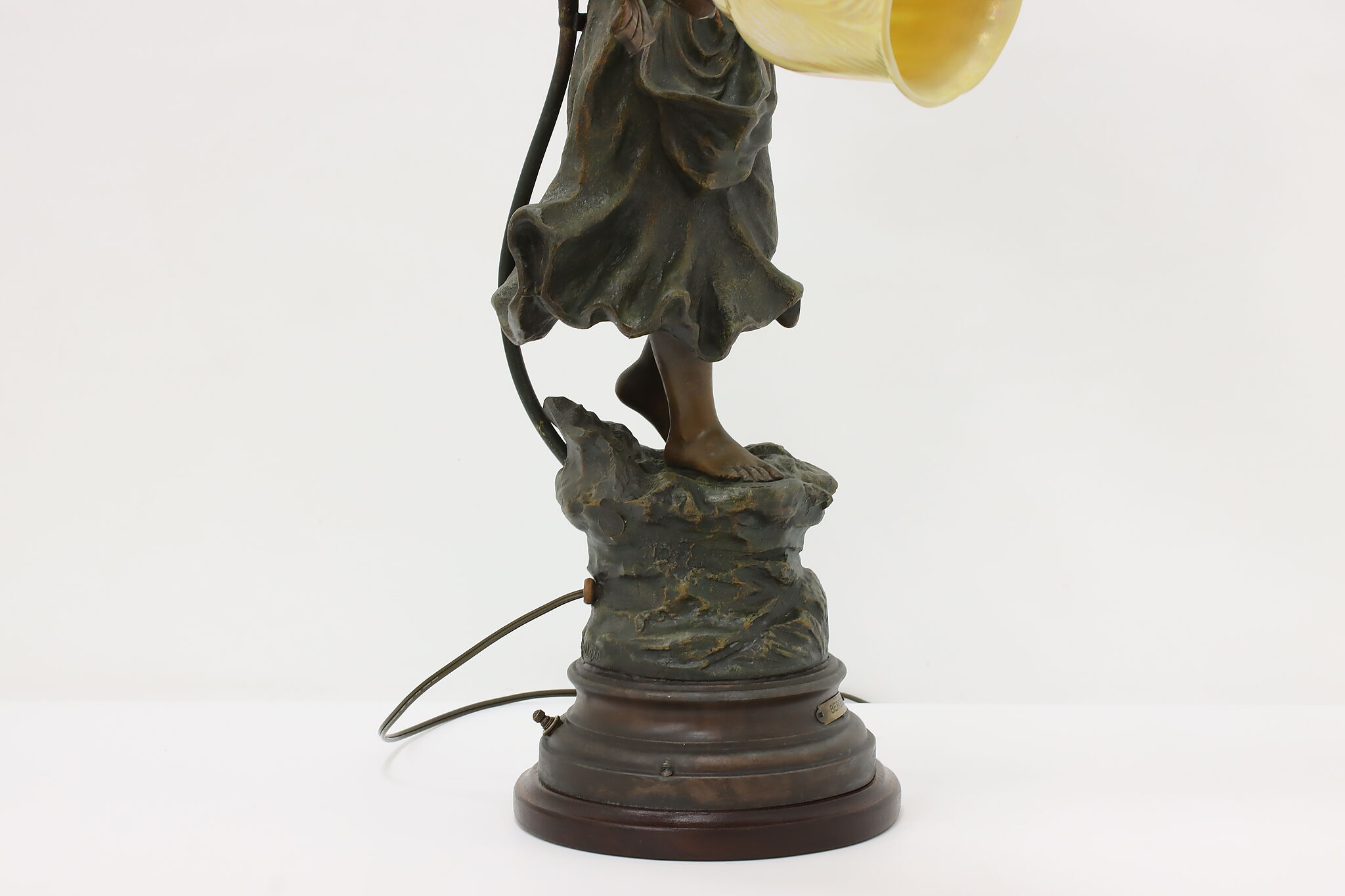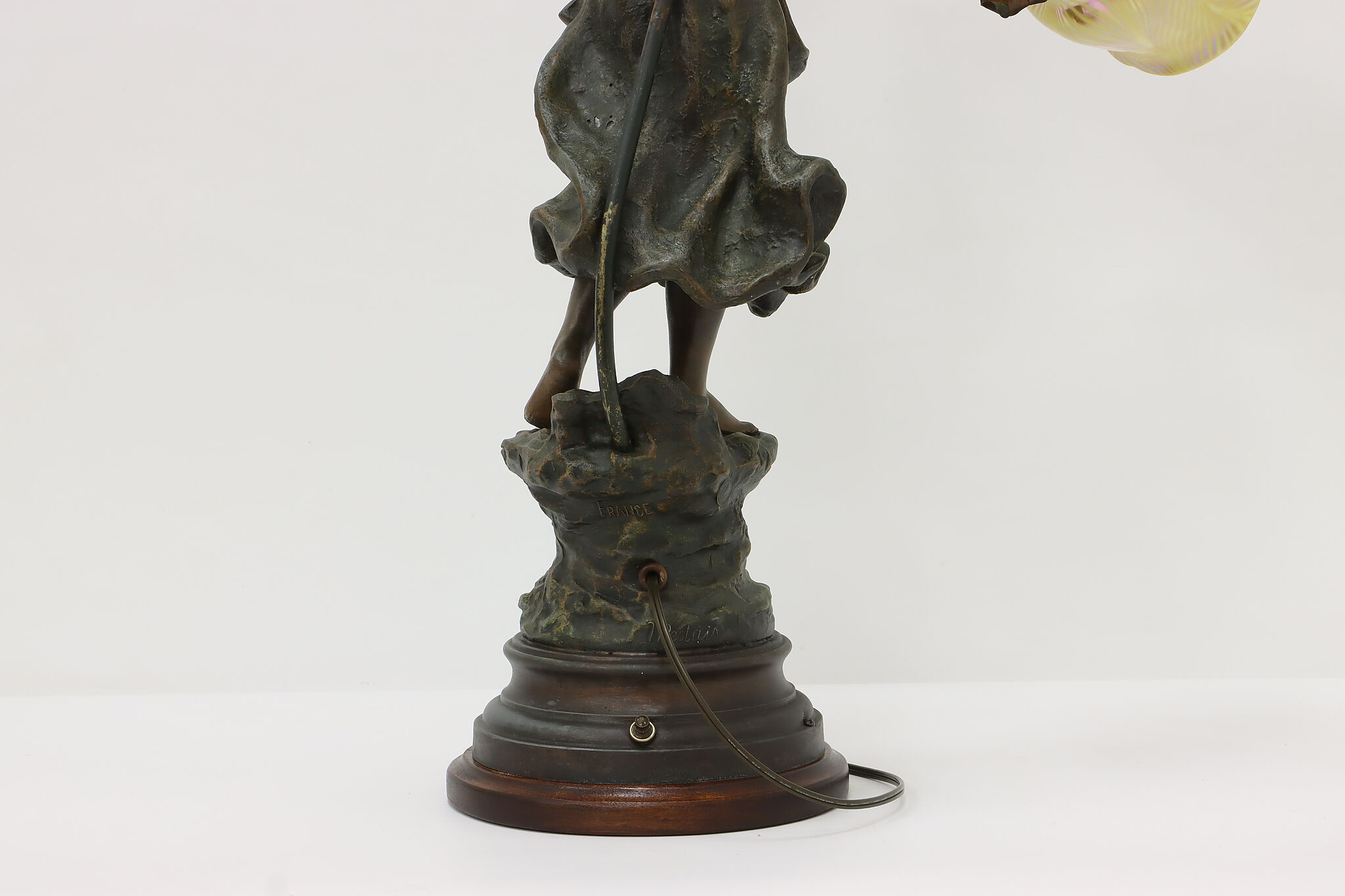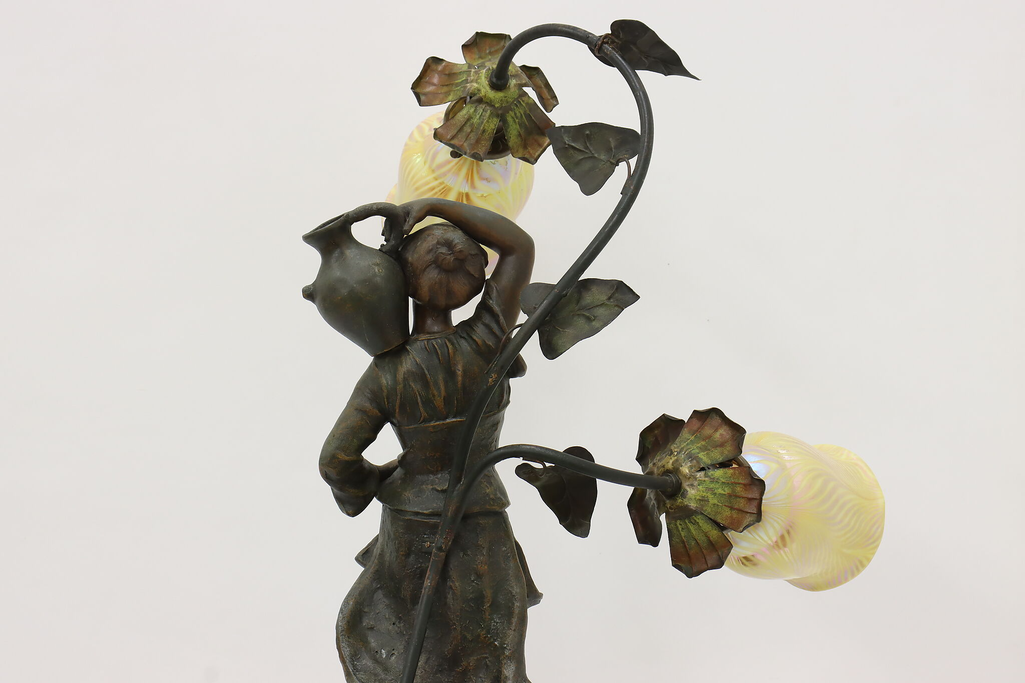 Place this French lamp on an entry or center console to display the beautiful craftsmanship of the shepherdess sculpture and art glass shades.