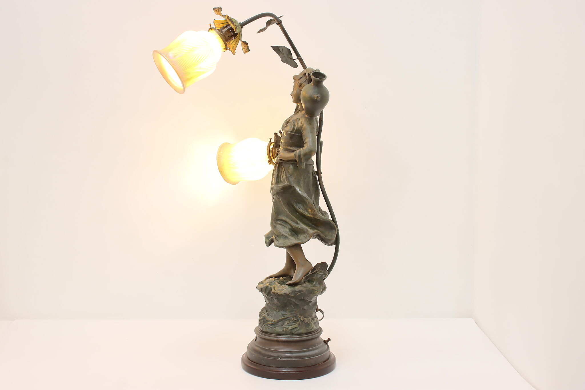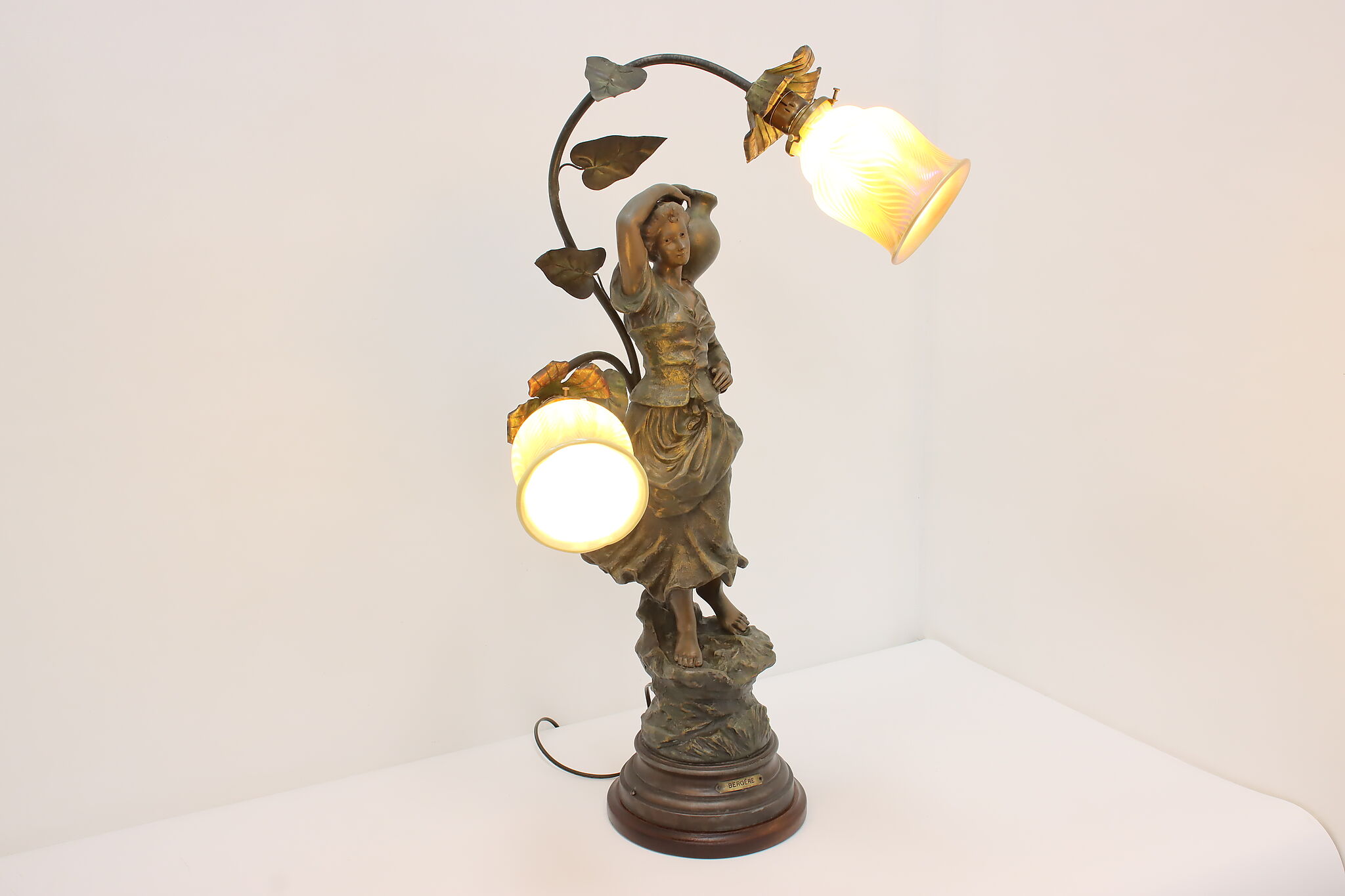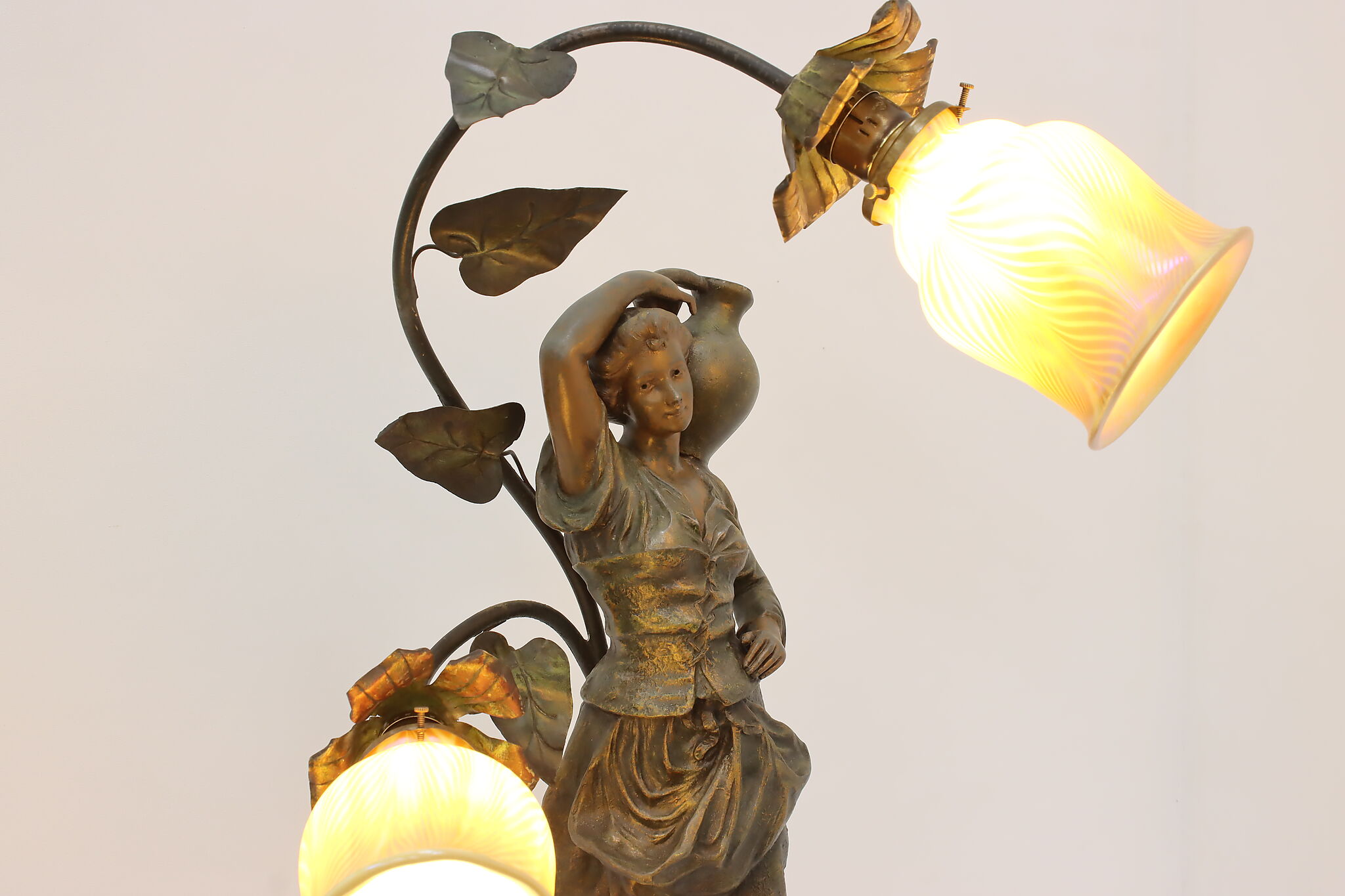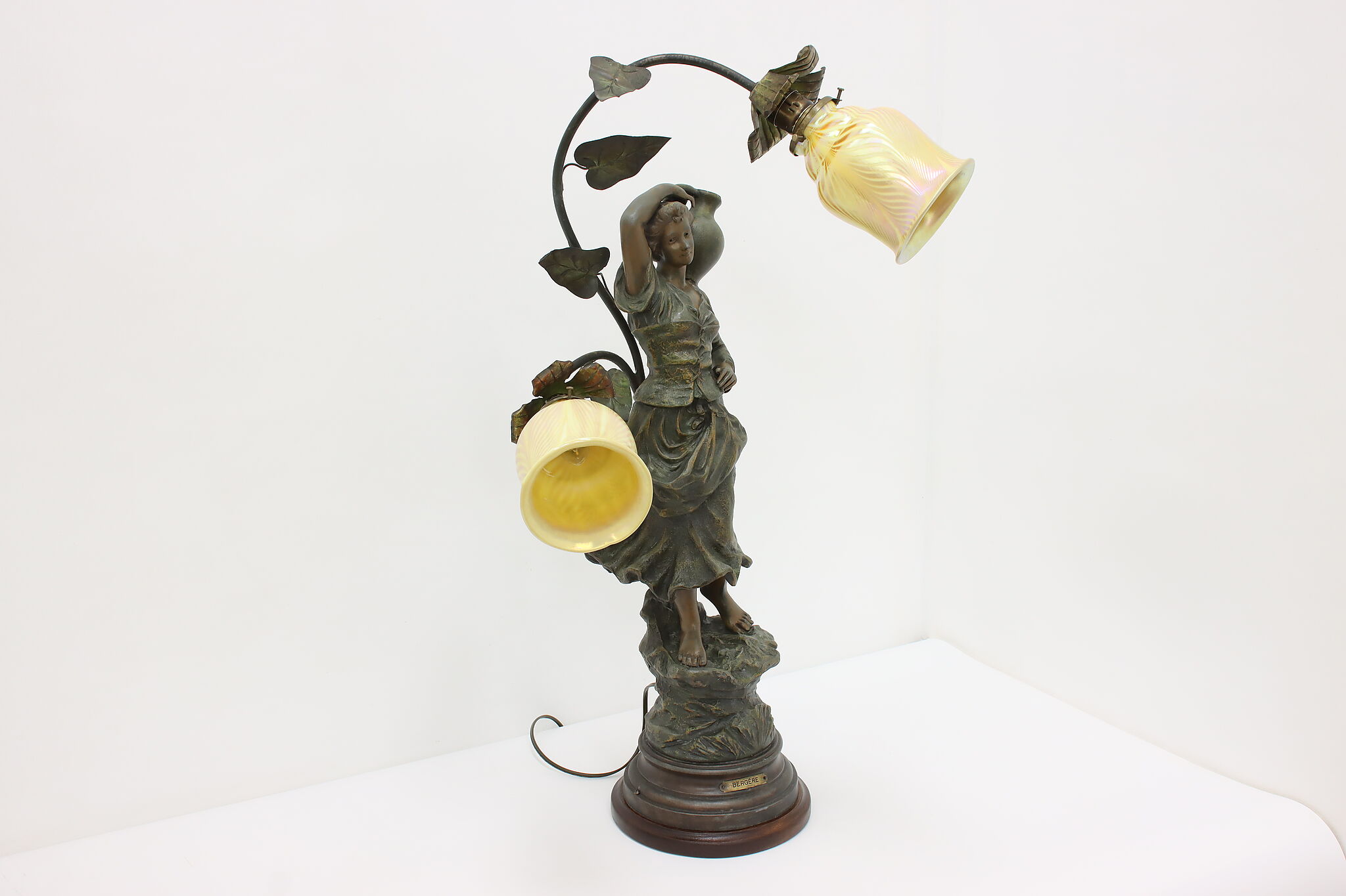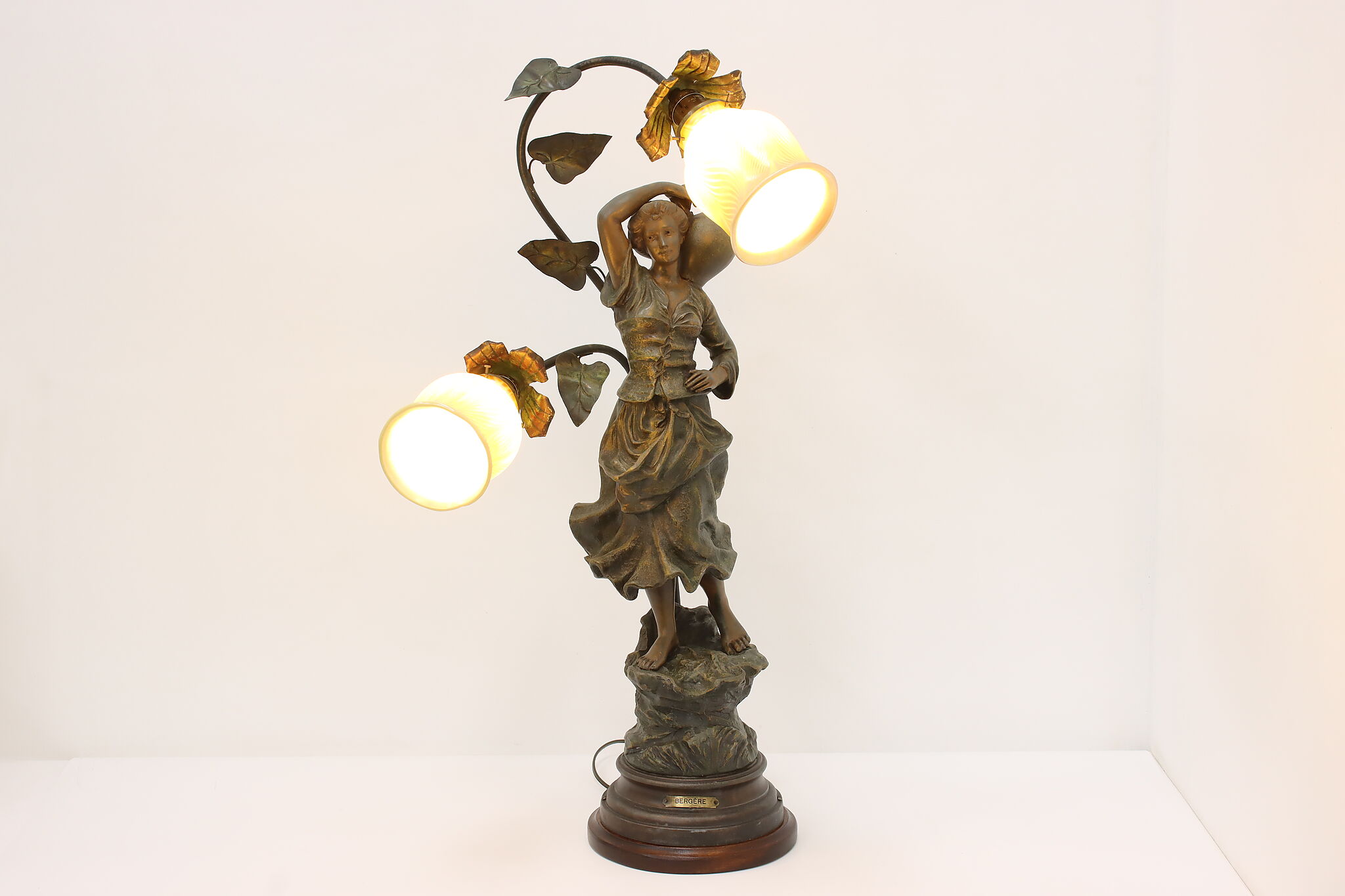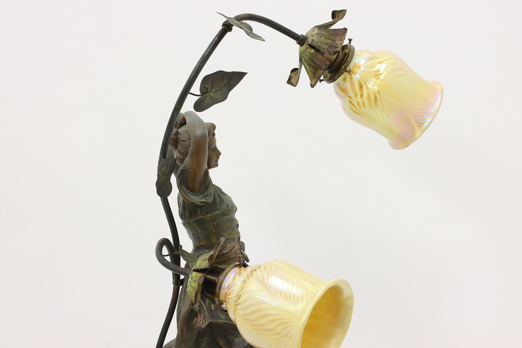 Place this French lamp on an entry or center console to display the beautiful craftsmanship of the shepherdess sculpture and art glass shades.