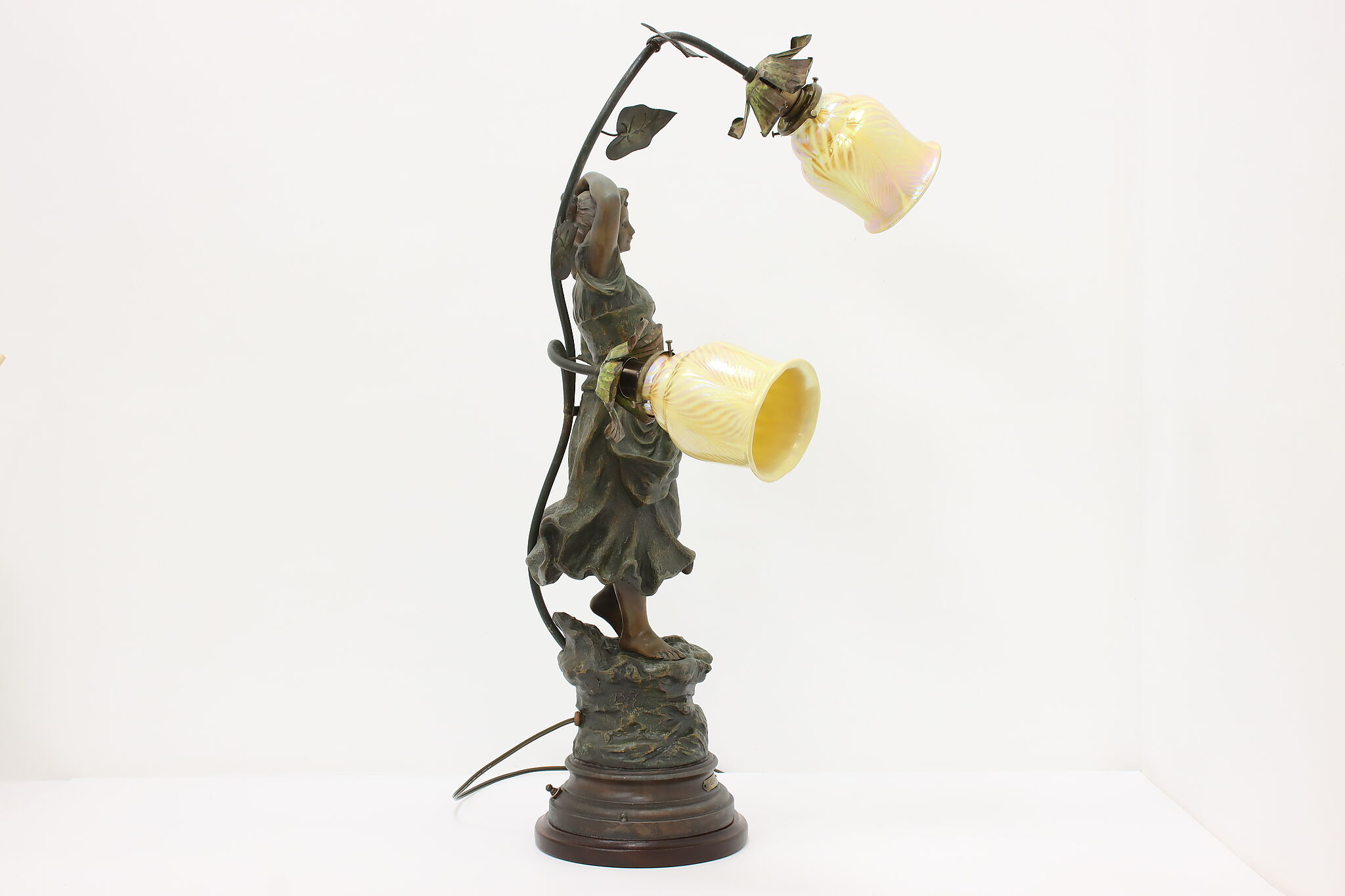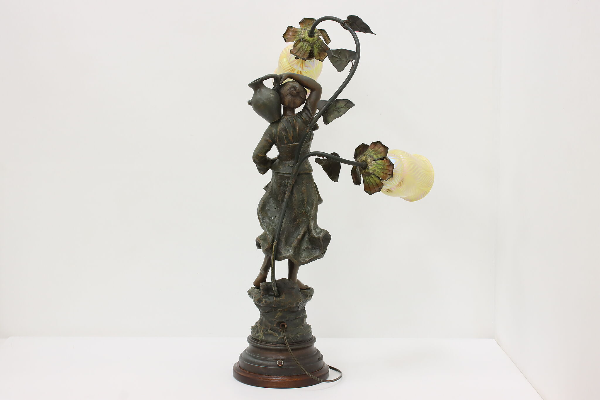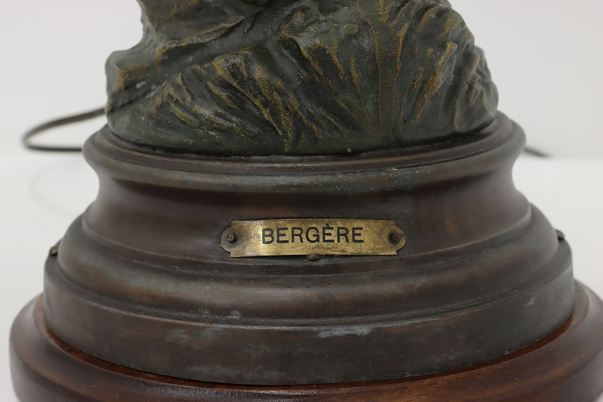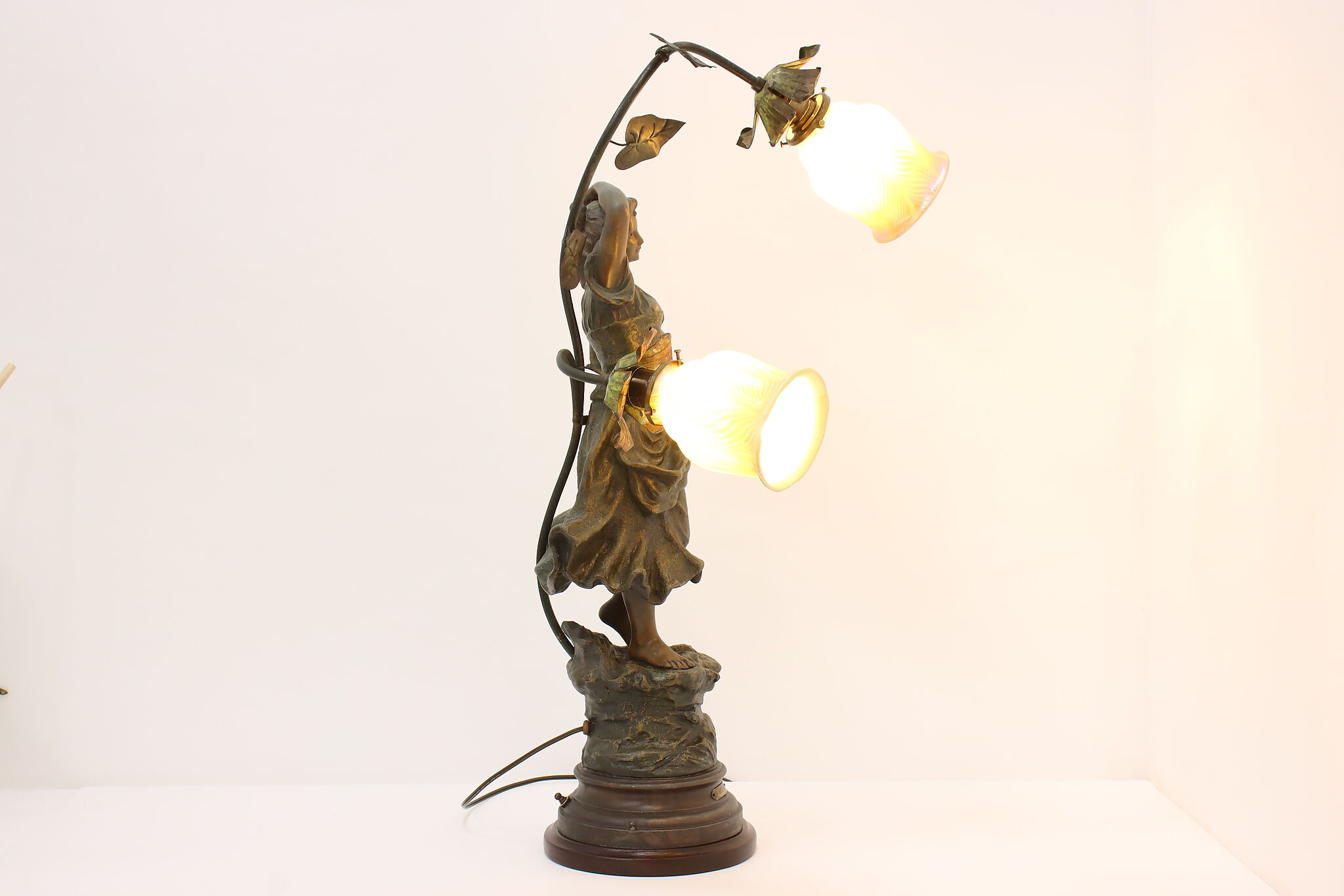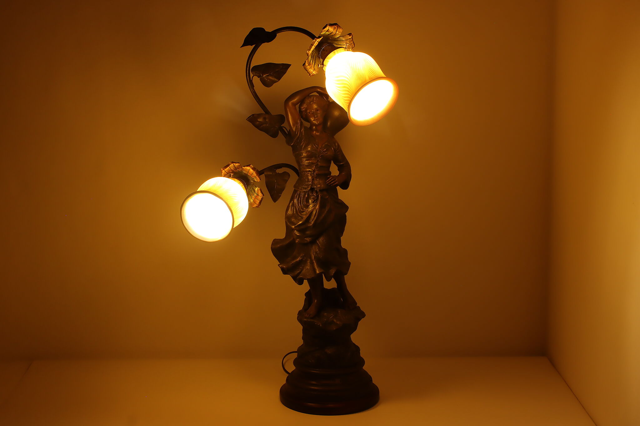 Place this French lamp on an entry or center console to display the beautiful craftsmanship of the shepherdess sculpture and art glass shades.