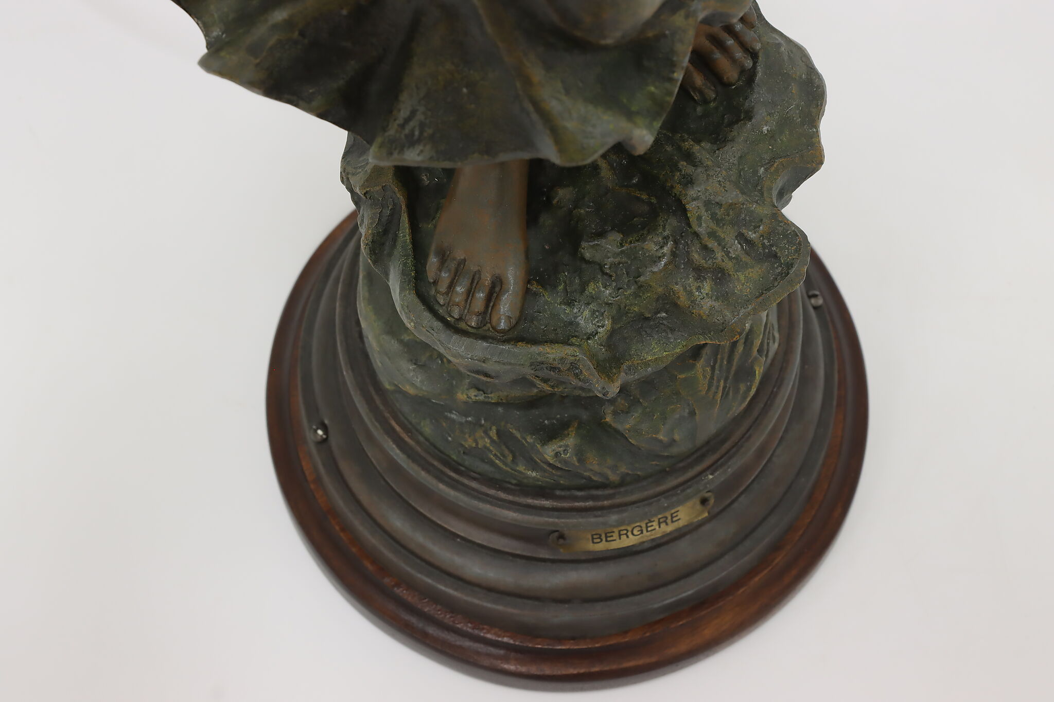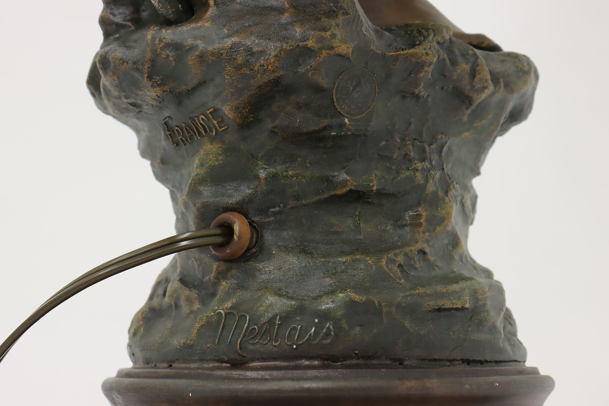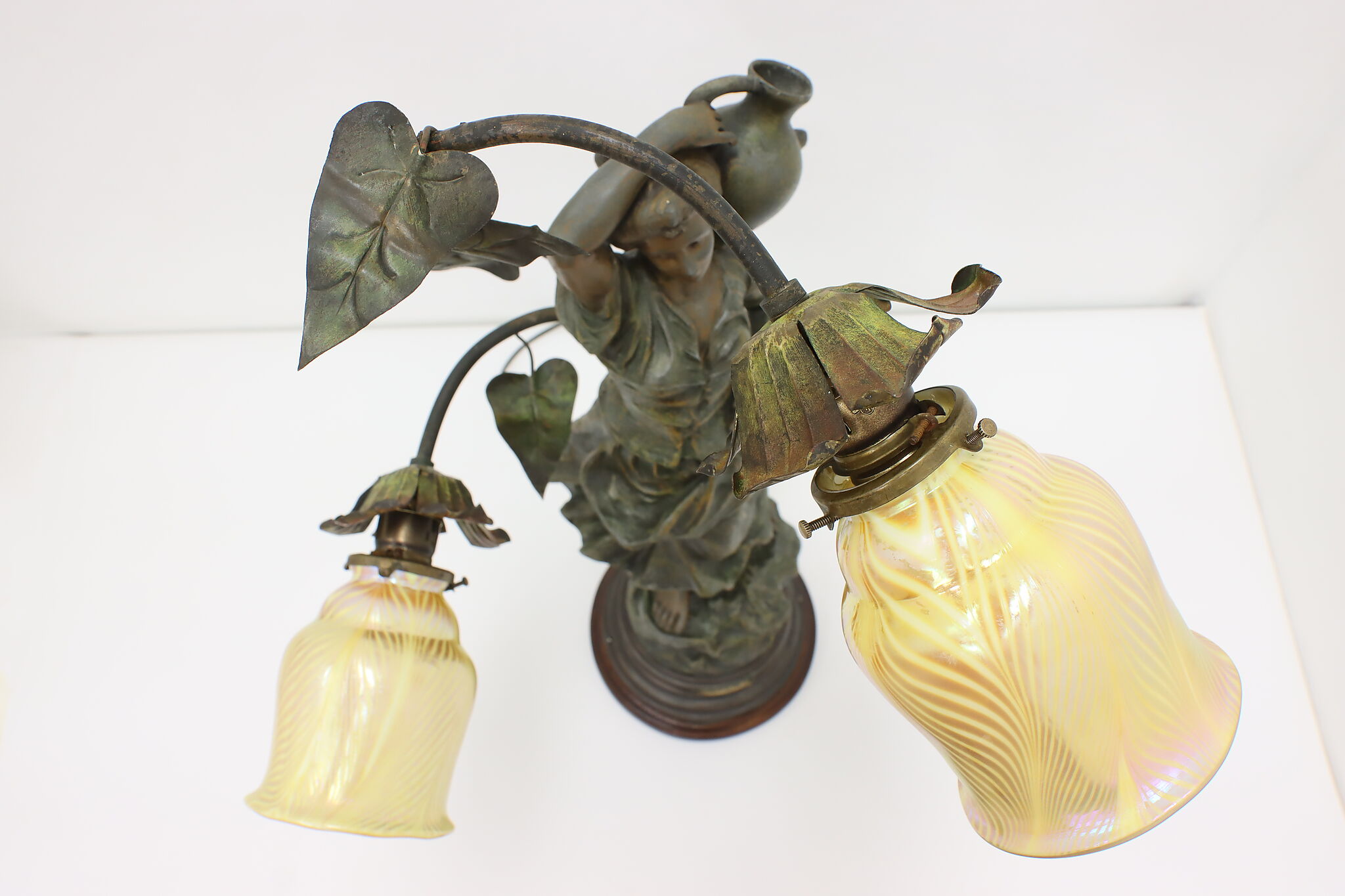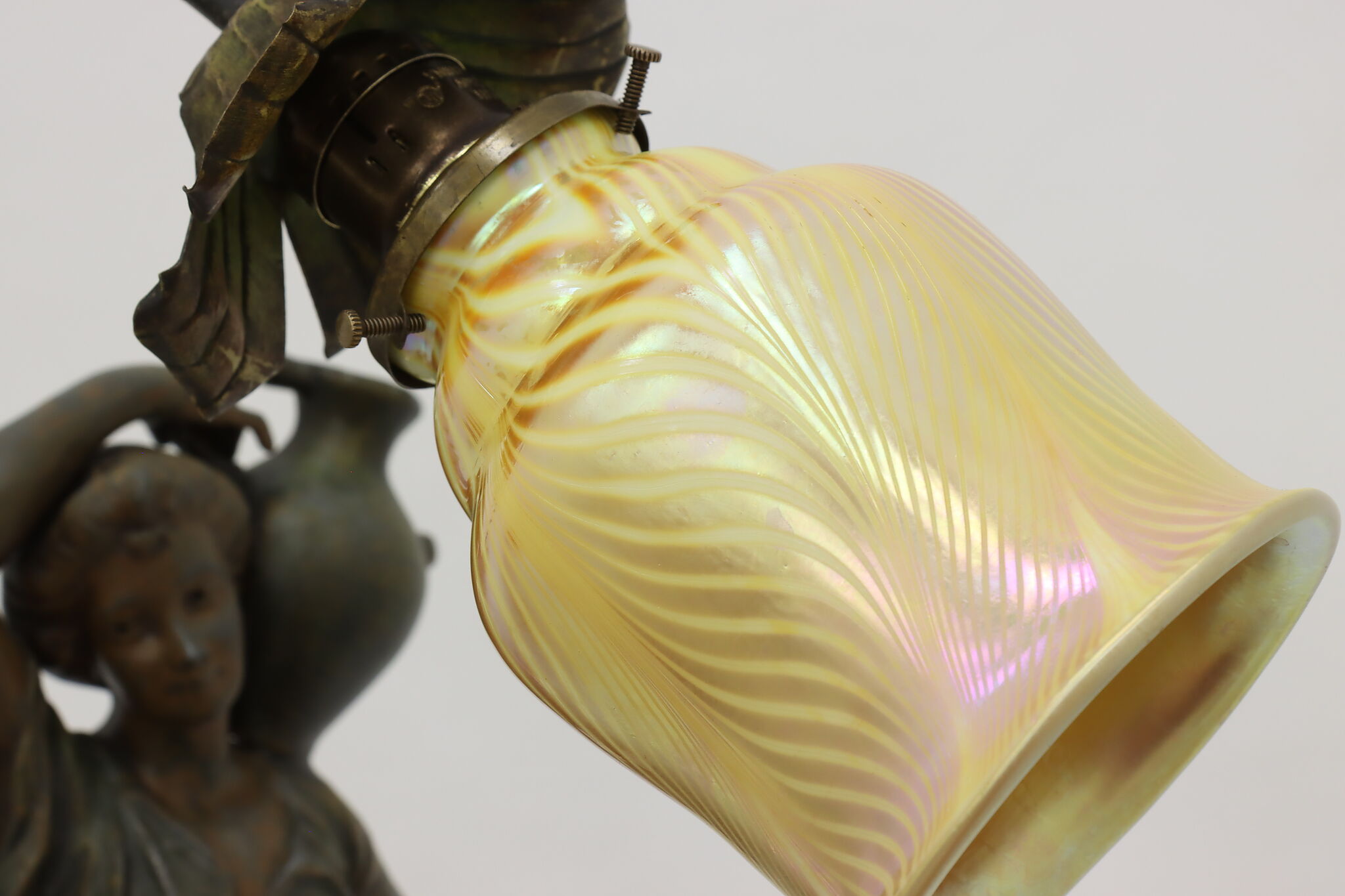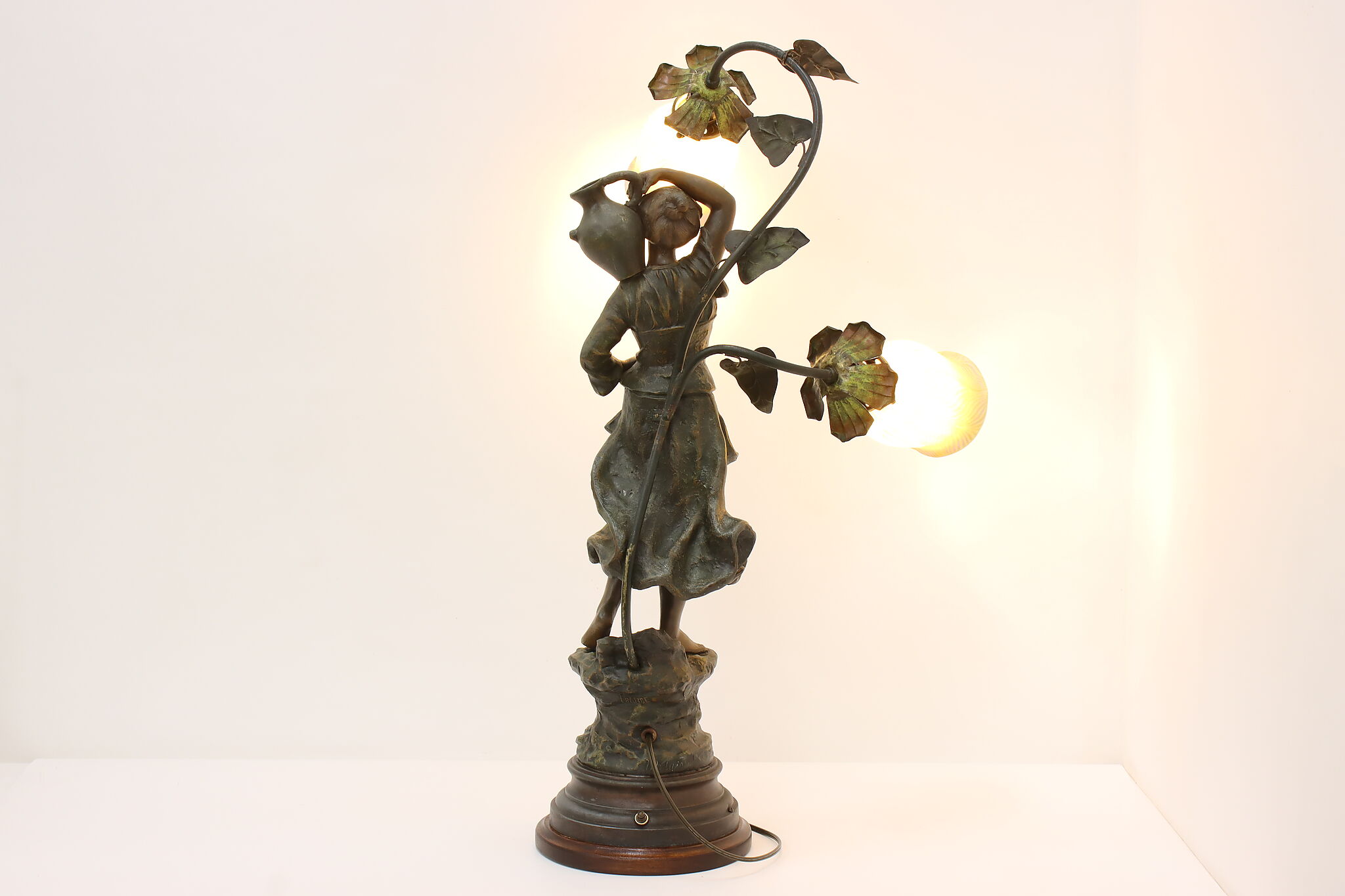 Place this French lamp on an entry or center console to display the beautiful craftsmanship of the shepherdess sculpture and art glass shades.
