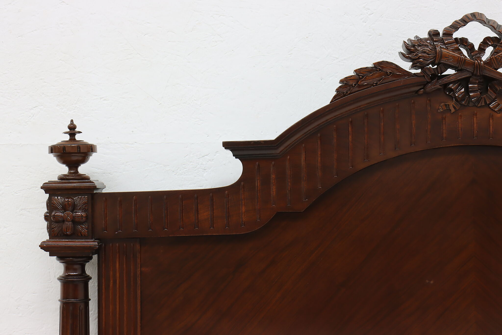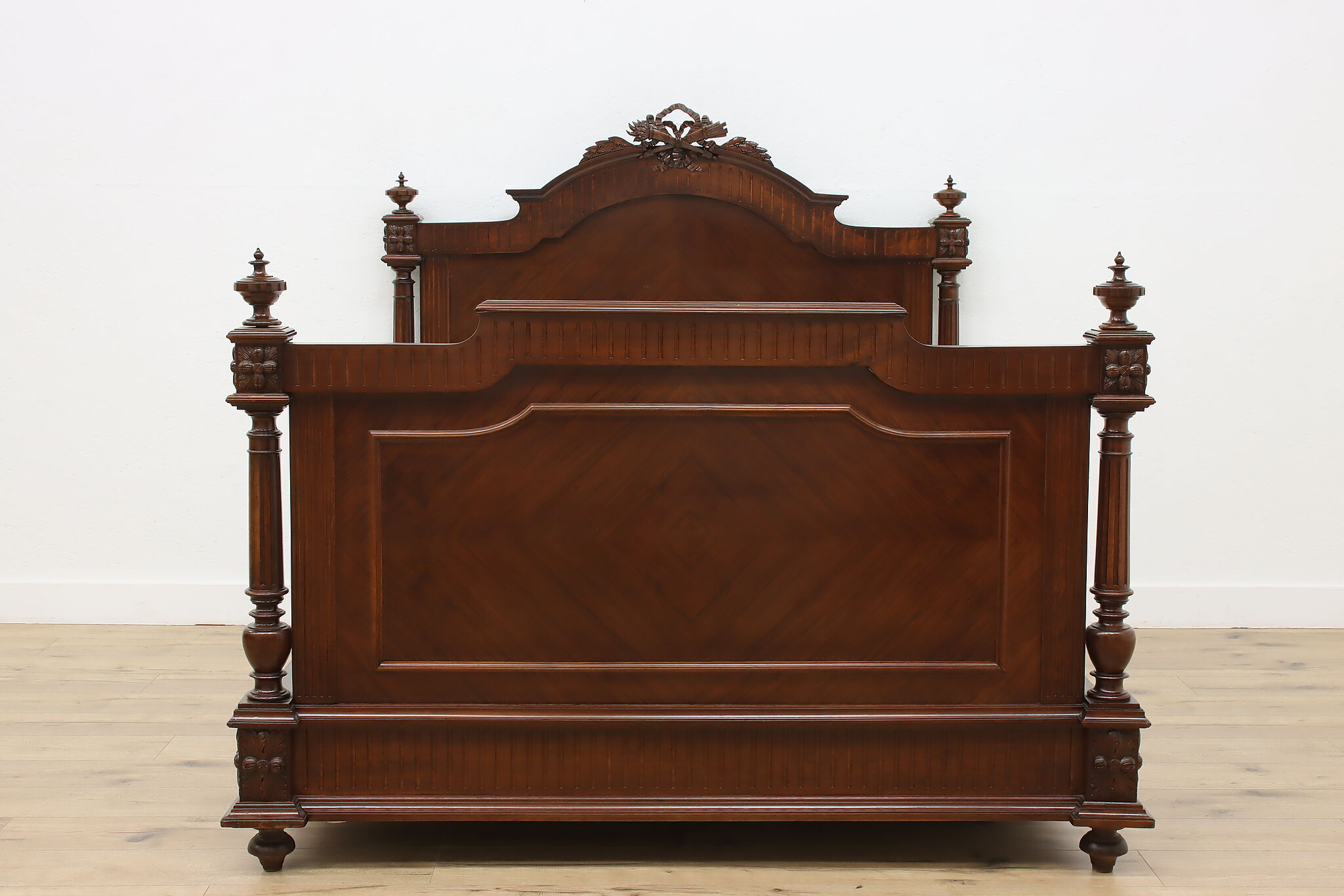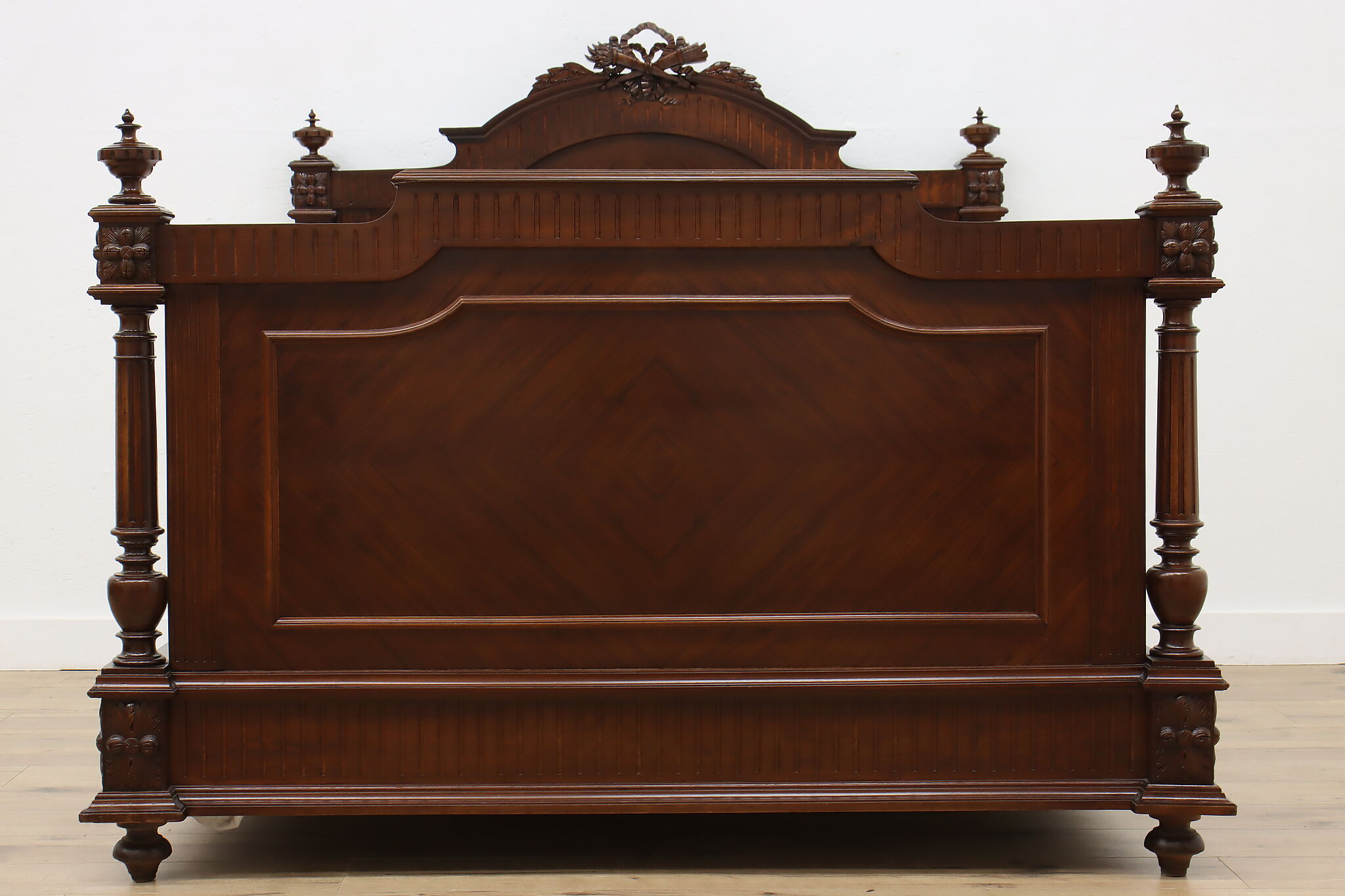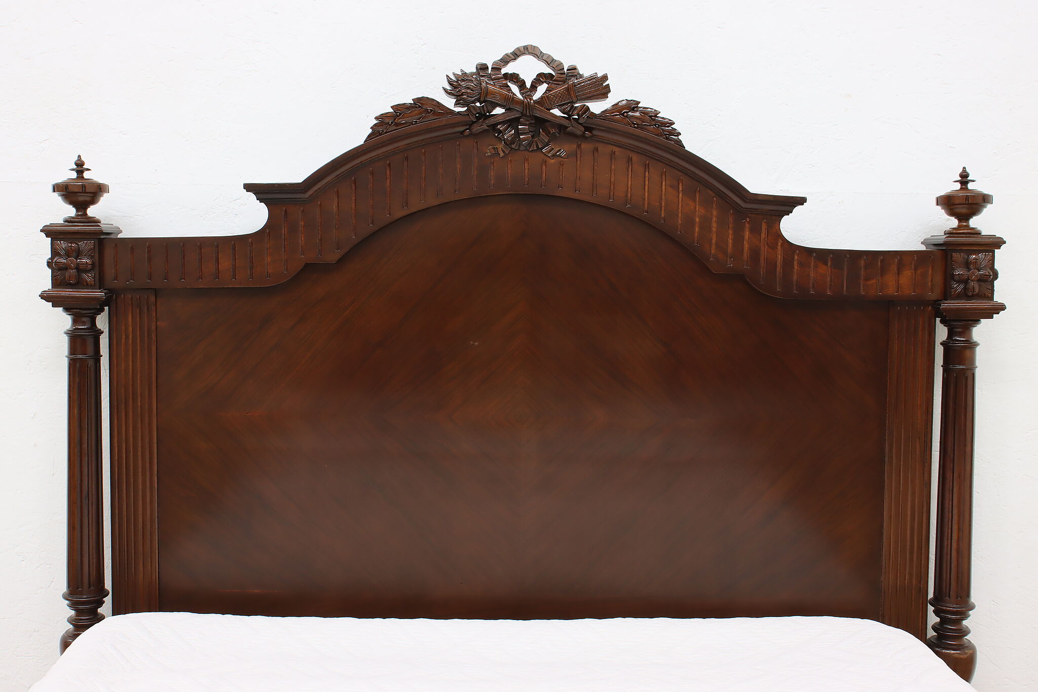 This gorgeous French bed has a beautifully carved crossed arrow quiver and torch crest to represent love. Perhaps this bed was commissioned for a newly wed couple!