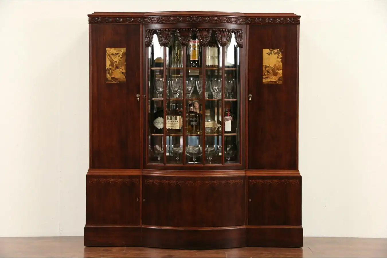 An exquisite French Art Deco china or bar cabinet from about 1920 is genuine rosewood with remarkable inlaid marquetry scenes.