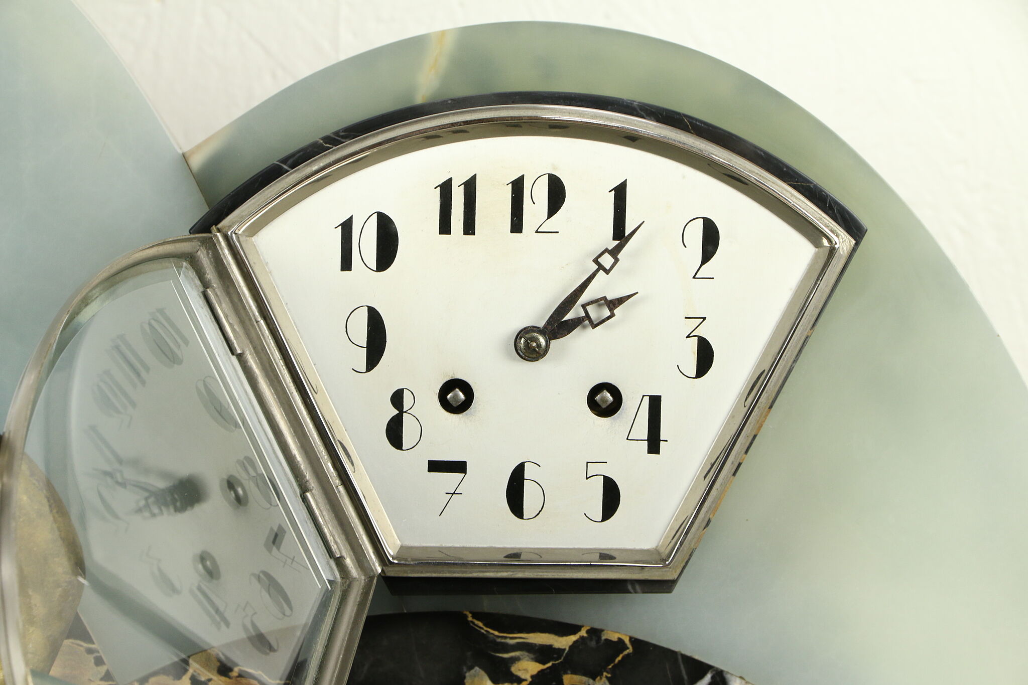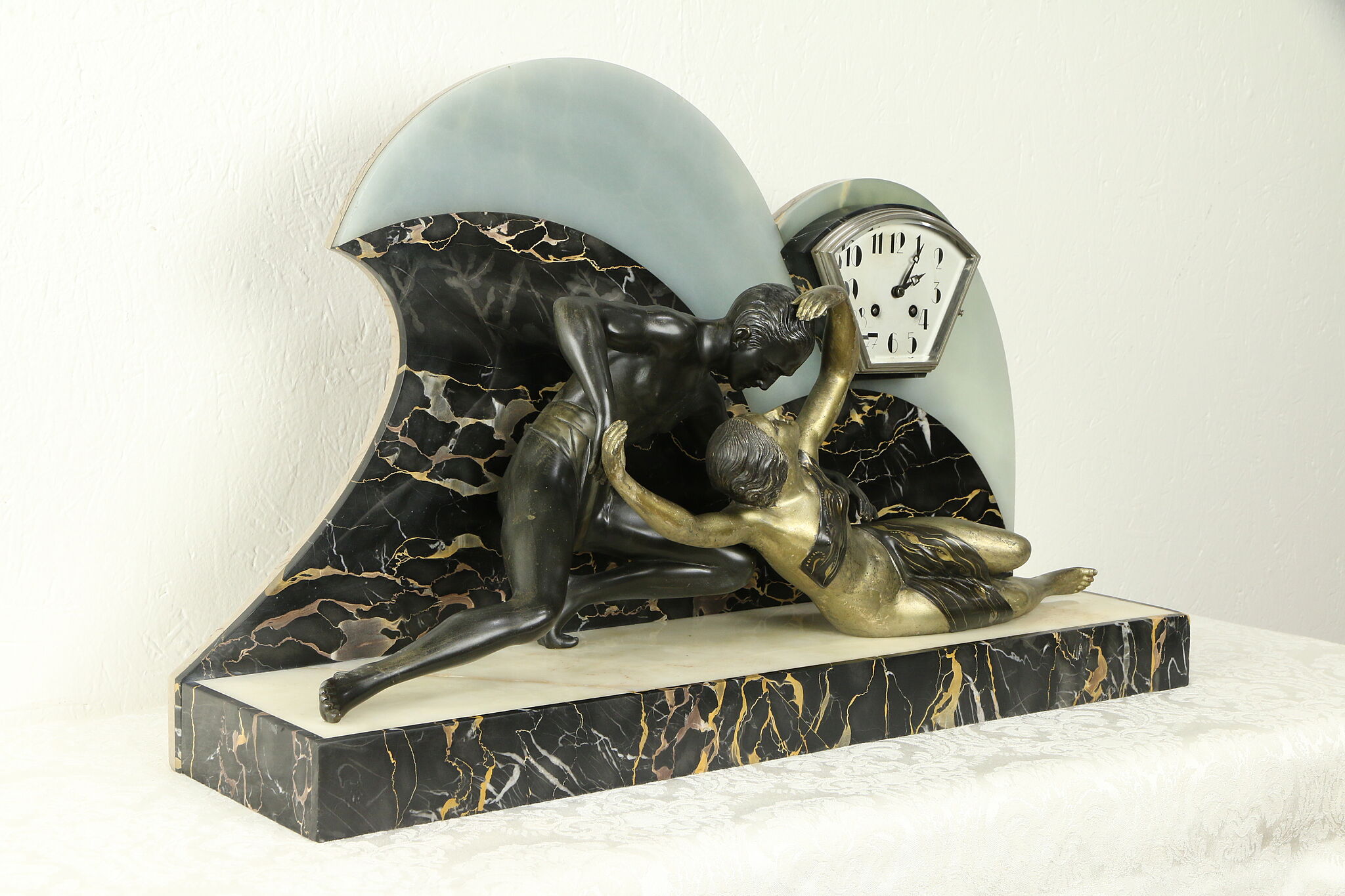 A spectacular Art Deco period marble clock from about 1925 has a sculpture of a kissing couple. The patinated cast metal statue has touchups to the original patina. Black Italian "Nero Portoro" marble joins other colors on the dramatic pedestal. There are minor flakes at the edges.