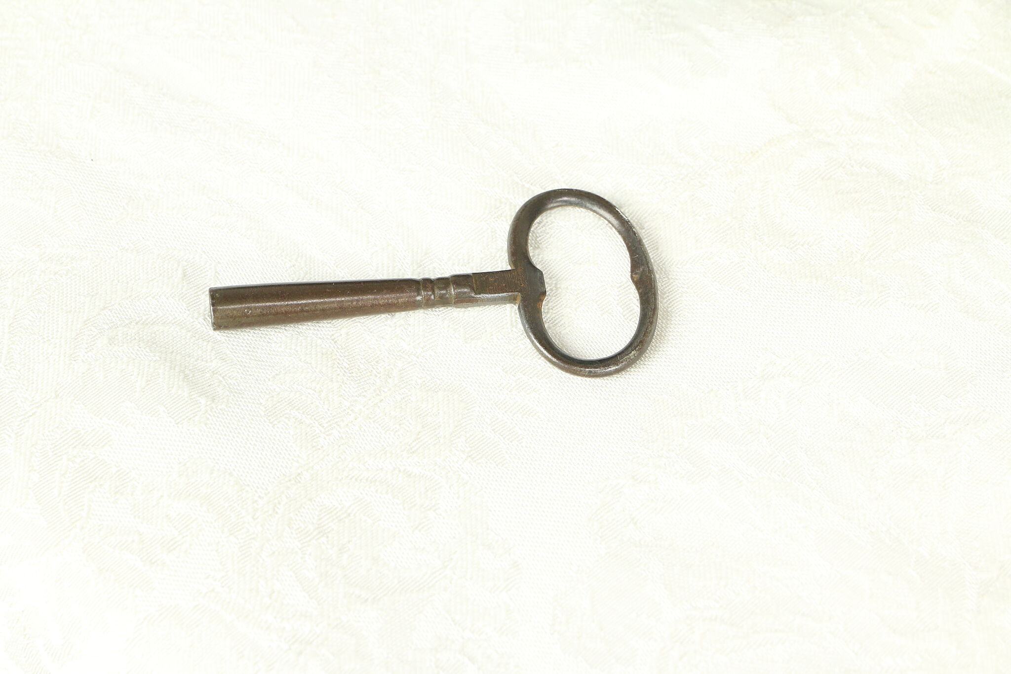 The clock keeps accurate time for a week on a winding and counts half hour and on the hour with a bell strike. A beveled and shaped glass door has a nickel frame. The nickel dial has hand painted numerals.