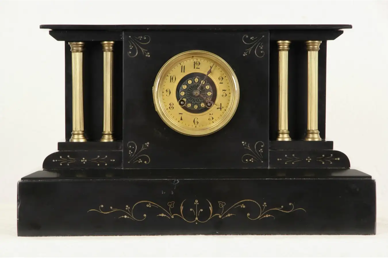 Behind a beveled glass bezel, the embossed bronze dial is especially beautiful on this antique clock. Measurements are 19" long, 6" deep and 11 1/2" tall.