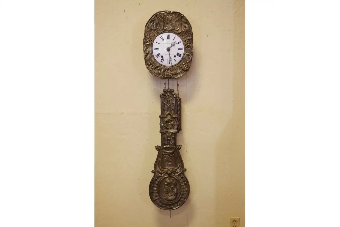 A very charming French country wall clock is a great runner, and has beautiful brass repousse dial surround and pendulum. Often called a "wag-on-the-wall, " the Morbier movement is a traditional farmhouse classic dated 1870.