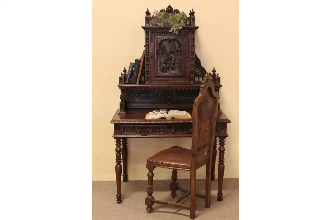 A hand-carved folk tableau shows a family wearing wooden shoes in front of their stone cottage on this exquisite solid chestnut writing desk from about 1890.