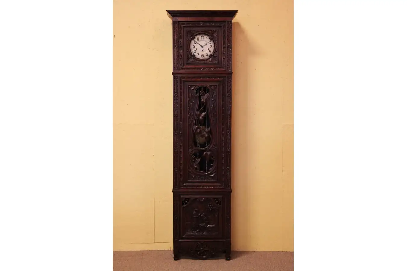 The solid chestnut case is in beautiful condition, made in Brittany or Bretagne, a maritime province of northwest France. Formerly a separate country, the "Breton" language is still spoken. Famous for their cultural traditions and distinctive dress, the local hand-carved furniture has outstanding workmanship, using native local hardwoods with picturesque traditional motifs.