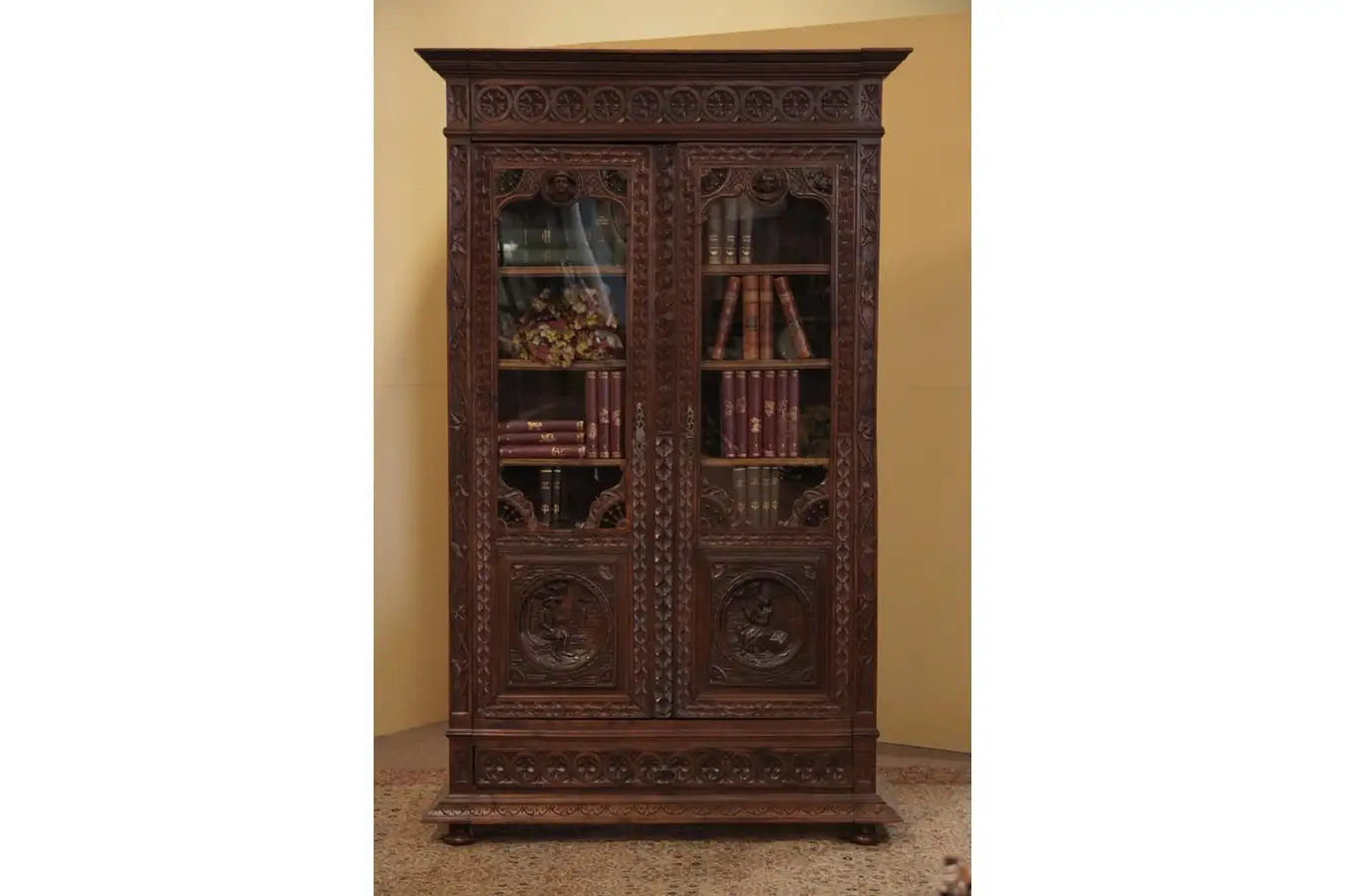 Hand-carved of solid chestnut with traditional Brittany France motifs this wonderful china cabinet has 2 glass doors.