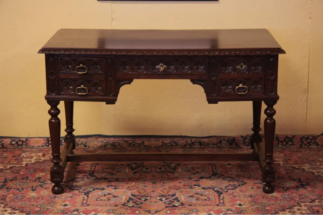 This charming writing desk was hand-carved of solid oak with folk motifs in Brittany about 1900. All sides are carved and finished, and hand dovetailed drawers have original pulls.