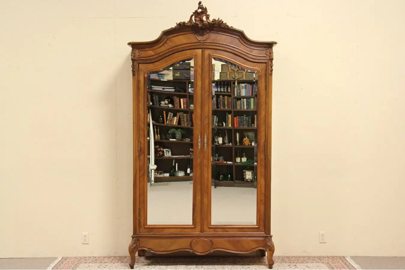 This antique furniture can be disassembled for moving. Brasses are original, and the lock and key are working. Wide beveled and shaped mirrors have a hint of "smoke" to show their age. Minor mars at the edges and shrinkage separations are as expected with age. Curved lines show superior craftsmanship and quality. For easier moving, doors lift off and this armoire can be disassembled.