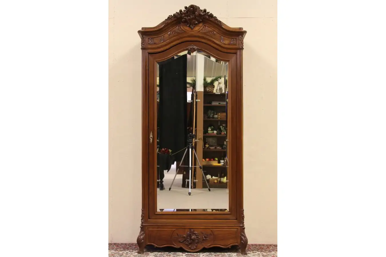 Elegant and traditional, a carved walnut 1900 era armoire from France has a shaped and beveled mirror in the door. Hand carved in high relief, the crest and details are beautiful.
